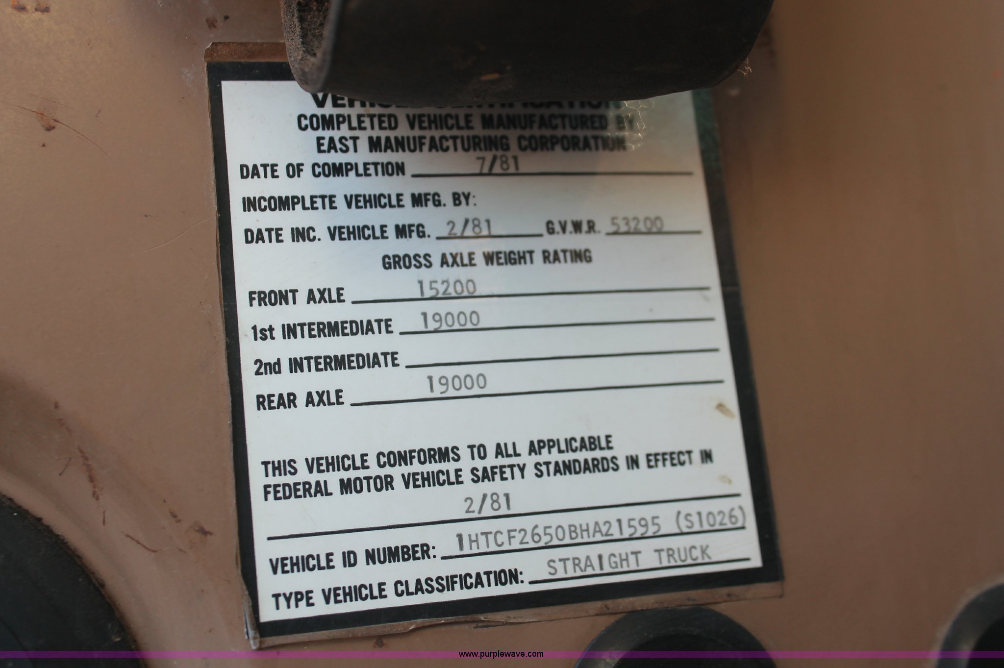 Purple Wave is selling a used Construction Dump Truck in Kansas. This item is a 1981 International S2600 tandem axle dump truck with the following: 122,870 miles on odometer, Miles may vary, Caterpillar 3208 eight cylinder diesel engine, 210 HP, Automatic transmission, Twin screw, Heat, AM/FM/cassette, Air brakes, Spring suspension, Dual 85 gallon fuel tanks, PTO, Single lift ram, GVWR 53,200 lbs, FAWR 15,200 lbs, IAWR 19,000 lbs, RAWR 19,000 lbs, 202" wheelbase, 305/65R22.5 front tires, 295/75R22.5 rear tires