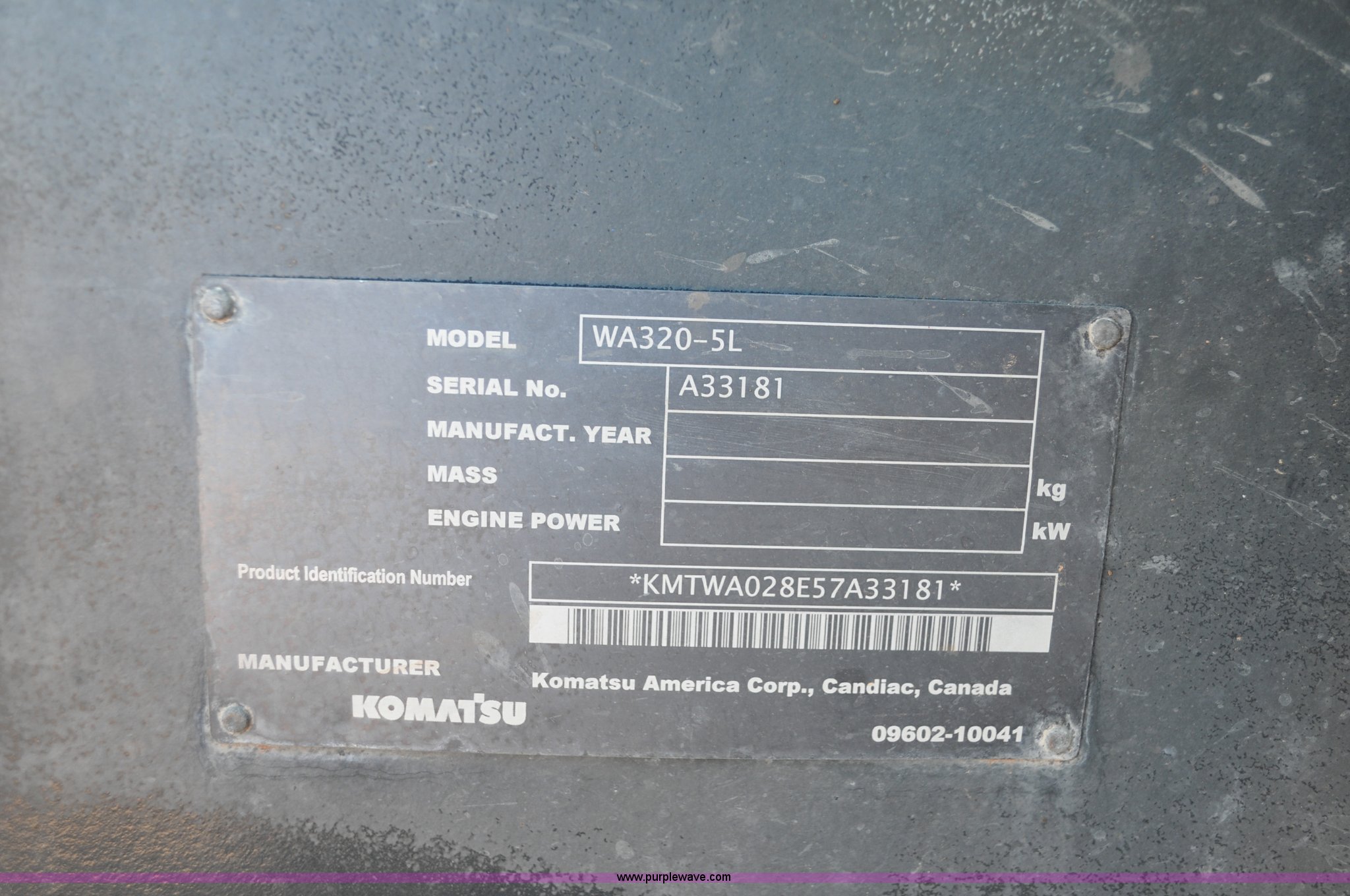 Purple Wave is selling a used Wheel Loader in South Dakota. This item is a 2007 Komatsu WA320-5L wheel loader with the following: 1,542 hours on meter, Komatsu six cylinder turbo diesel engine, Model SAA6D102E-2-A, 166 HP, Serial 46717026, Four speed hydrostatic transmission, Enclosed cab, AC and heat, AM/FM/cassette, Joystick loader control, Air ride seat, Variable shift control, Traction control, Third function, Front work lights, 106" JRB bucket, Bolt-on edge, JRB Quick Tach with hydraulic release, 20.5x25 tires, KOMTRAX - Komatsu Machine Tracking System, Serial KMTWA028E57A33181