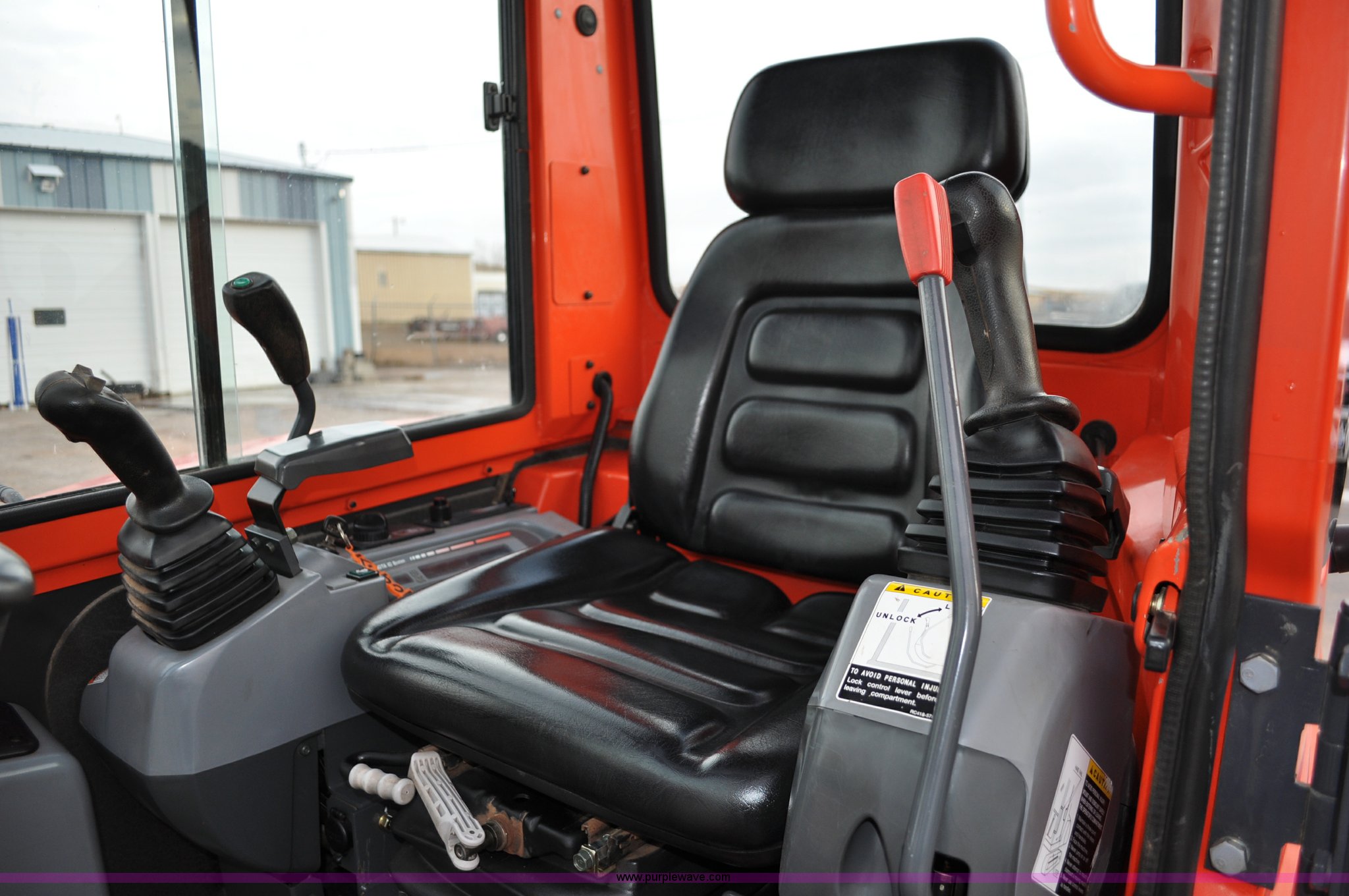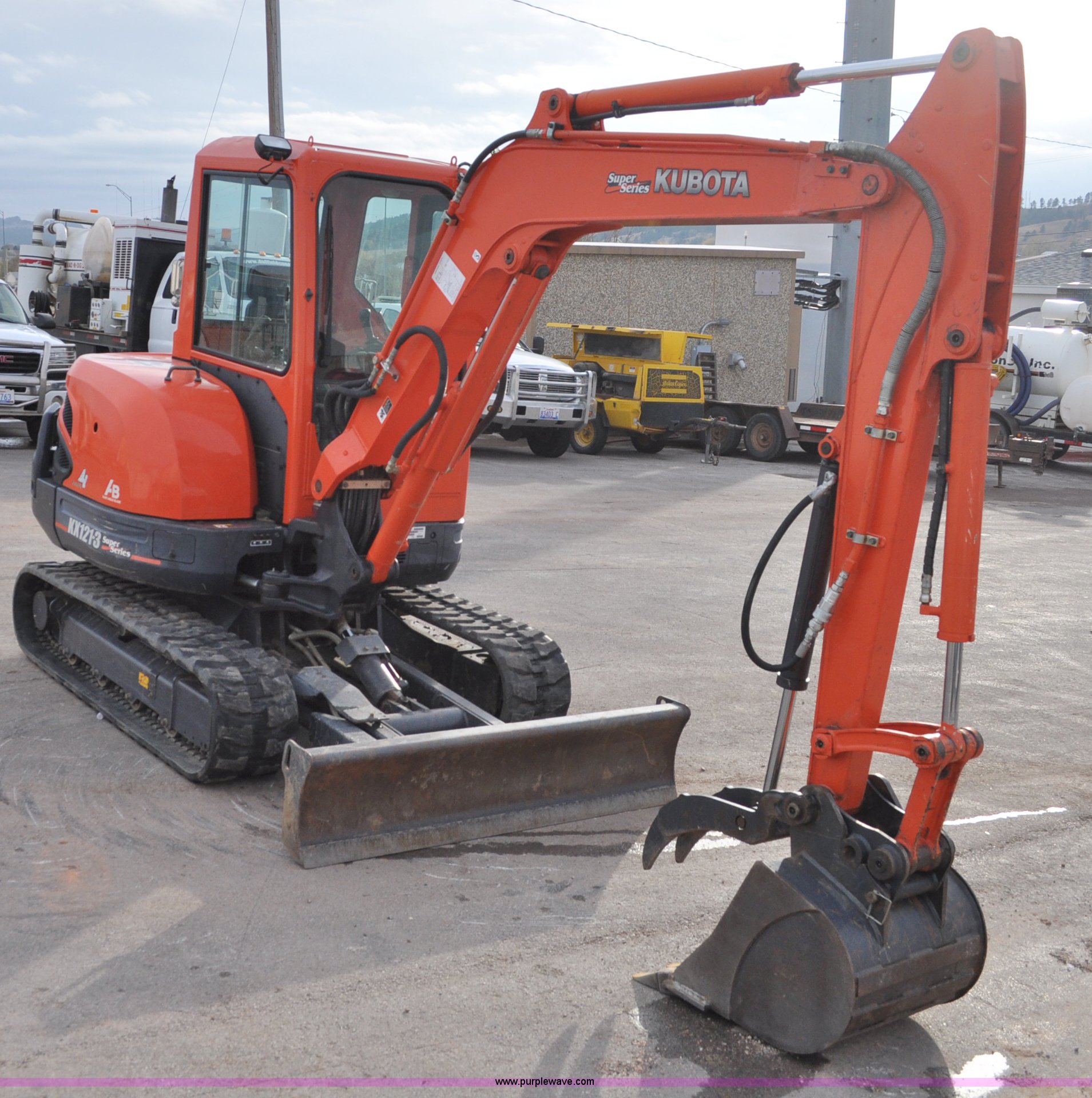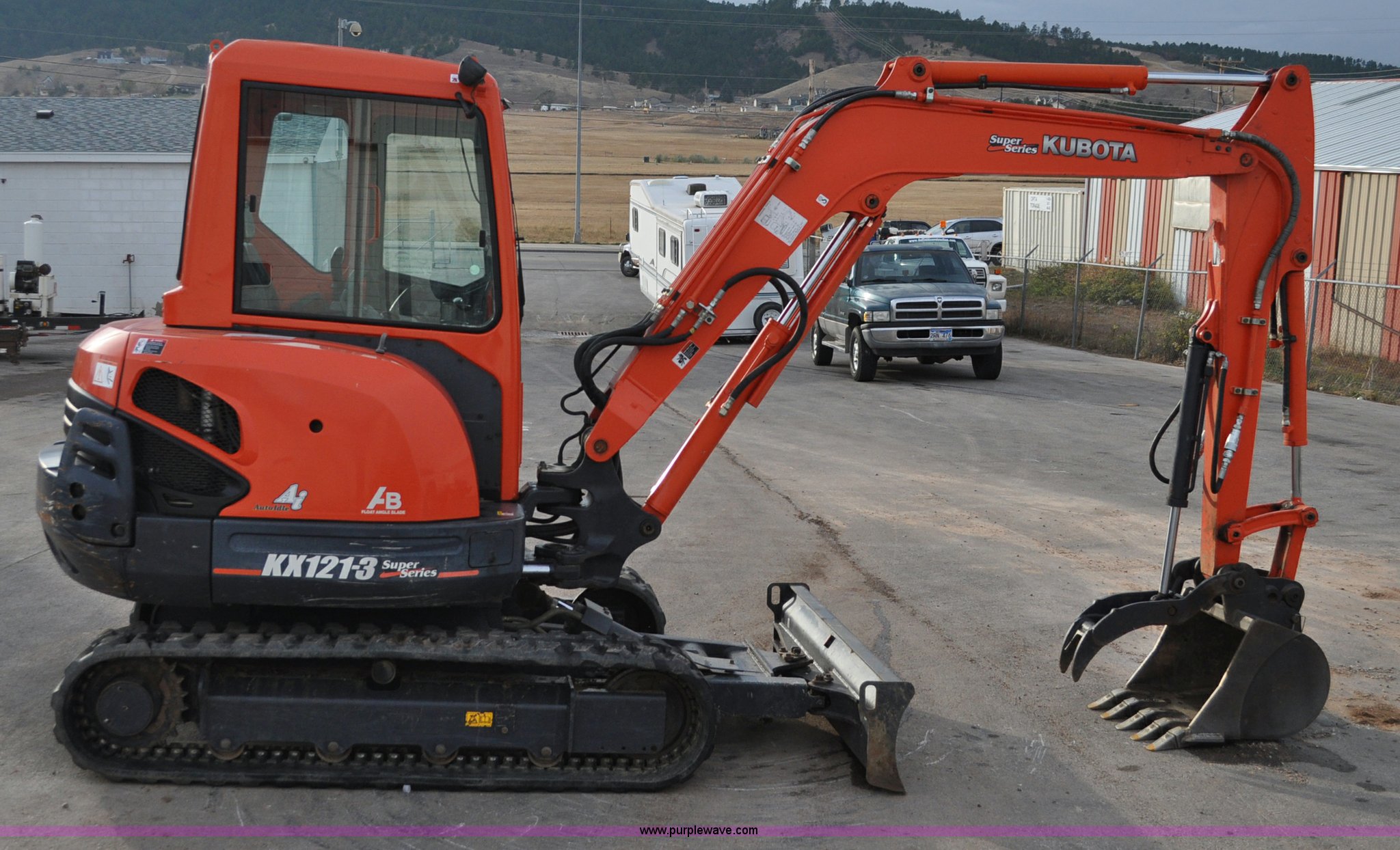 Purple Wave is selling a used Mini Excavator in South Dakota. This item is a 2009 Kubota KX121-3SS mini excavator with the following: 819 hours on meter, Super Series, Kubota 2.2L diesel engine, Model V2203-M-ES02, 42 HP, Enclosed cab, AC and heat climate control, Suspension seat, Front work lights, Auto idle, 24" five tooth bucket, Hydraulic thumb, 63" stick, 67" blade with hydraulic angle, Float angle blade, 13.5" tracks, Four bottom rollers, Serial JKUK1213H01H35314