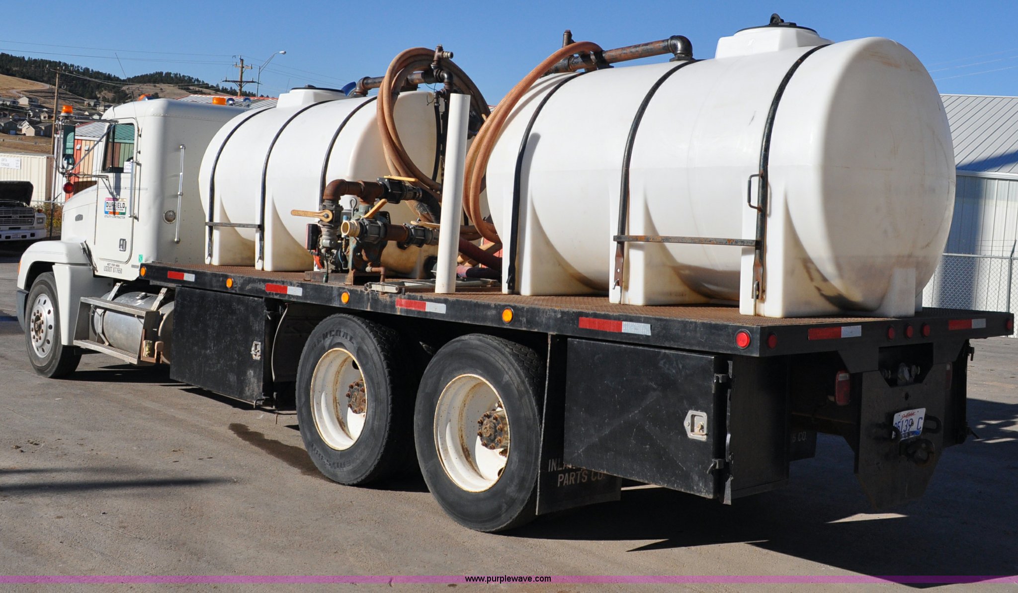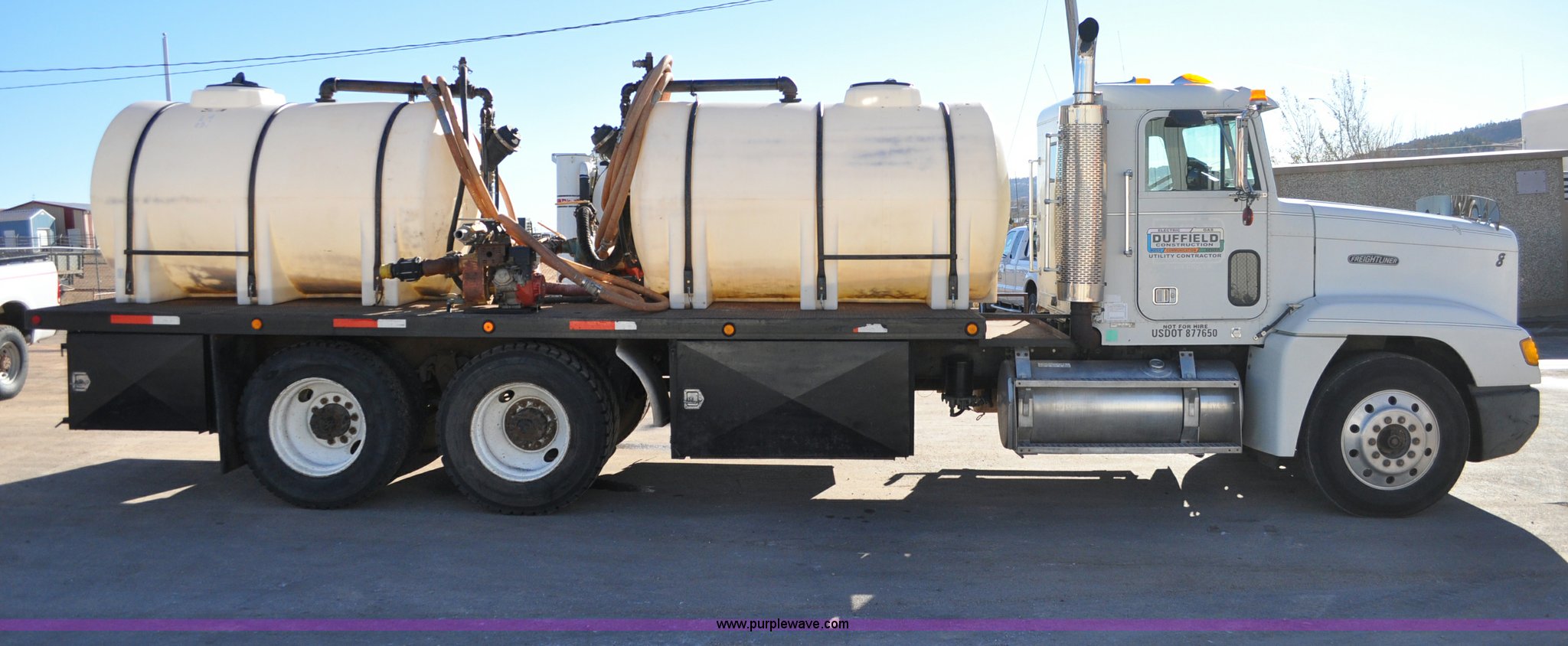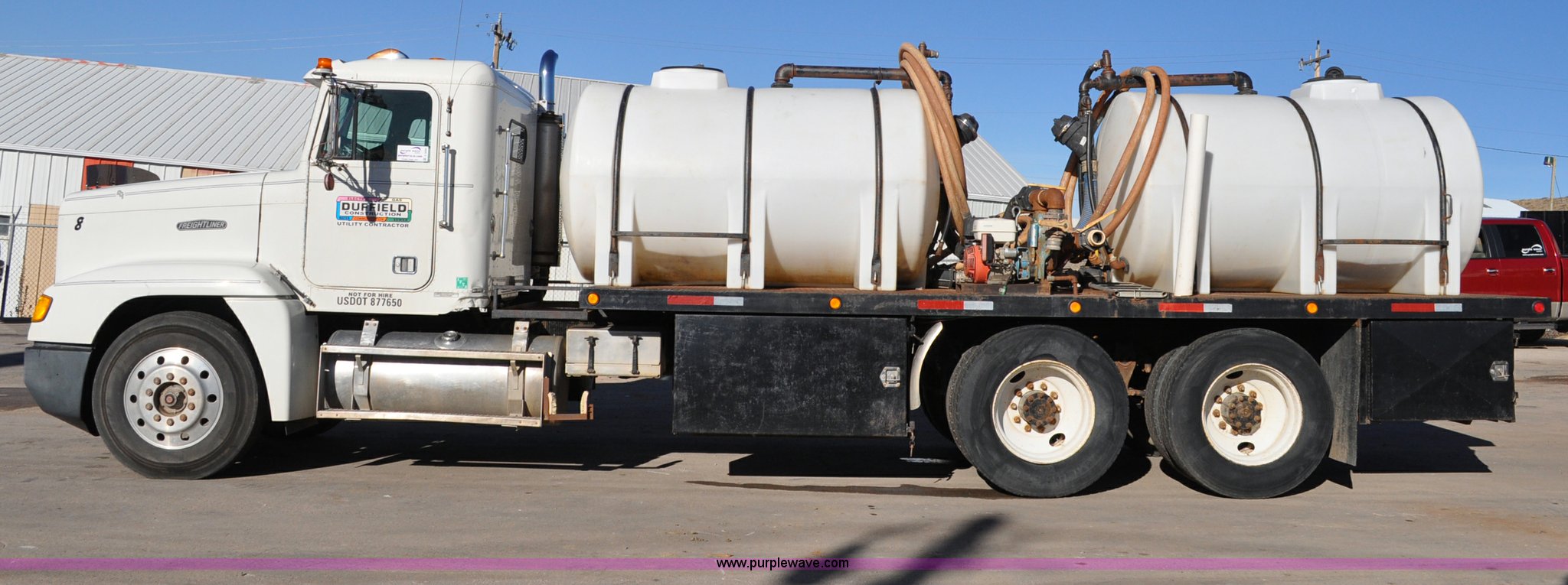 Purple Wave is selling a used Vacuum Truck in South Dakota. This item is a 1989 Freightliner FLD boring support truck with the following: 1,008,204 miles on odometer, Cummins N14 14L L6 diesel engine, Eaton Fuller Road Ranger ten speed manual transmission, Twin screw, AM/FM/cassette, Air suspension seat, Engine brake, Block heater, Dual 100 gallon fuel tanks, 20'L x 101"W flat bed, (2) 1,000 gallon water tanks, MP 32039 pump, Serial 01A2252, 3" inlet and outlet, Honda GX390 13 HP gas engine, Monarch 8BSGF-12H type B pump, Serial 0200, 3" inlet and outlet, Honda GX270 9 HP gas engine, (2) 56"W x 27"D x 28"H toolboxes, (2) 36"W x 24"D x 25"H toolboxes, Pintle hitch, Air and electric trailer connections, 11R24.5 tires
