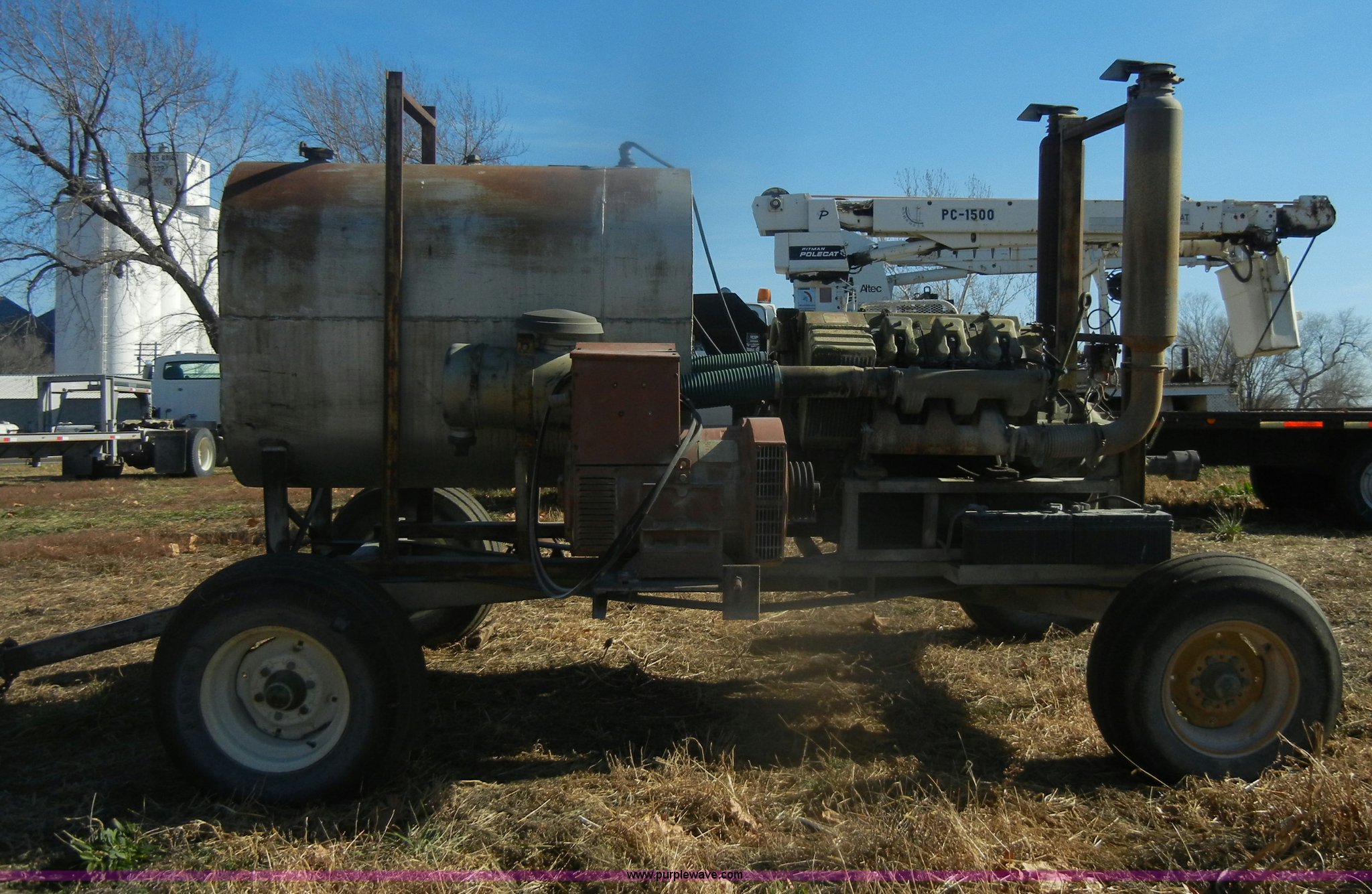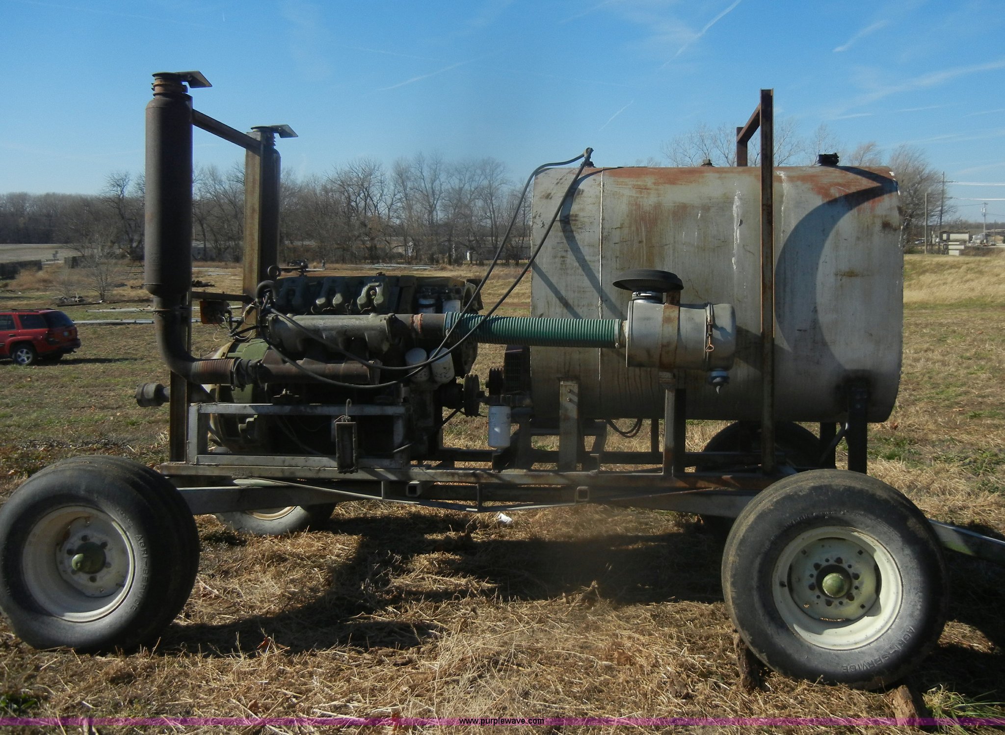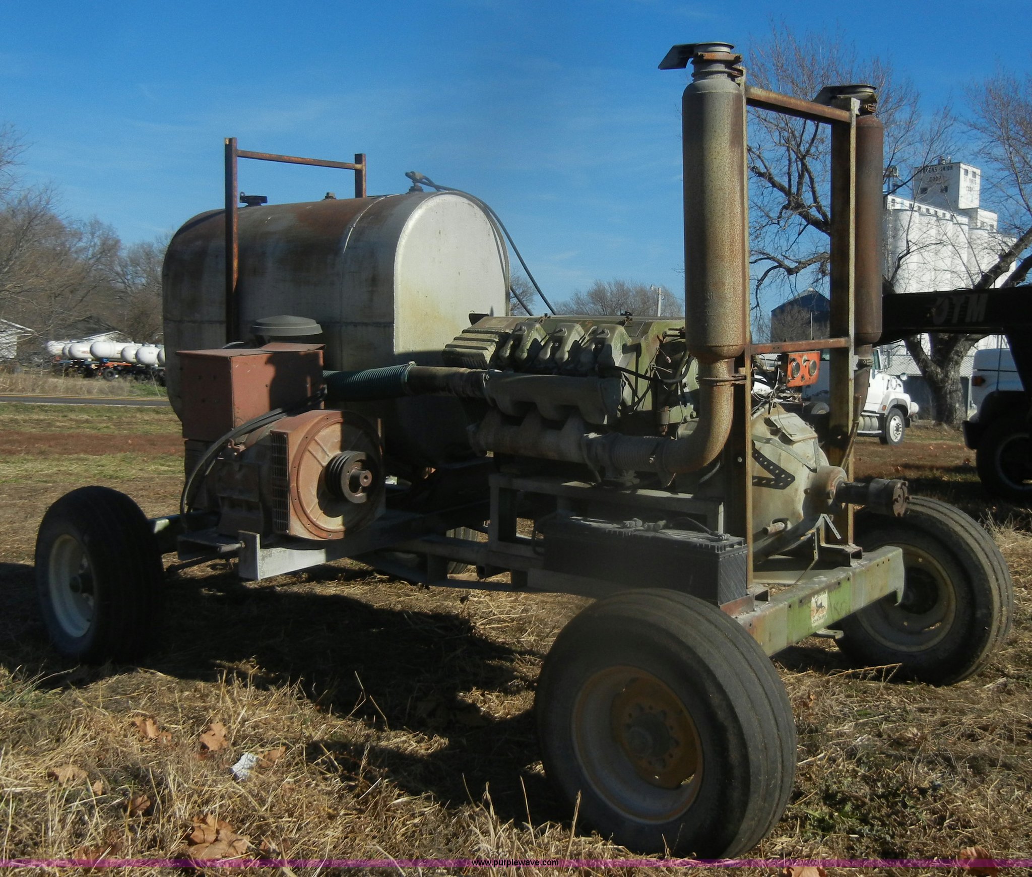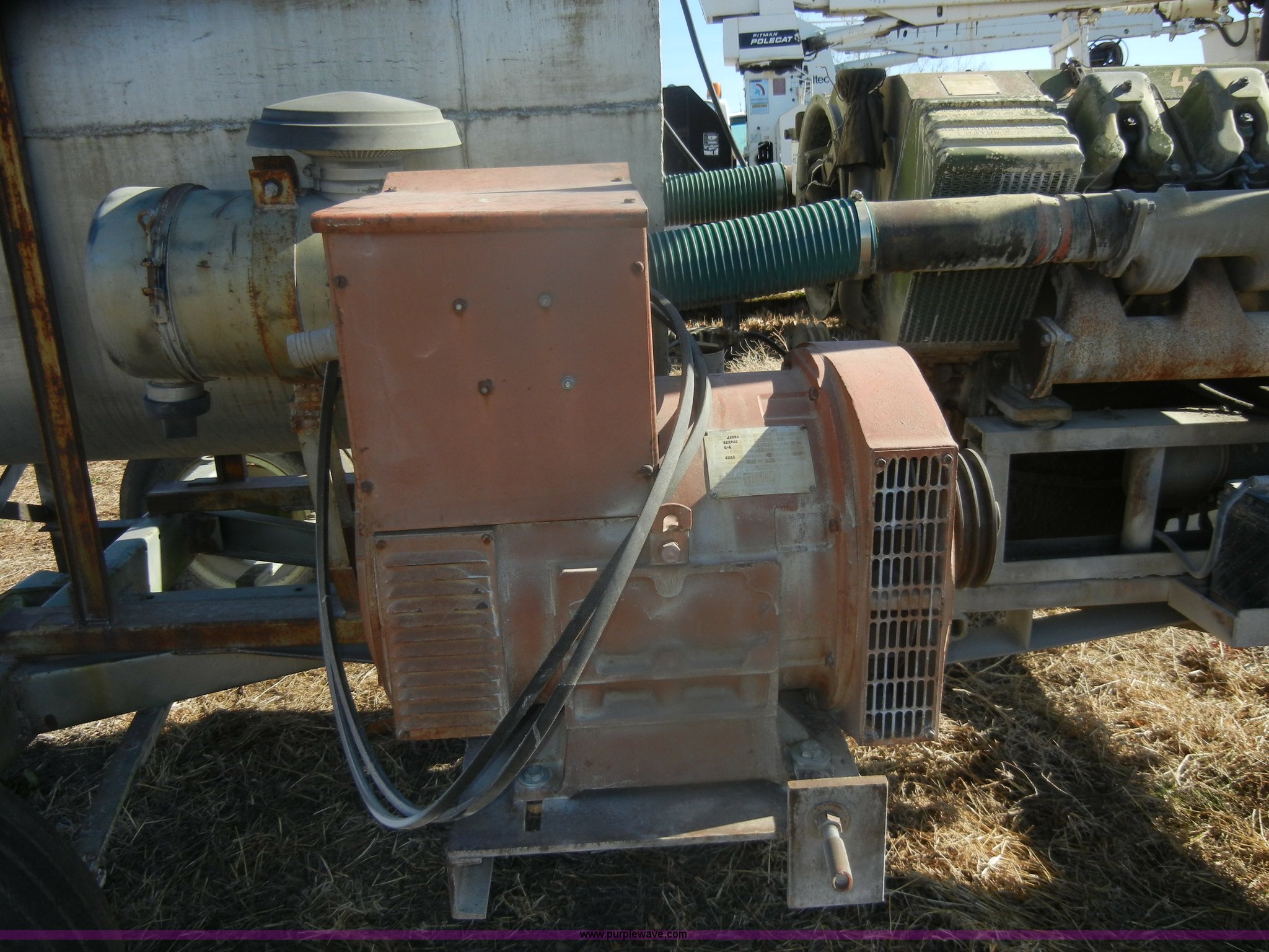 Left handed gear head unit for irrigation systems. Sigma 180 HP diesel engine 2,300 RPM, Type 9306, Number 60665, Stamford 30 KW generator 1,800 RPM, Three phase, Serial J5150, Pin hitch, 5' x 27" x 44" water tank, 11L-15 tires. Shipping quotes available. 717 Bertrand. St. Marys, KS 66536