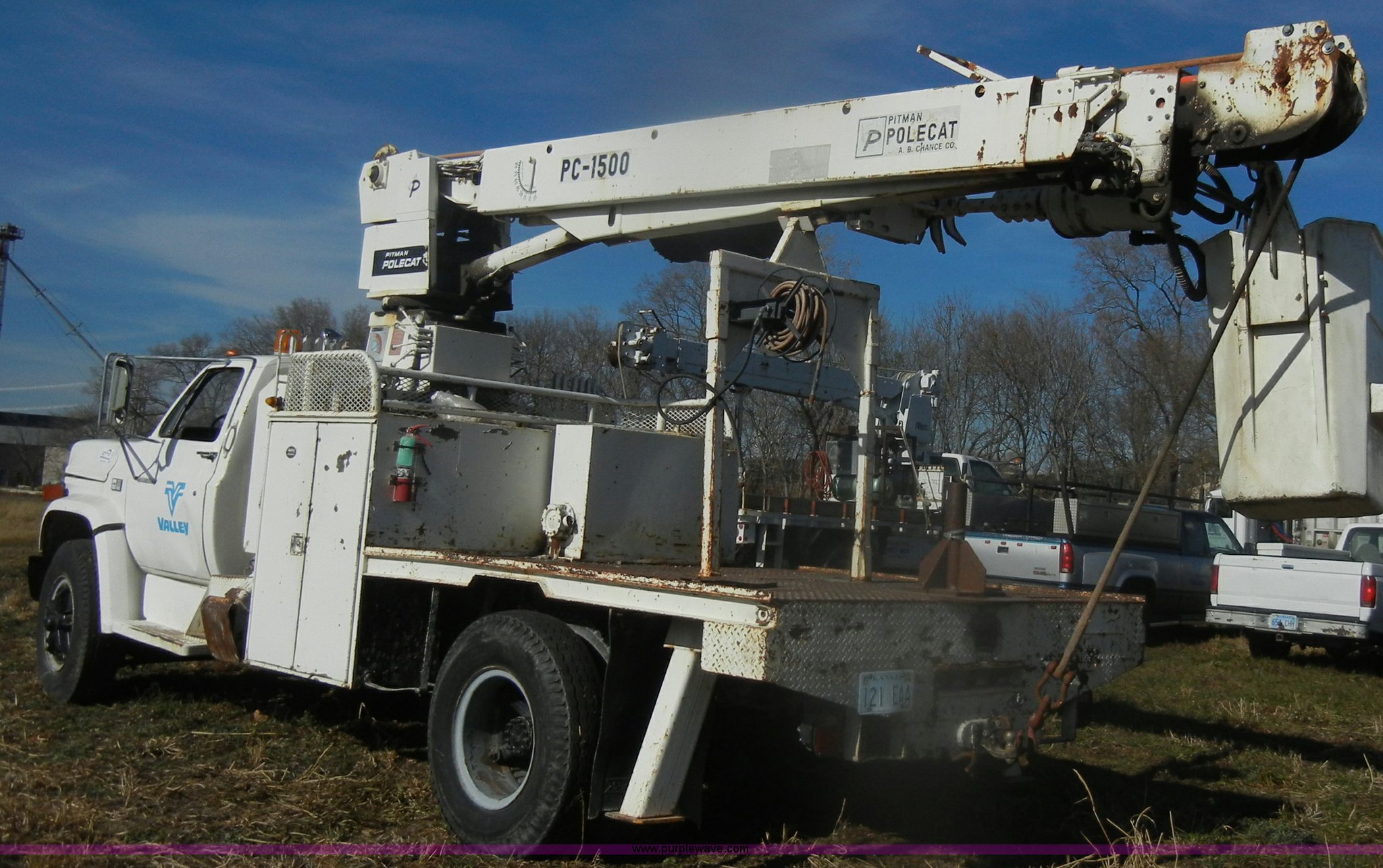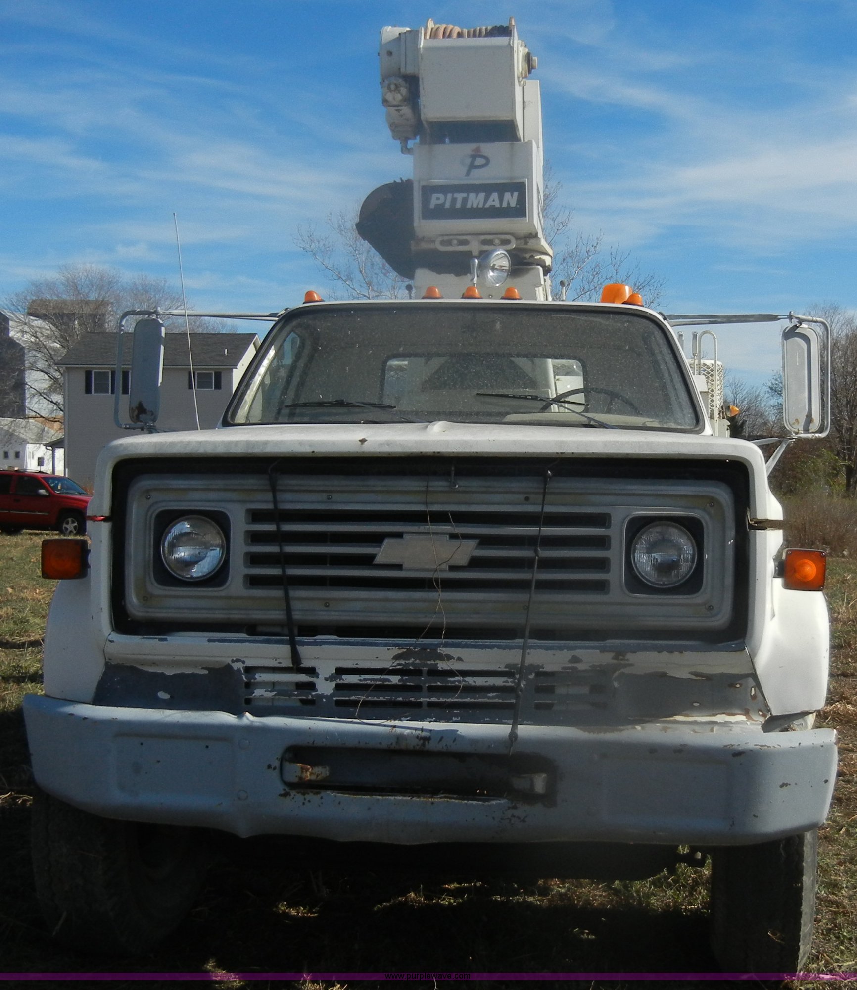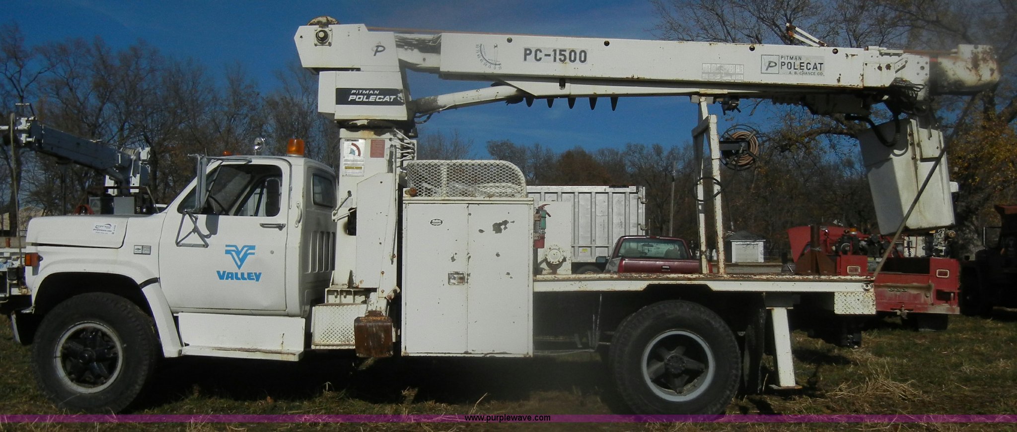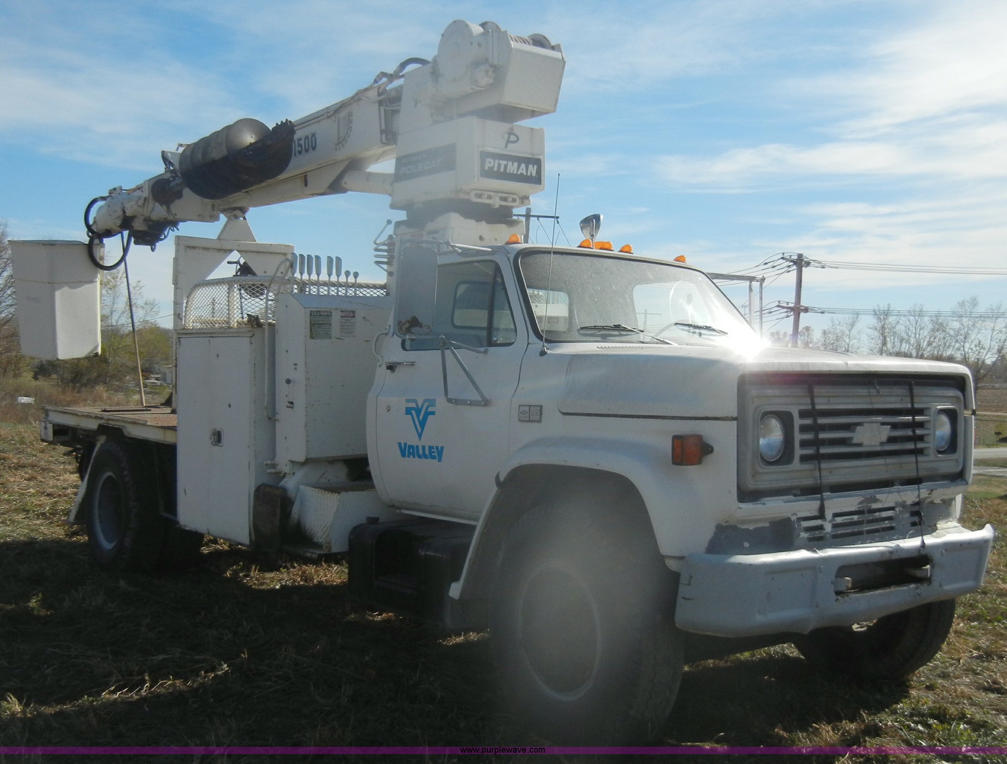 Purple Wave is selling a used Crane Truck in Kansas. This item is a 1983 Chevrolet Kodiak C70 Pitman Polecat flatbed truck with the following: 56,180 miles on odometer, 1,955 hours on meter, 6.0L V8 gas engine, Five speed manual transmission, Hi-Lo, Heat, AM/FM/cassette, Manual windows and locks, Vinyl interior, 9' x 93.5" flatbed, Muncie PTO, Mico Dualock, Front and rear stabilizers, Front tow hooks, 50 gallon fuel tank, Pitman Polecat PC1500, Model PC-1545BBMQS, Serial 18150183ADVP, 4' to 35' boom load radius, 15,000 to 1,600 lb boom load capacity, 4' to 35' boom and digger load radius, 14,200 to 1,300 lb boom and digger load capacity, Thru and Thru storage box, Rear hydraulics, Pintle hitch, Trailer wiring, 6' x 18" auger bit, 10.00-20 tires, GVWR 28,000 lbs, FAWR 9,000 lbs, RAWR 19,000 lbs, Interior/exterior cosmetic damage, Cracked dash, Hood will not stay latched