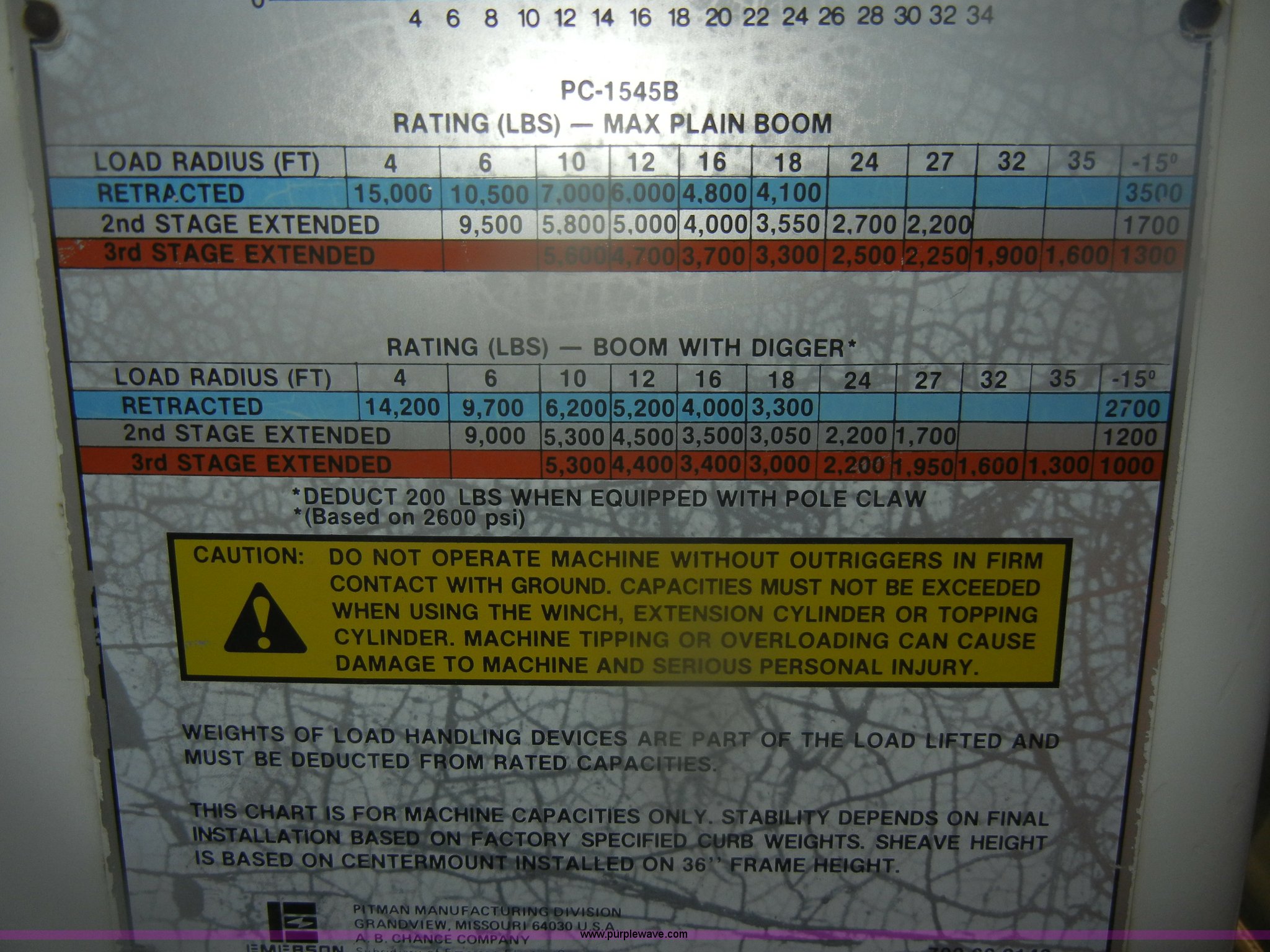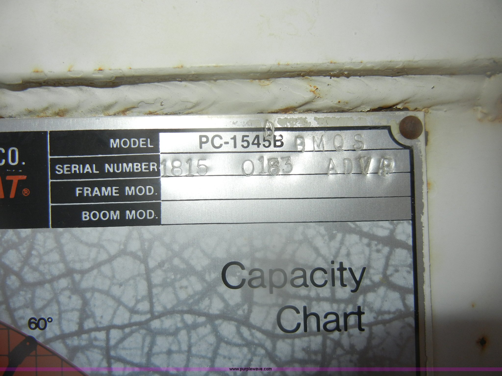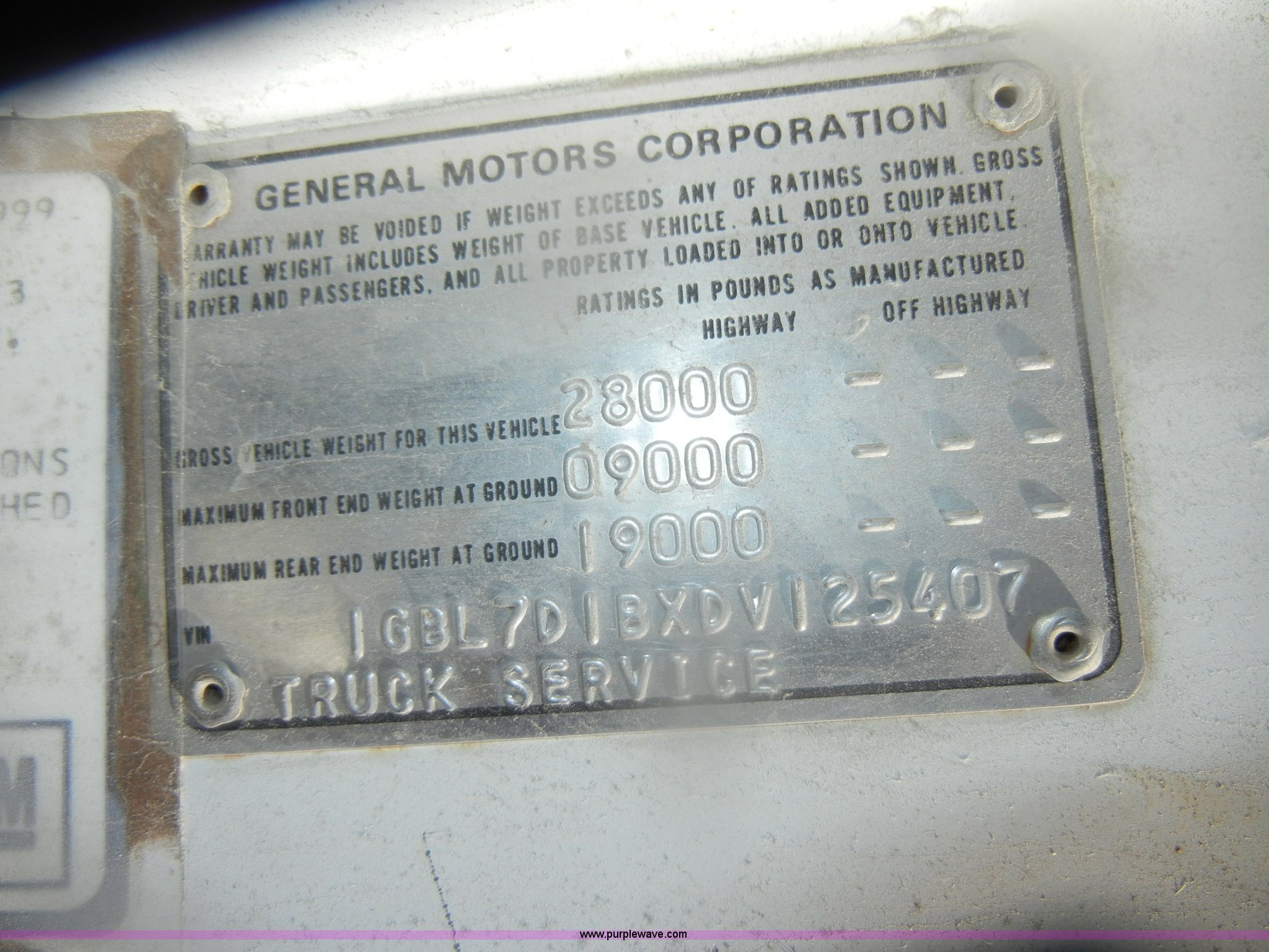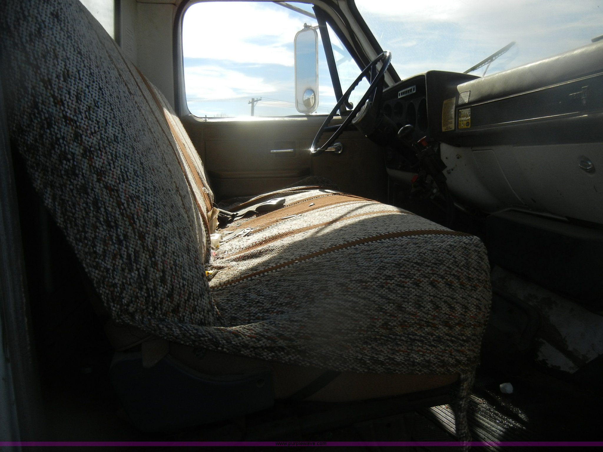 Purple Wave is selling a used Crane Truck in Kansas. This item is a 1983 Chevrolet Kodiak C70 Pitman Polecat flatbed truck with the following: 56,180 miles on odometer, 1,955 hours on meter, 6.0L V8 gas engine, Five speed manual transmission, Hi-Lo, Heat, AM/FM/cassette, Manual windows and locks, Vinyl interior, 9' x 93.5" flatbed, Muncie PTO, Mico Dualock, Front and rear stabilizers, Front tow hooks, 50 gallon fuel tank, Pitman Polecat PC1500, Model PC-1545BBMQS, Serial 18150183ADVP, 4' to 35' boom load radius, 15,000 to 1,600 lb boom load capacity, 4' to 35' boom and digger load radius, 14,200 to 1,300 lb boom and digger load capacity, Thru and Thru storage box, Rear hydraulics, Pintle hitch, Trailer wiring, 6' x 18" auger bit, 10.00-20 tires, GVWR 28,000 lbs, FAWR 9,000 lbs, RAWR 19,000 lbs, Interior/exterior cosmetic damage, Cracked dash, Hood will not stay latched