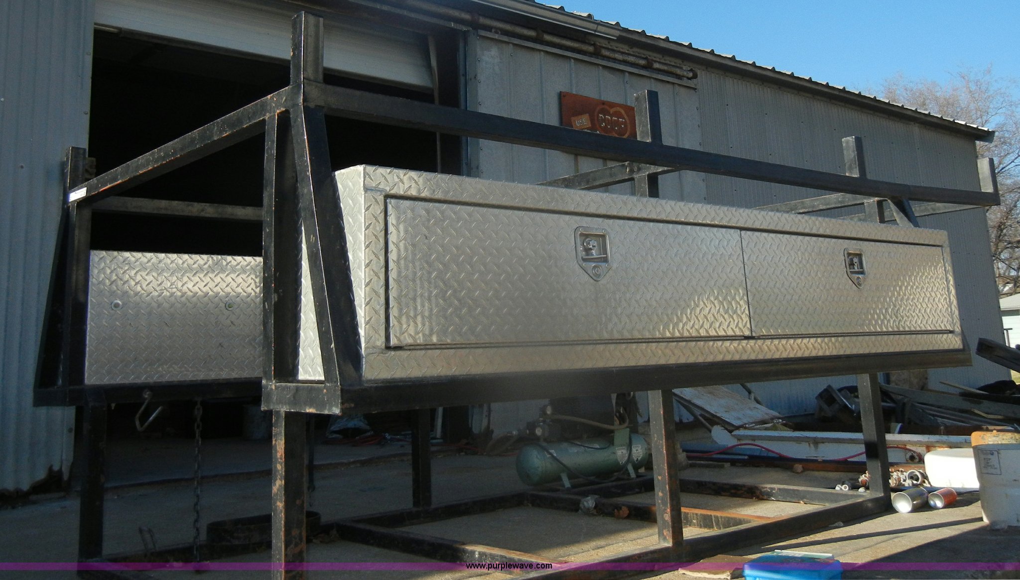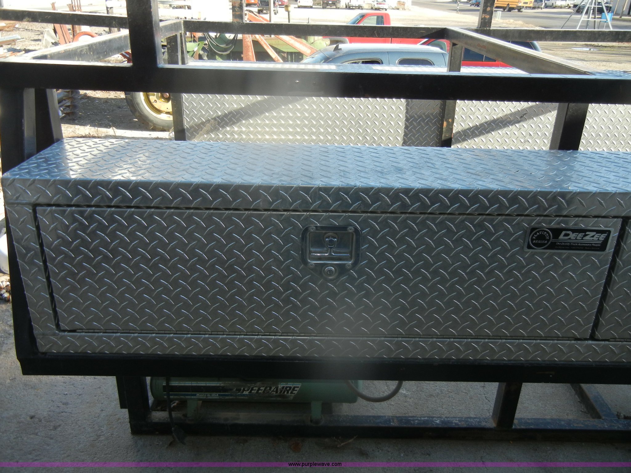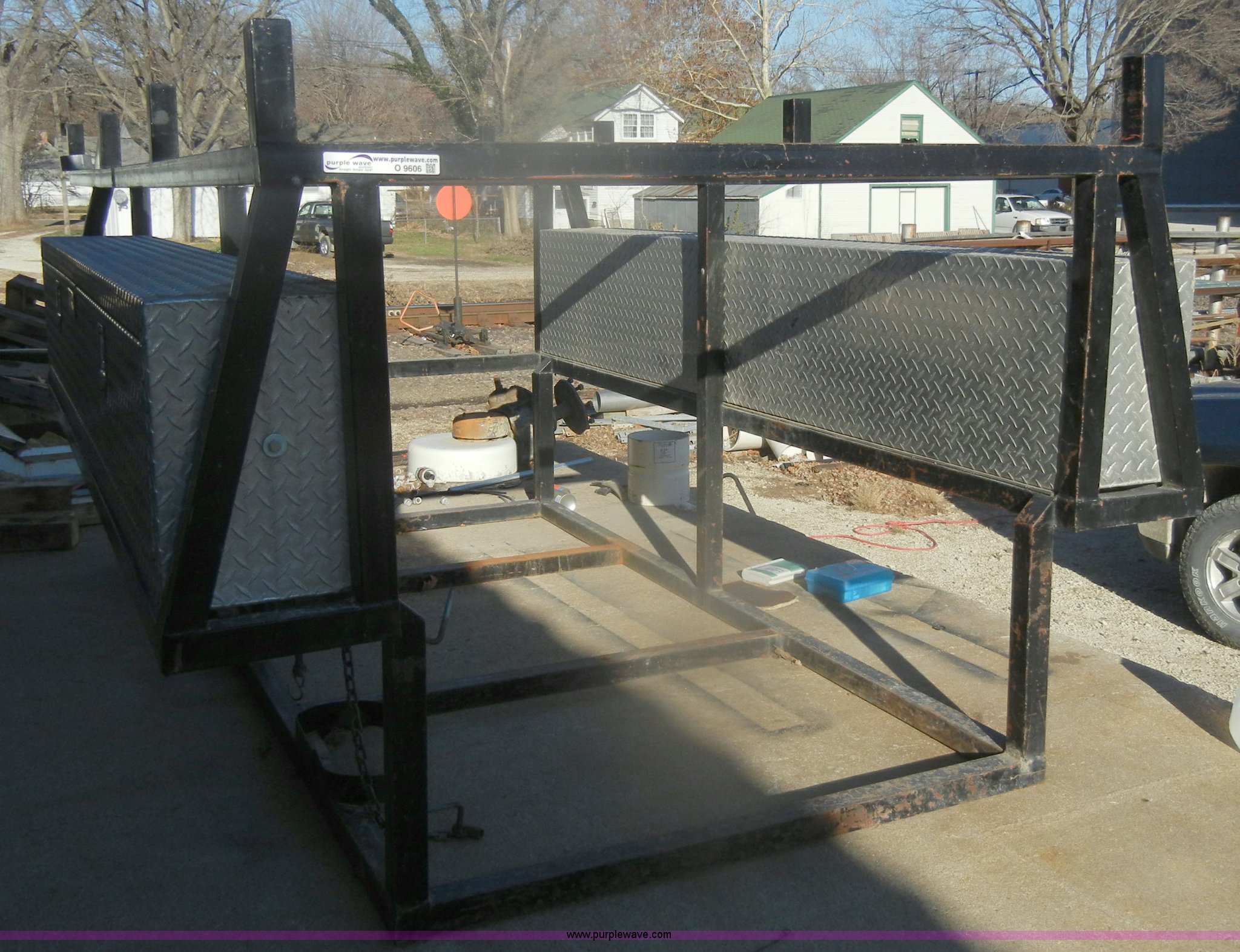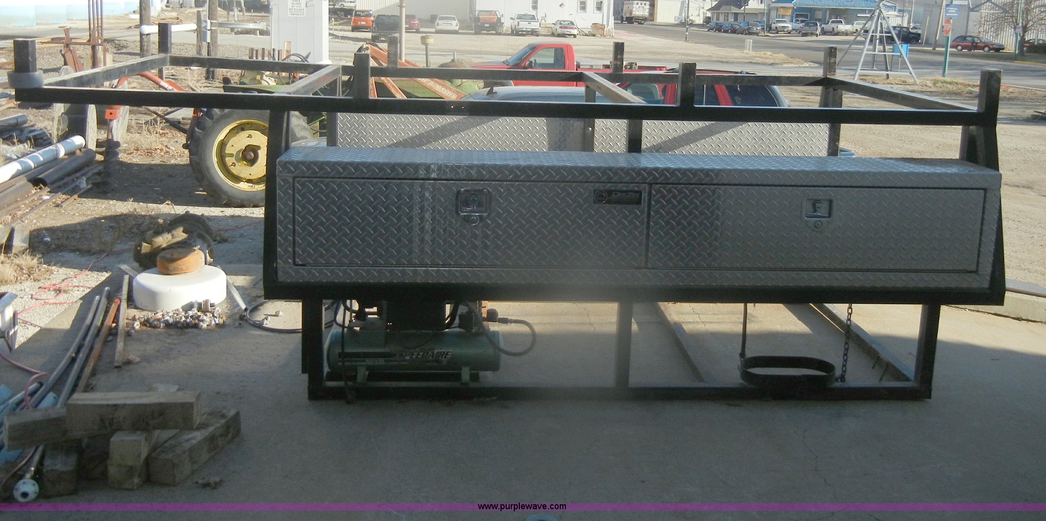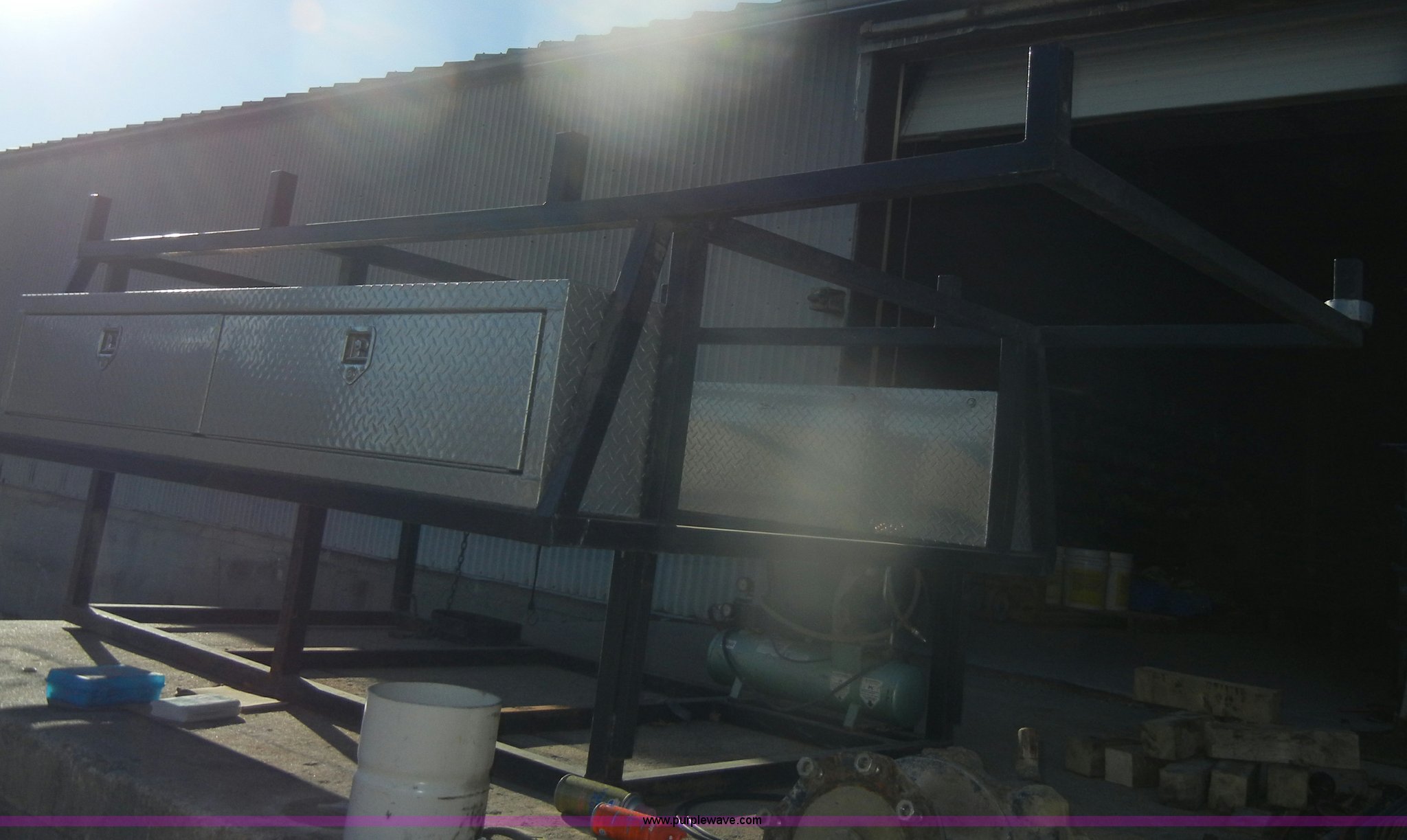 Slide-in pickup truck headache rack. 100" x 44" I.D., 11' x 6' x 51.5" O.D., DeeZee side toolboxes, Speed Aire mini air compressor included. Shipping quotes available. 717 Bertrand. St. Marys, KS 66536
