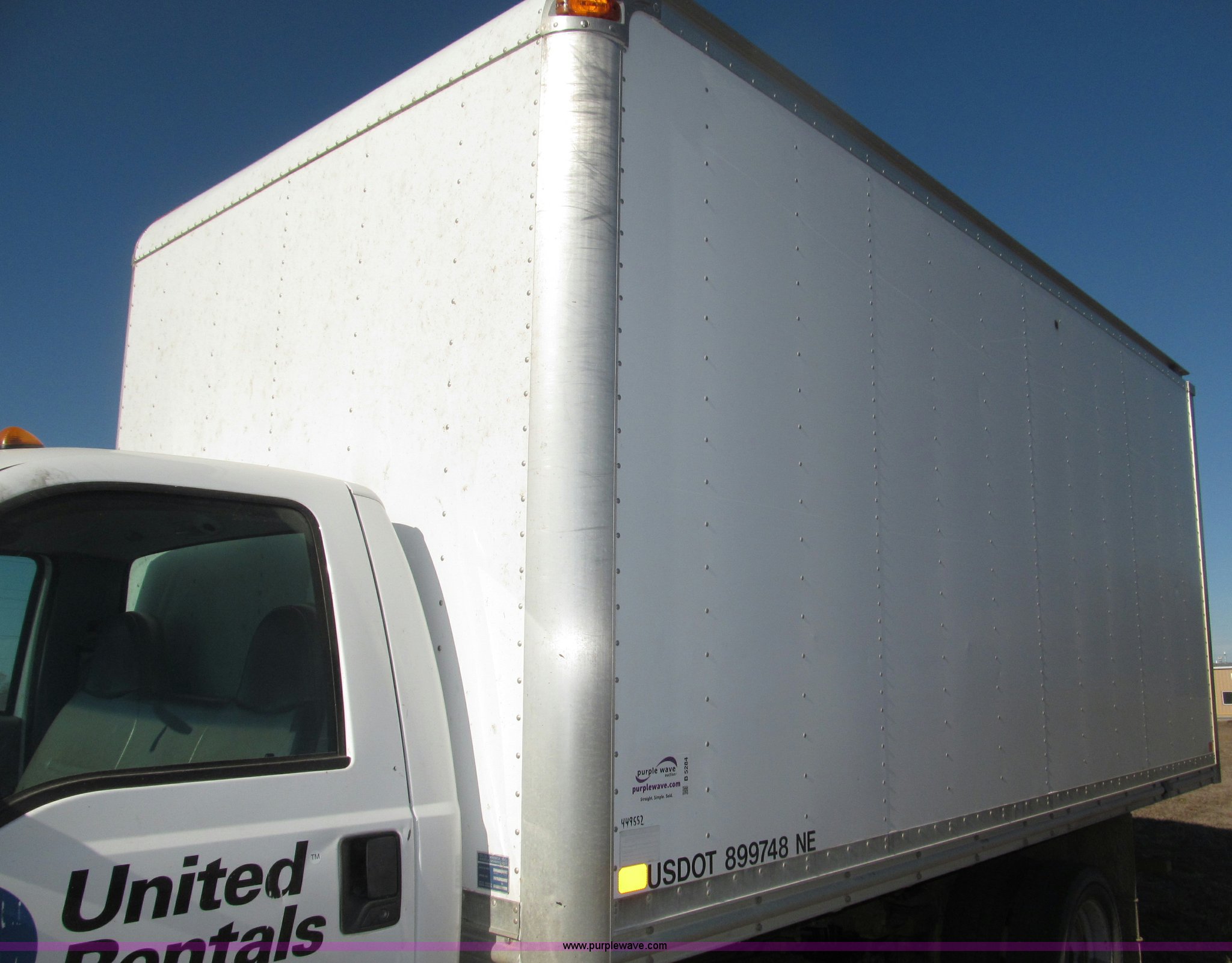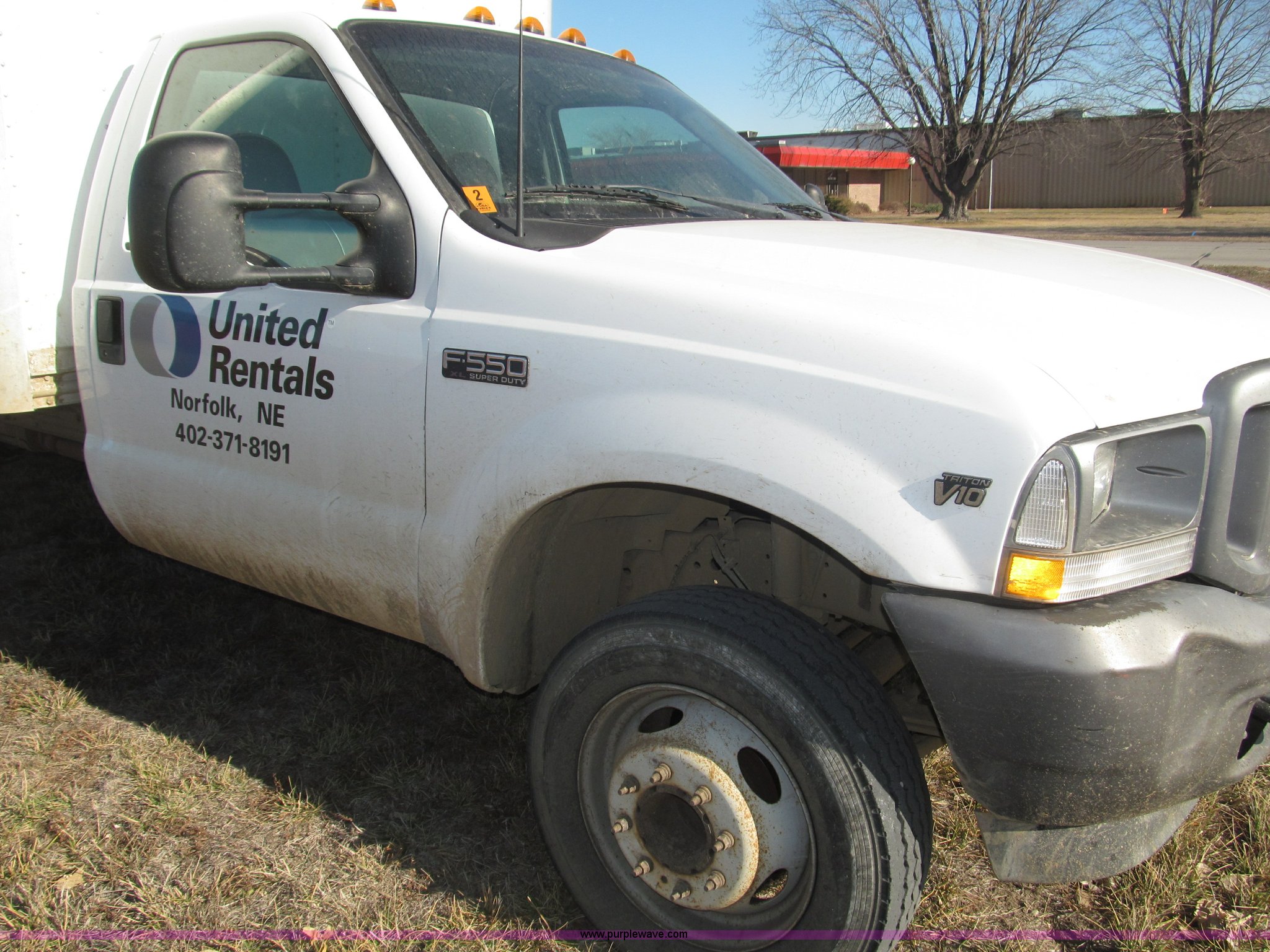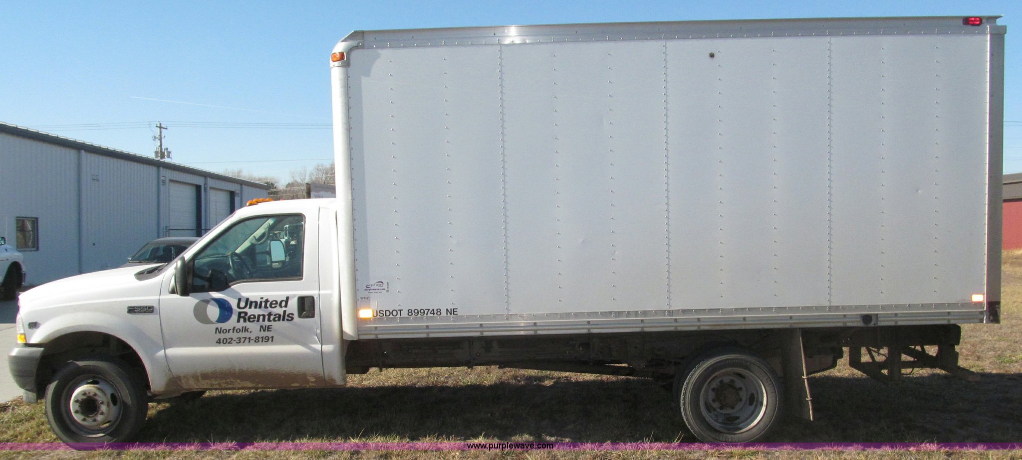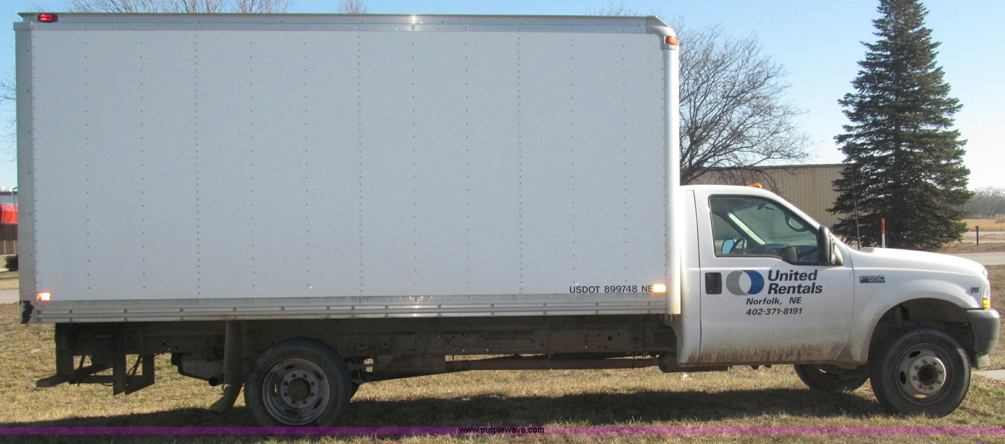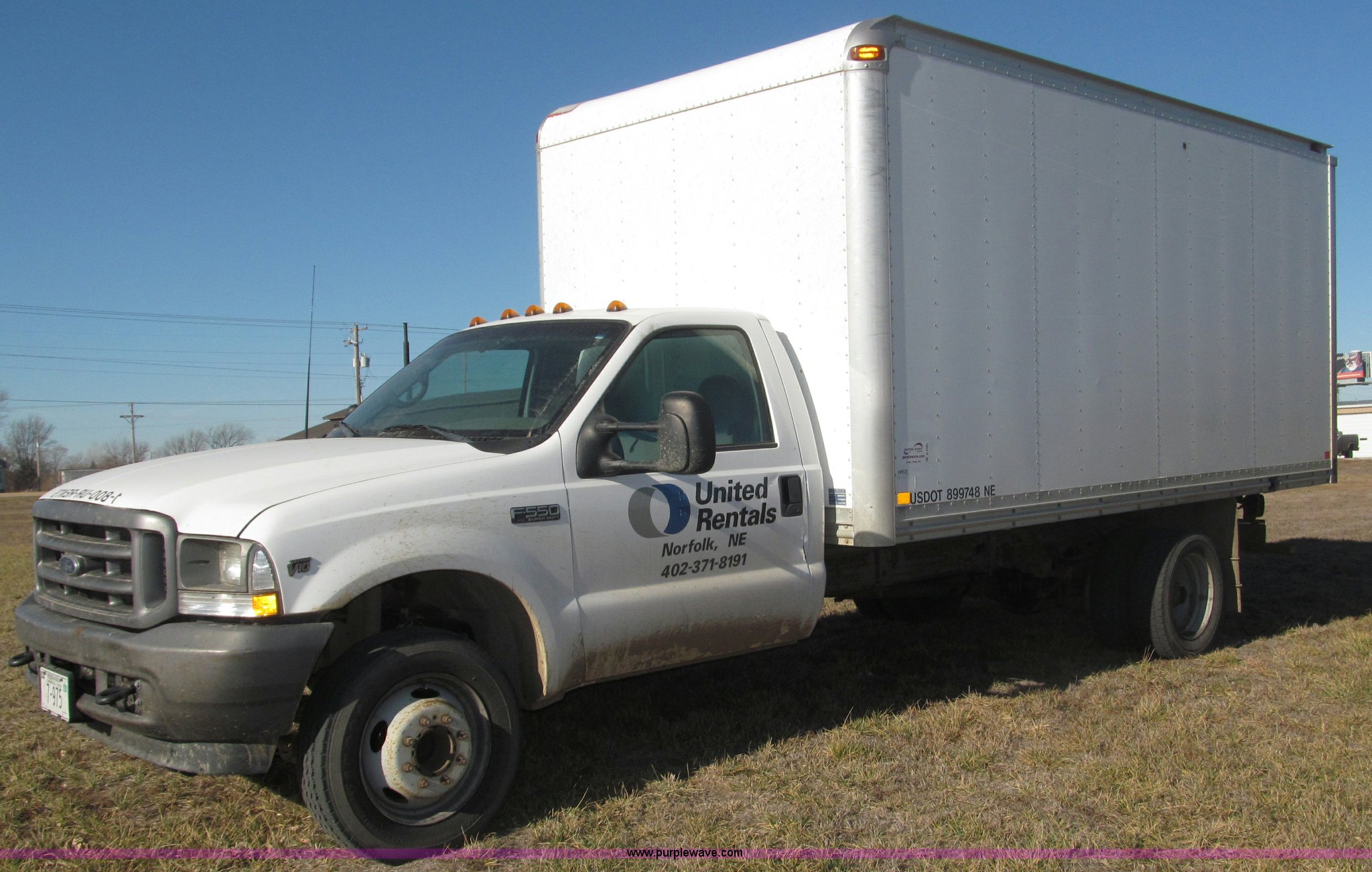 Purple Wave is selling a used Box Truck in Nebraska. This item is a 2002 Ford F550 XL Super Duty box truck with the following: 129,462 miles on odometer, Miles may vary, Triton 6.8L V10 gas engine, Automatic transmission, AC and heat, AM/FM/cassette, Manual windows and locks, Vinyl interior, Delta-Waseca QX85-16 box, 16'L x 92"W x 86.5"H I.D., Serial 94746, 12V DC power adapter, Diamond rear roll-up door, Serial 63618, Emtek aluminum loading ramp, 1,300 lb capacity, 14'L x 24 3/8" I.D., Serial 14-009944, Spring suspension, Backup alarm, Clearance lights, Front tow hooks, 2" receiver hitch, Mud flaps, 201" wheelbase, Firestone 225/70R19.5 12PR front tires, Continental 225/70R19.5 rear tires, GVWR 17,5000 lbs, FAWR 5,600 lbs, RAWR 13,500 lbs, Rear end differential replaced in November 2012, Annual inspection completed April 2011, Interior/exterior cosmetic damage, Bumper rust, Front bumper dented, Contents not included, EIN 449552