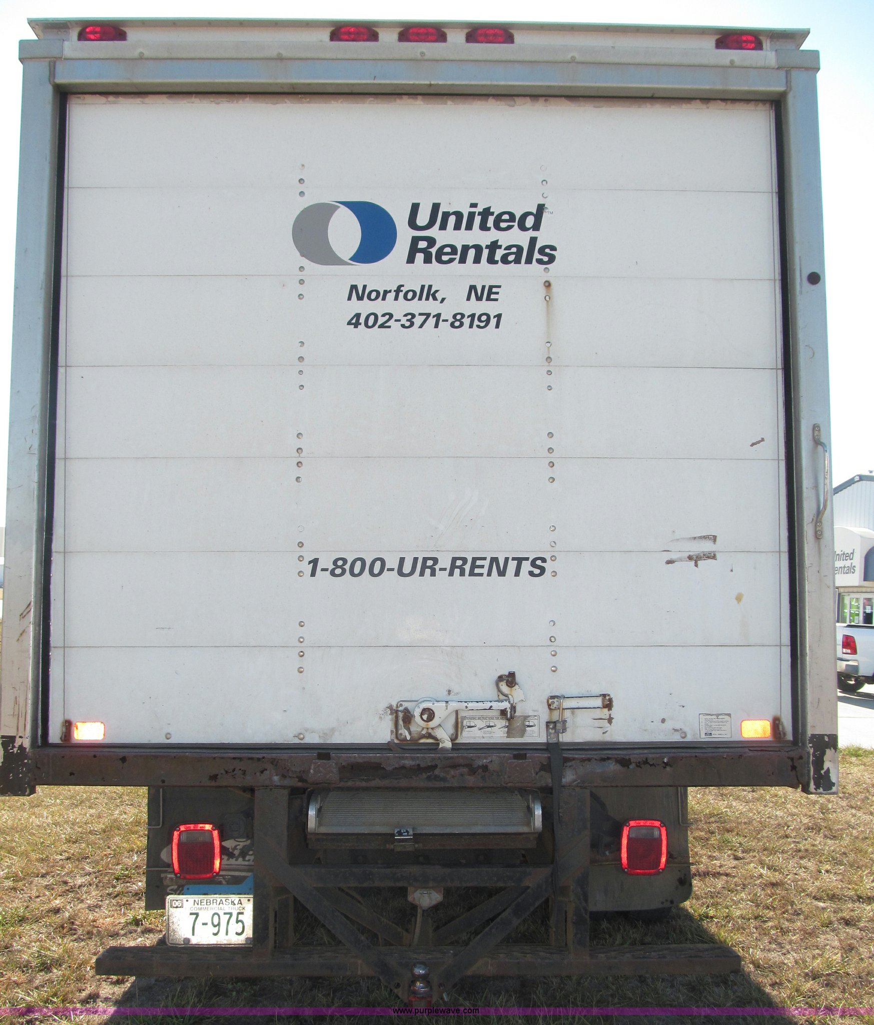 2002 Ford F550 XL Super Duty box truck. 129,462 miles on odometer Miles may vary, Triton 6.8L V10 gas engine, Automatic transmission, AC and heat, AM/FM/cassette, Manual windows and locks, Vinyl interior, Delta-Waseca QX85-16 box 16'L x 92"W x 86.5"H I.D., Serial 94746, 12V DC power adapter, Diamond rear roll-up door Serial 63618, Emtek aluminum loading ramp 1,300 lb capacity, 14'L x 24 3/8" I.D. Serial 14-009944, Spring suspension, Backup alarm, Clearance lights, Front tow hooks, 2" receiver hitch, Mud flaps, 201" wheelbase, Firestone 225/70R19.5 12PR front tires, Continental 225/70R19.5 rear tires, GVWR 17,5000 lbs, FAWR 5,600 lbs, RAWR 13,500 lbs, Rear end differential replaced in November 2012, Annual inspection completed April 2011, Interior/exterior cosmetic damage, Bumper rust, Front bumper dented, Contents not included, EIN 449552. Title distribution may be delayed up to 30 days from verification of funds. 1FDAF56S12ED71694. Shipping quotes available. United Rentals - Norfolk. 2303 Riverside Blvd. Norfolk, NE 68701