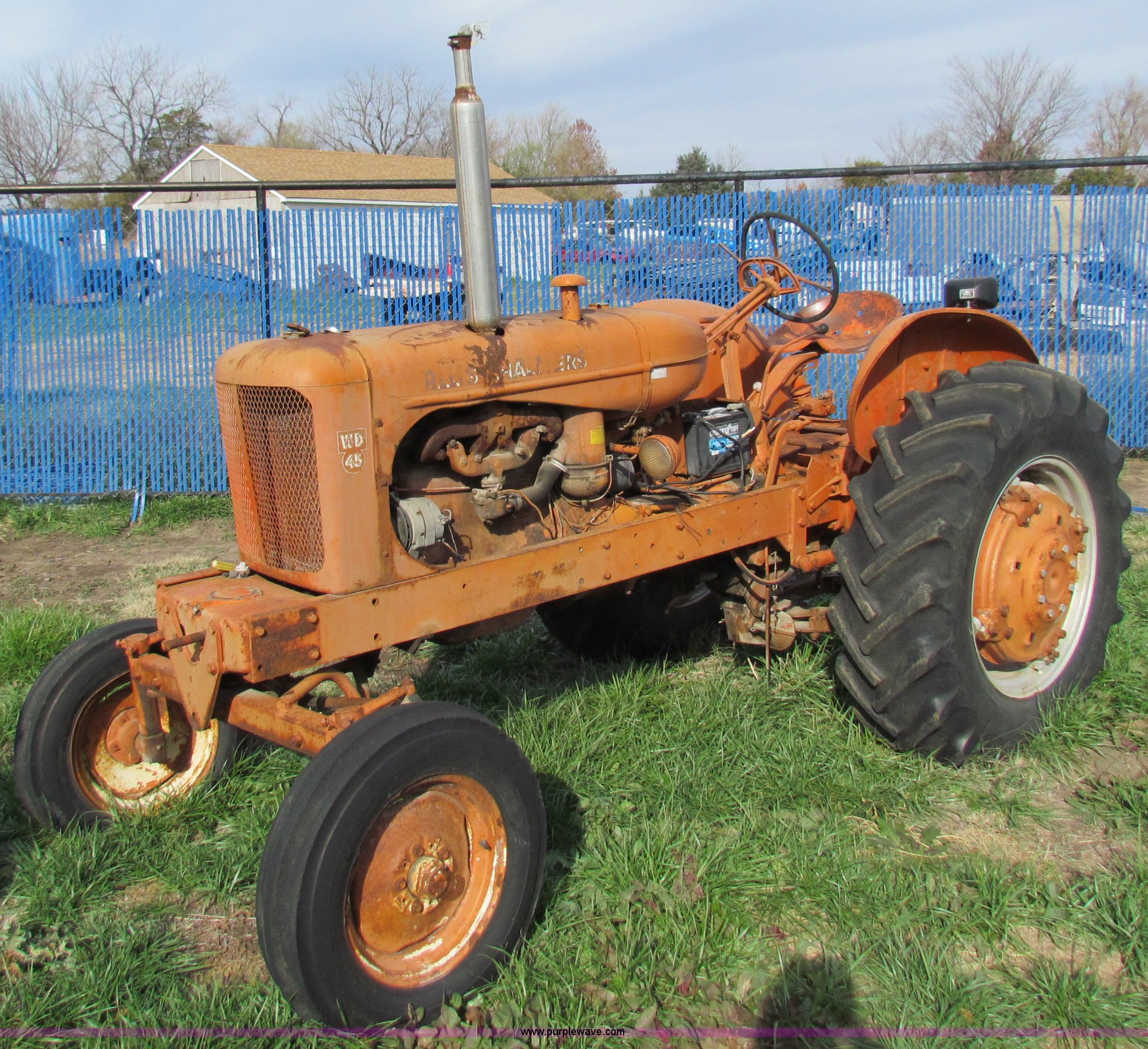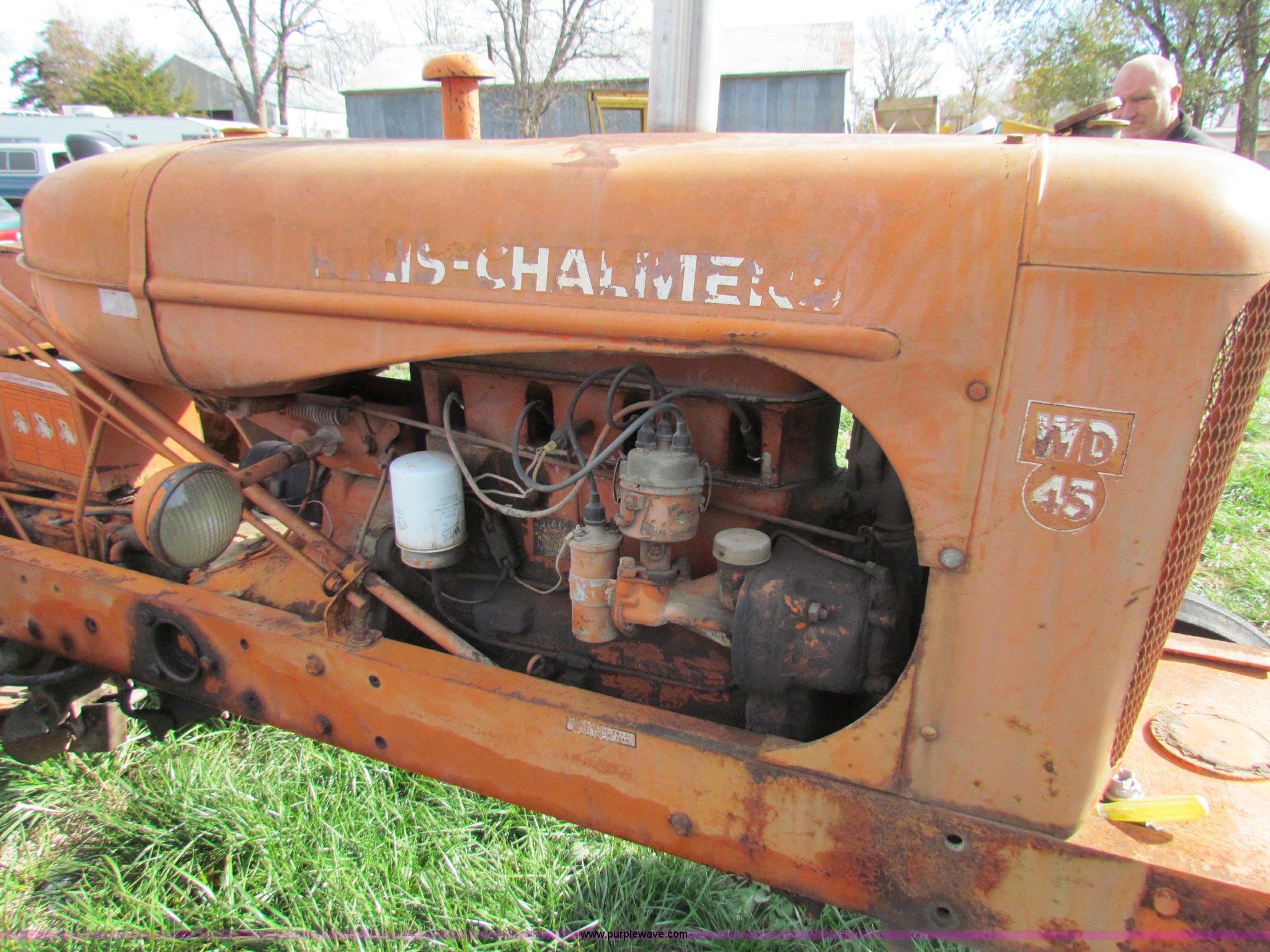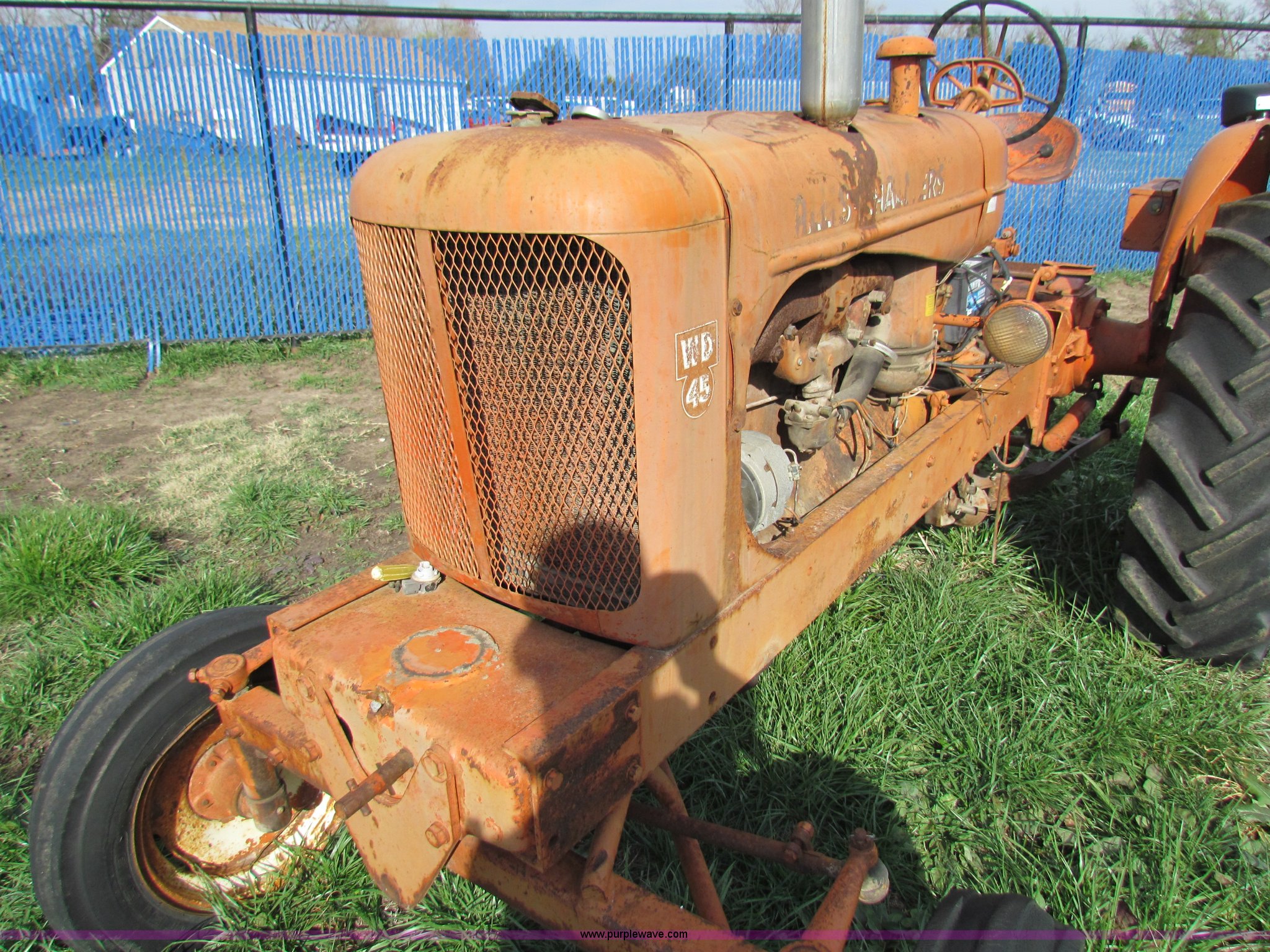 Purple Wave is selling a used Tractor in Kansas. This item is a Allis Chalmers WD45 tractor with the following: Four cylinder gas engine, Four speed transmission, Three point, 540 PTO, 6.00-16 front tires, 14.9-28 rear tires, Dead battery, Brakes inoperable, Operational when parked one year ago