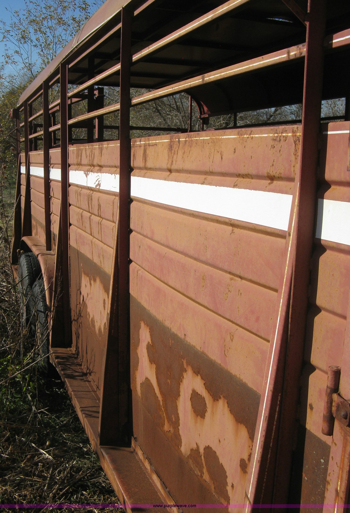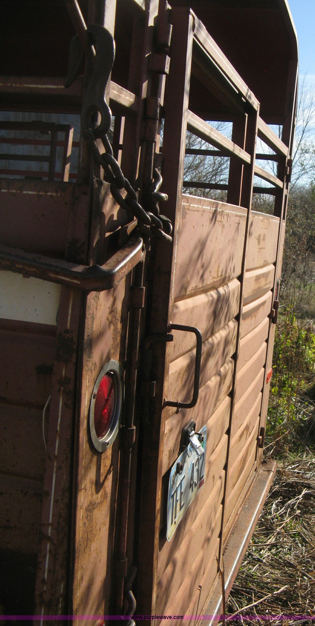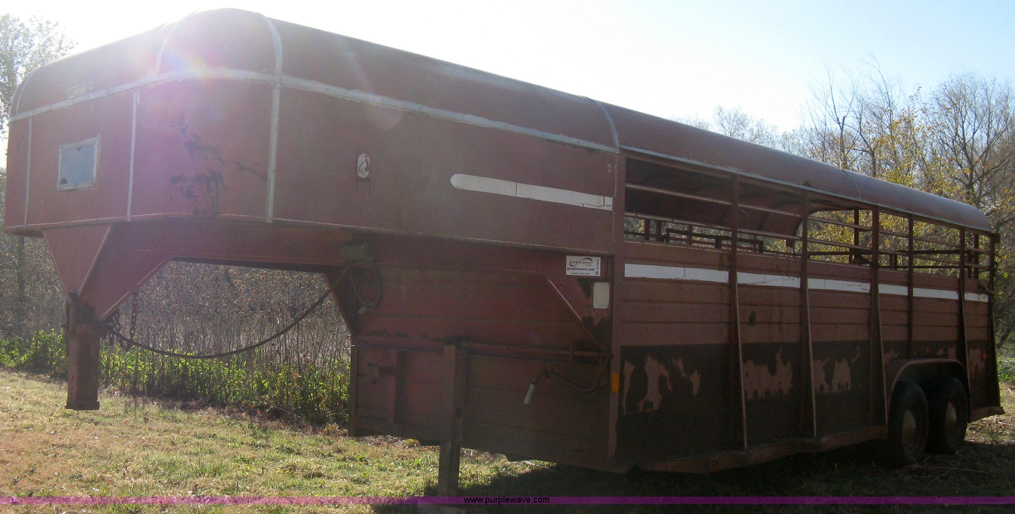 Purple Wave is selling a used Livestock Trailer in Kansas. This item is a 1981 Flying L gooseneck stock trailer with the following: 20'L x 7.2'W, Full nose cone, Front escape gate, Center divider gate with slide gate, Full rear gate with slide gate, Wood floor, Single post landing gear, Tandem axle, ST225/75R15 tires, GVWR 9,384 lbs