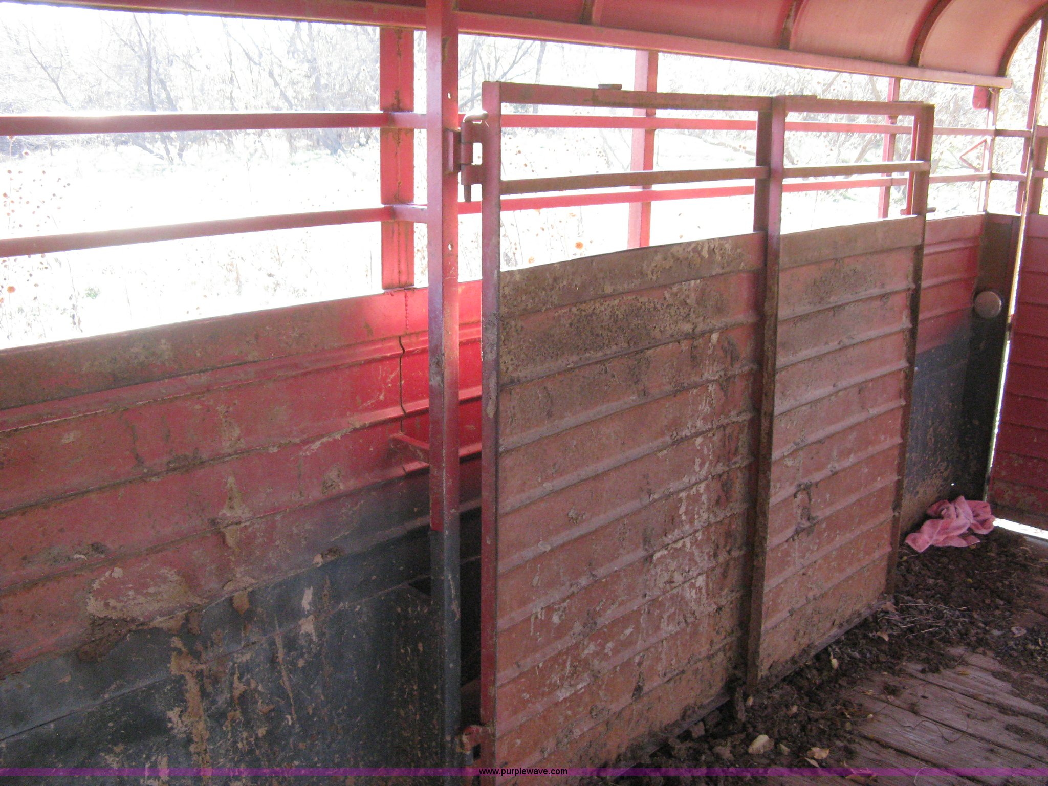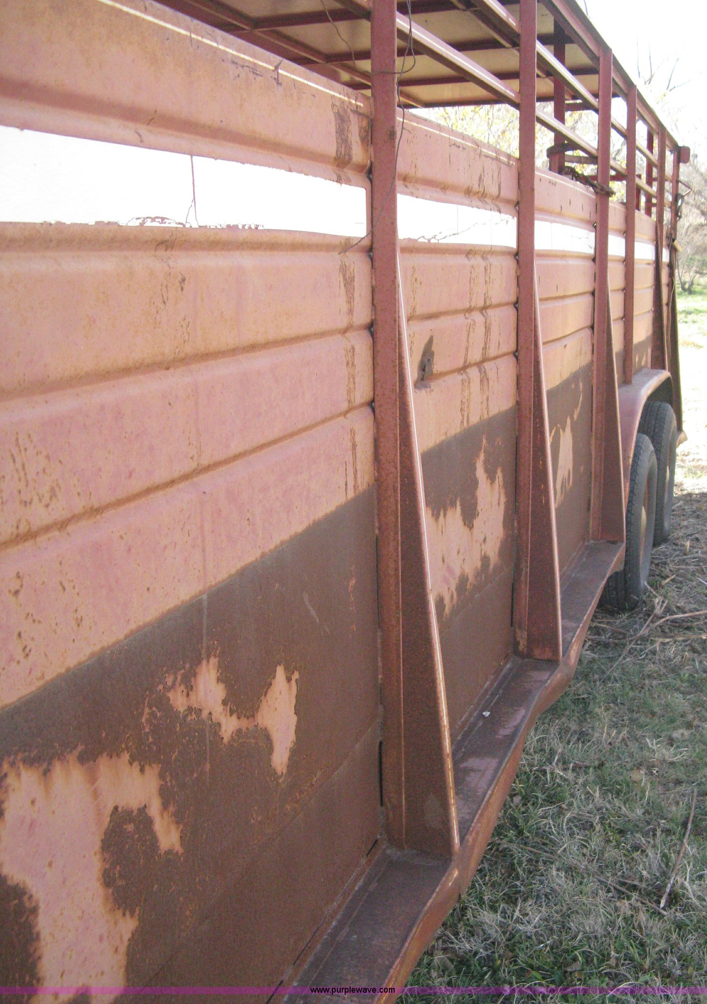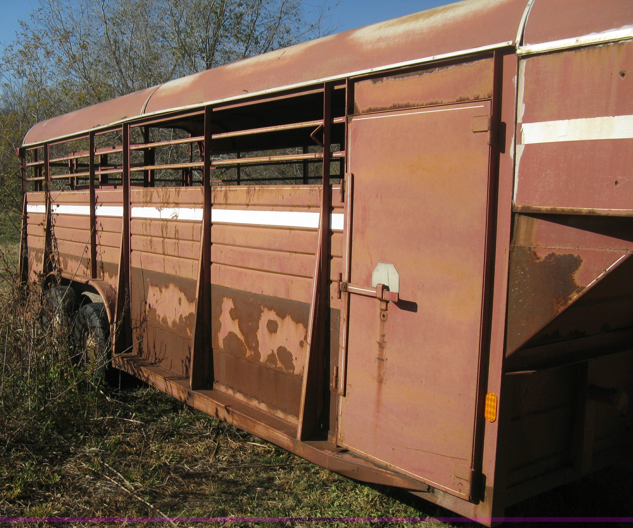 Purple Wave is selling a used Livestock Trailer in Kansas. This item is a 1981 Flying L gooseneck stock trailer with the following: 20'L x 7.2'W, Full nose cone, Front escape gate, Center divider gate with slide gate, Full rear gate with slide gate, Wood floor, Single post landing gear, Tandem axle, ST225/75R15 tires, GVWR 9,384 lbs