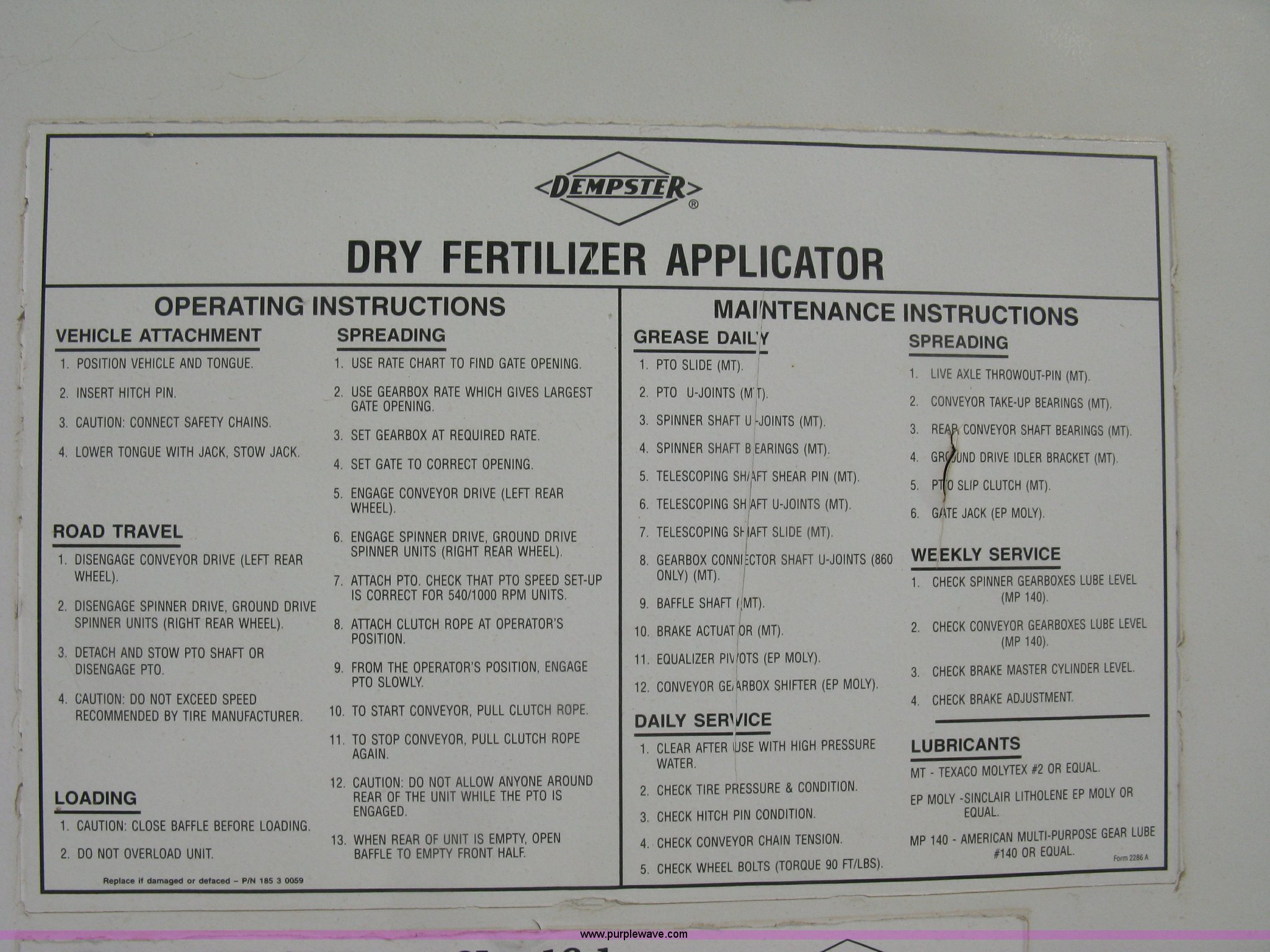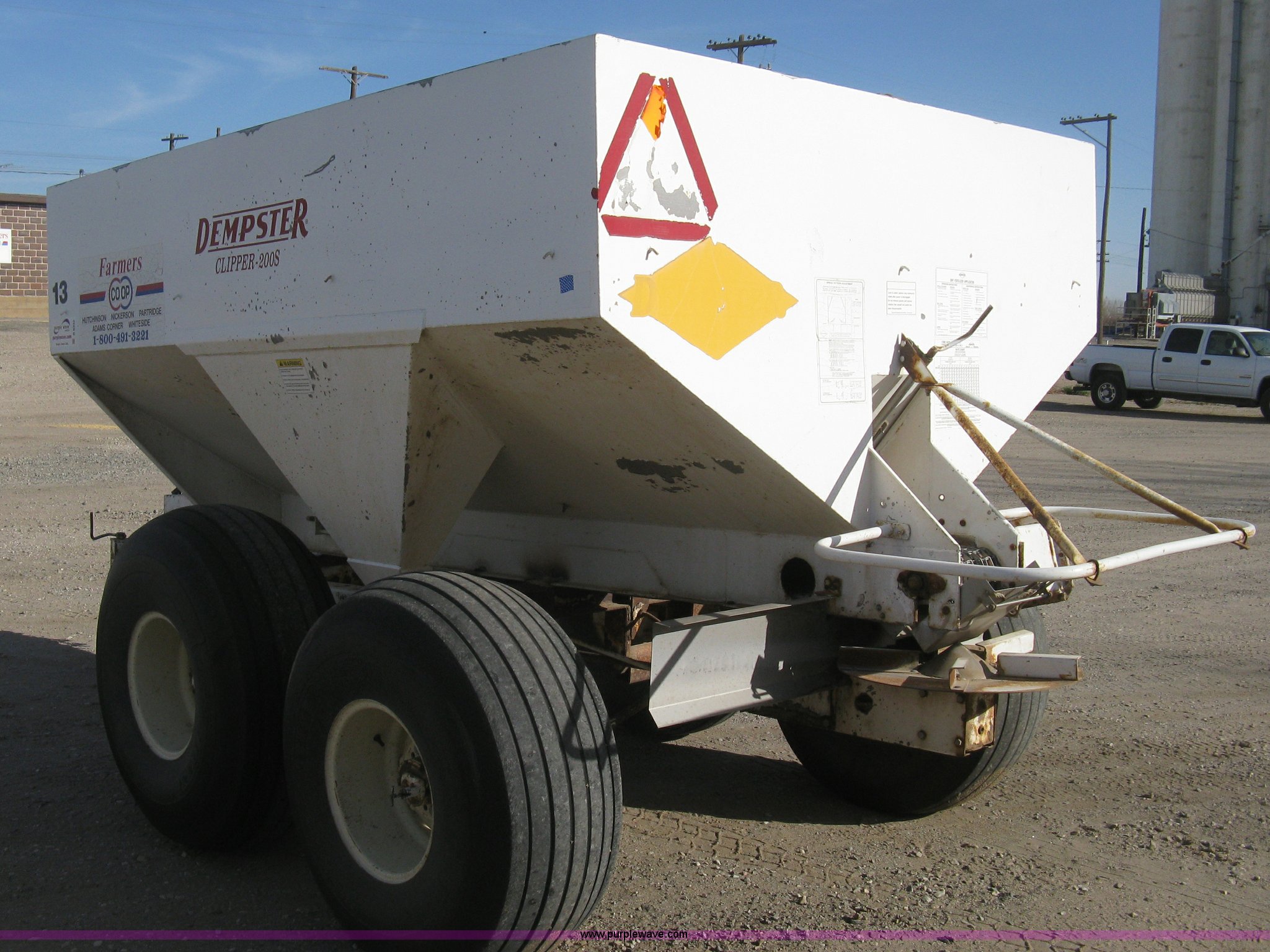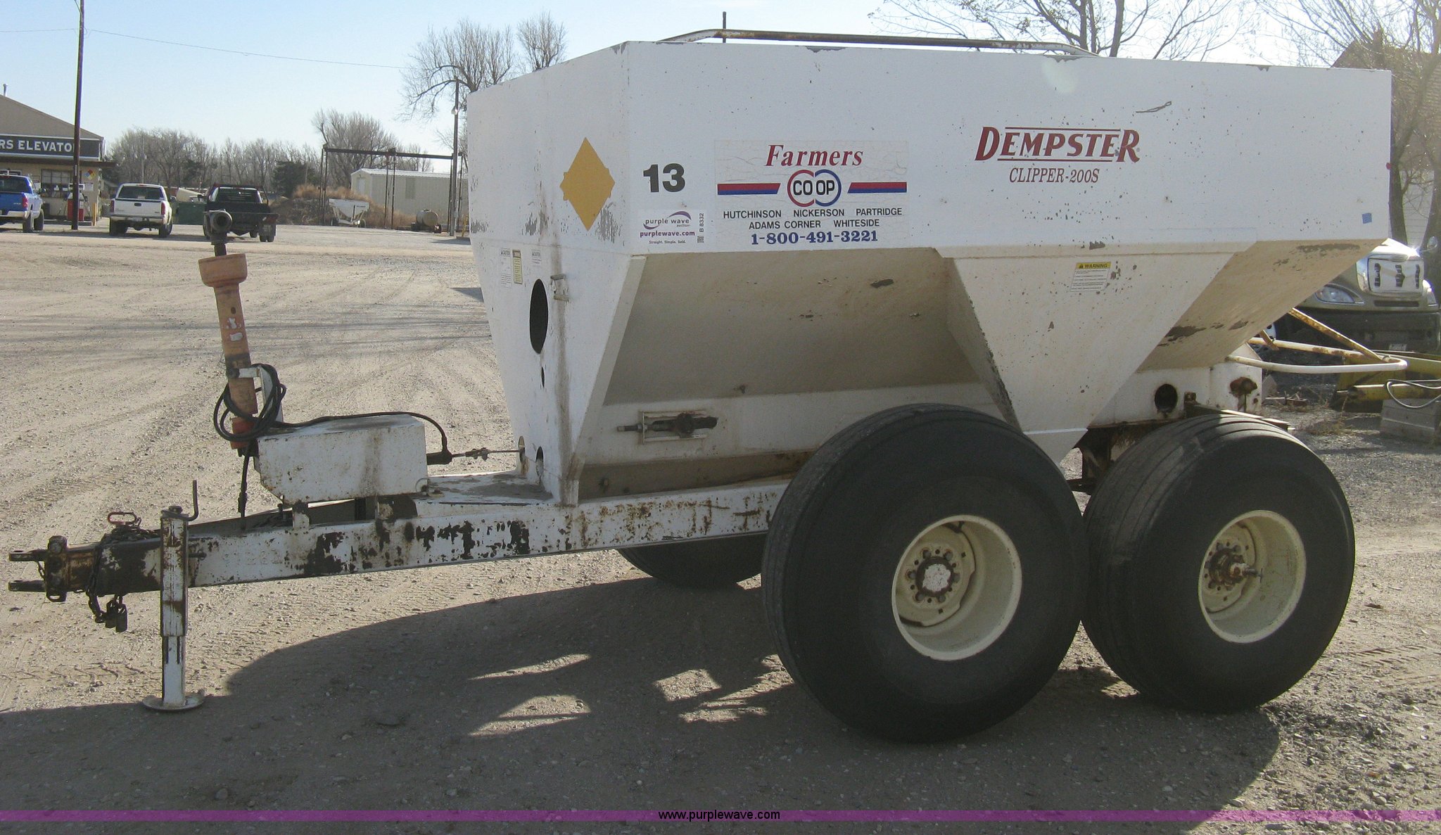 Purple Wave is selling a used Applicator Pull Type in Kansas. This item is a Dempster Clipper 200S fertilizer spinner/spreader with the following: 8,000 lb capacity, 60' coverage, Single broadcaster, Floater type, 540 PTO spinner, Hydraulic drive walking floor, Pin hitch, Jack stand, Tandem axle, Titan Floatation 16.5L-16.1SL tires, Unit# 97282