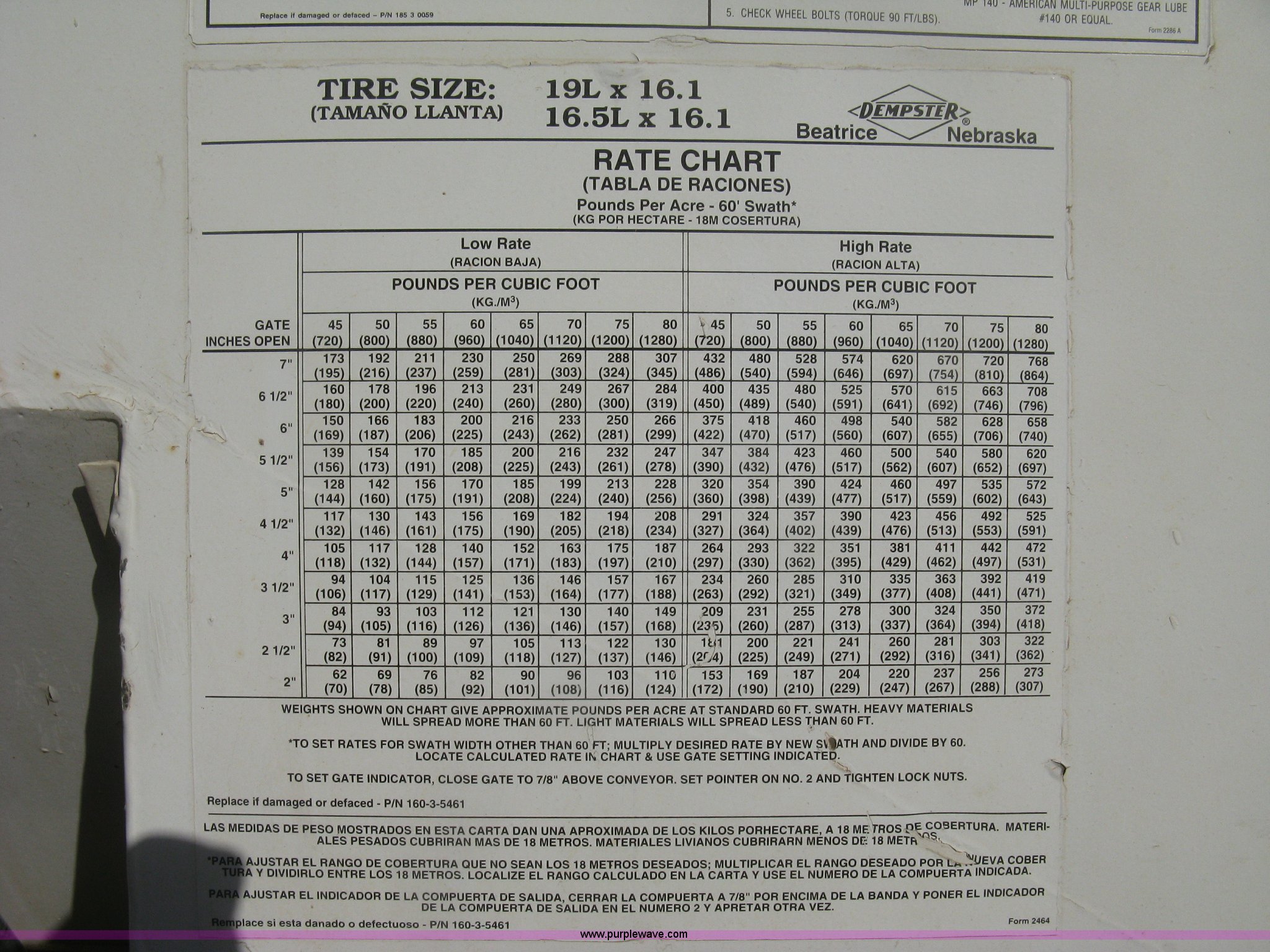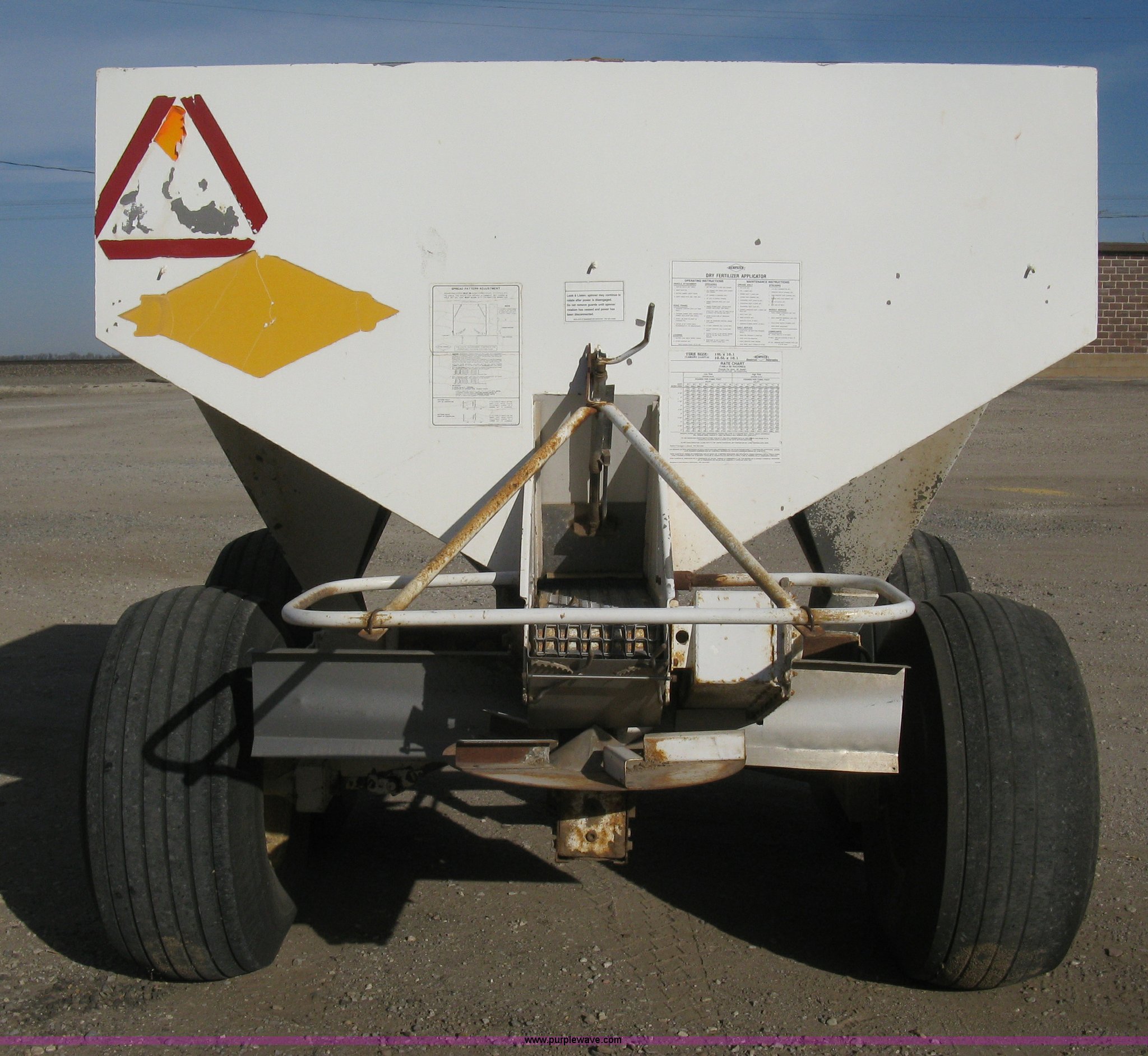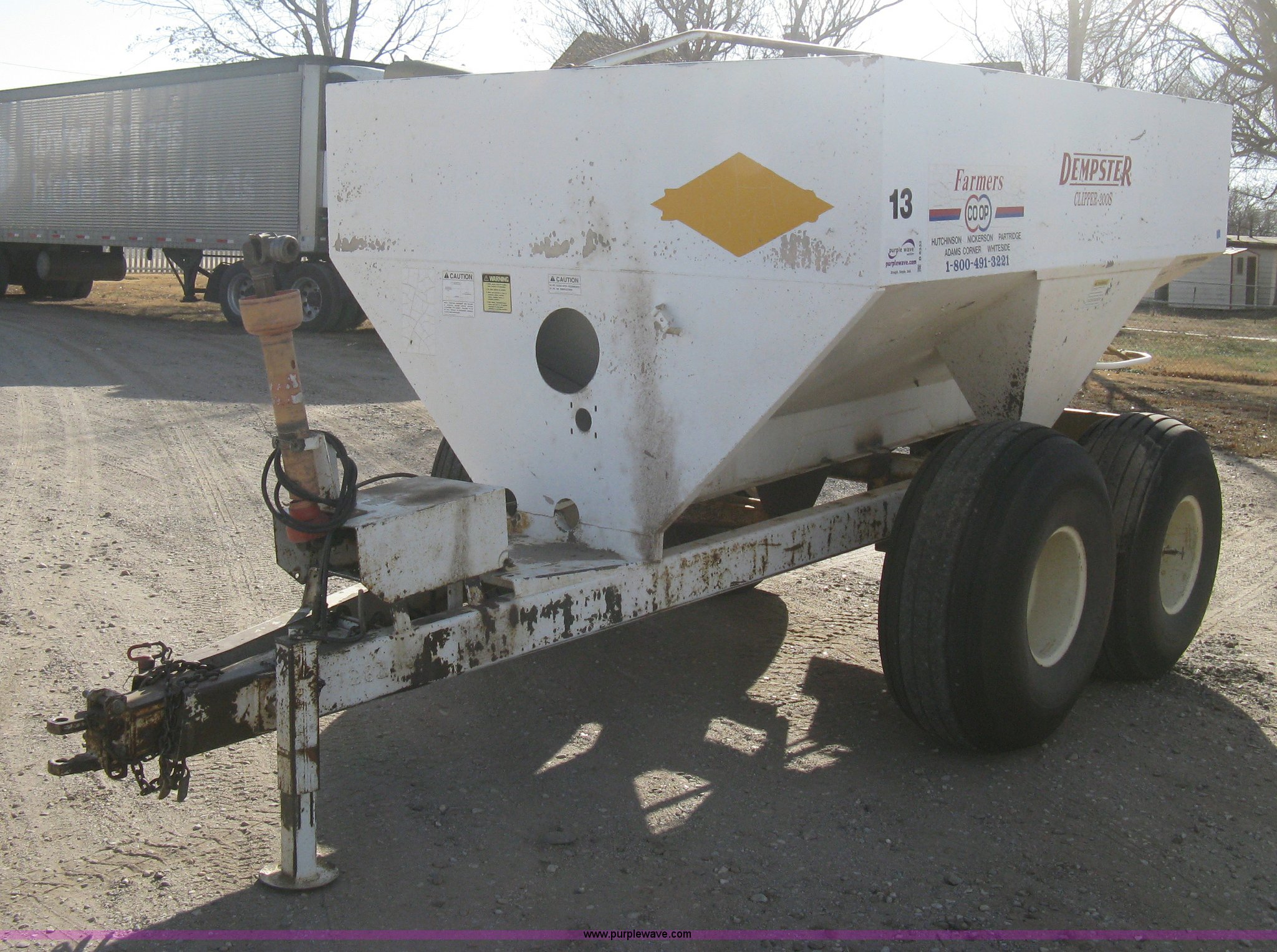 Purple Wave is selling a used Applicator Pull Type in Kansas. This item is a Dempster Clipper 200S fertilizer spinner/spreader with the following: 8,000 lb capacity, 60' coverage, Single broadcaster, Floater type, 540 PTO spinner, Hydraulic drive walking floor, Pin hitch, Jack stand, Tandem axle, Titan Floatation 16.5L-16.1SL tires, Unit# 97282
