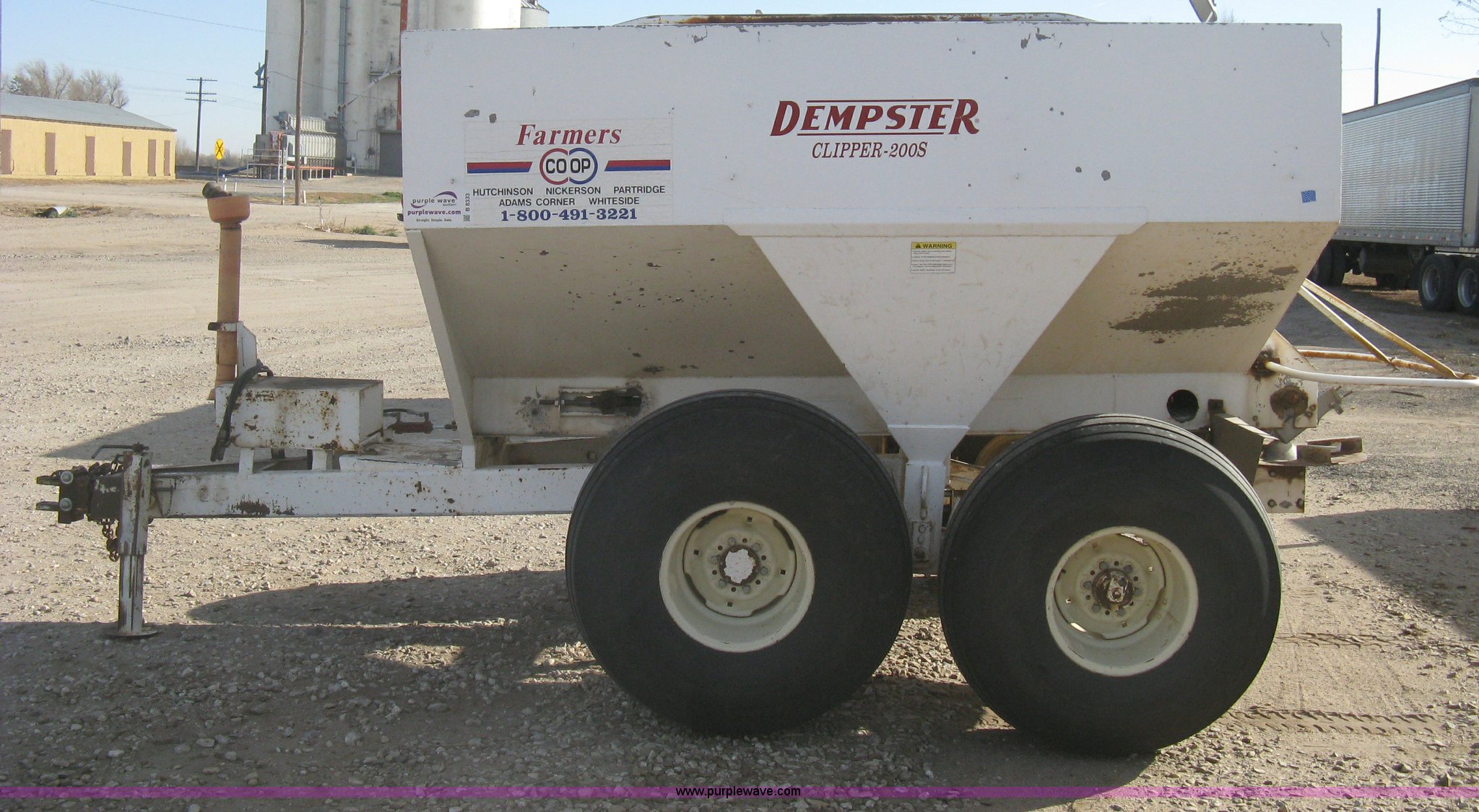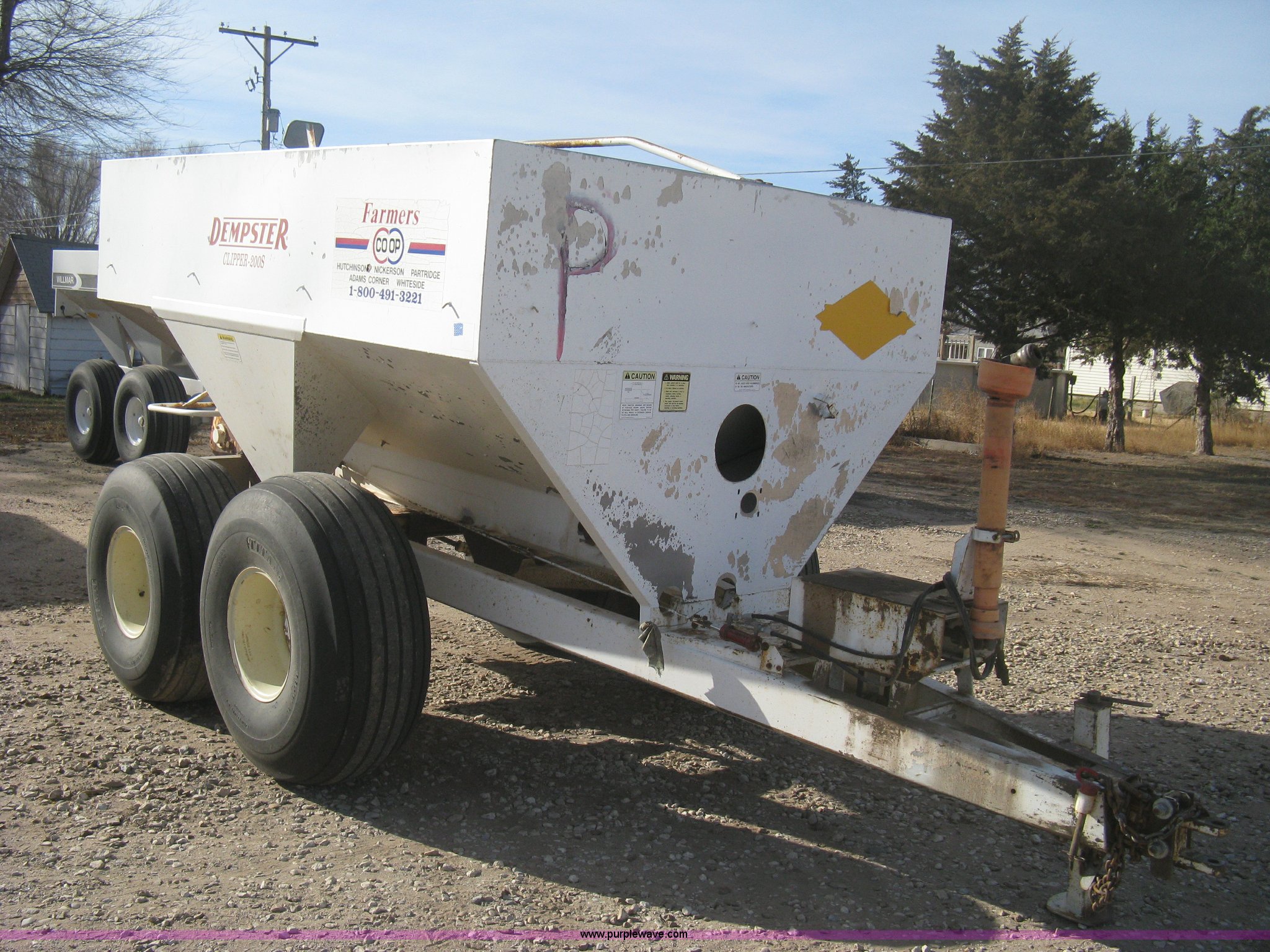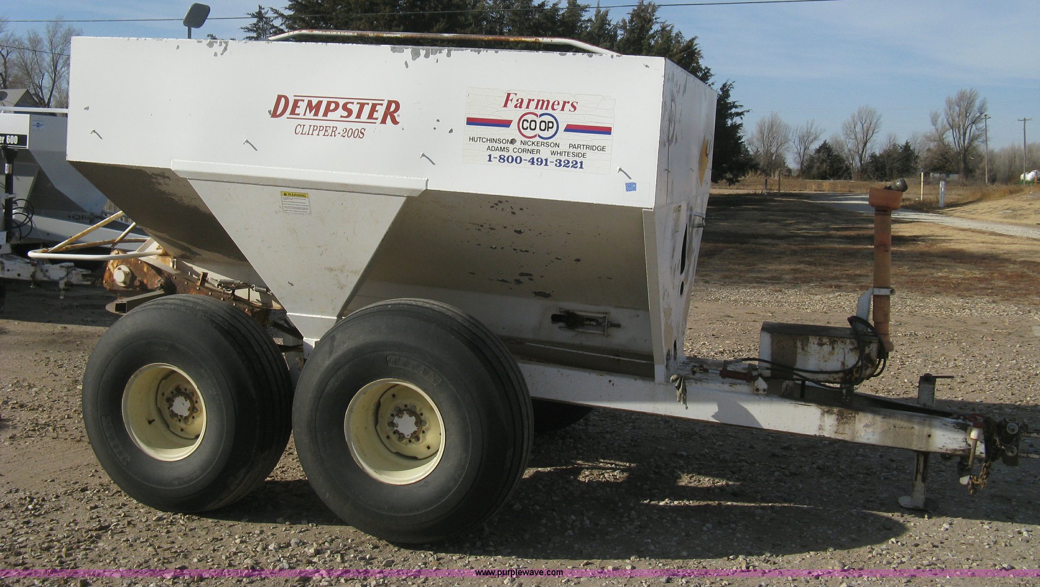 Purple Wave is selling a used Applicator Pull Type in Kansas. This item is a Dempster Clipper 200S fertilizer spinner/spreader with the following: 8,000 lb capacity, 60' coverage, Single broadcaster, Floater type, 540 PTO spinner, Hydraulic drive walking floor, Pin hitch, Jack stand, Tandem axle, Titan Floatation 16.5L-16.1SL tires, Unit# 97283