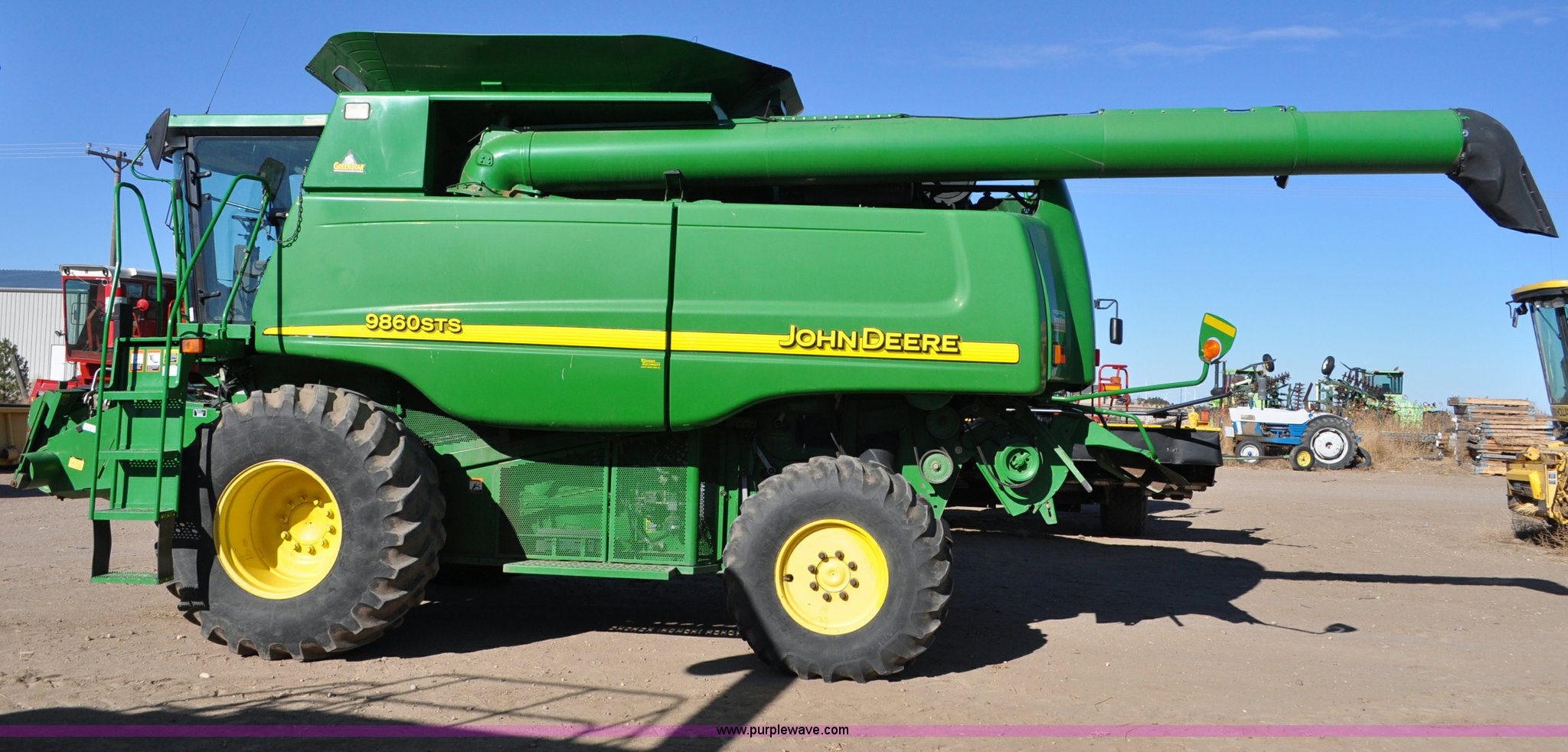 Purple Wave is selling a used Combine in Colorado. This item is a 2004 John Deere 9860 STS RWA combine with the following: 2,495 engine hours on meter, 1,632 separator hours on meter, John Deere six cylinder diesel engine, Model 6125HH003, Hydrostatic transmission, AM/FM, Instructor's seat, Tilt steering wheel, Bin extension, Work lights, Straw chopper, Two speed rotor, Greenstar enabled, Single point hookup, Feeder house reverser, Automatic header control, In-cab sieve control, Draper belt control, Contour feeder house, Small wire concaves, Grain loss monitor, Yield moisture monitor, 23' unloading auger, 30.5R32 drive tires, 18.4-26 rear tires, Serial HO98605705799