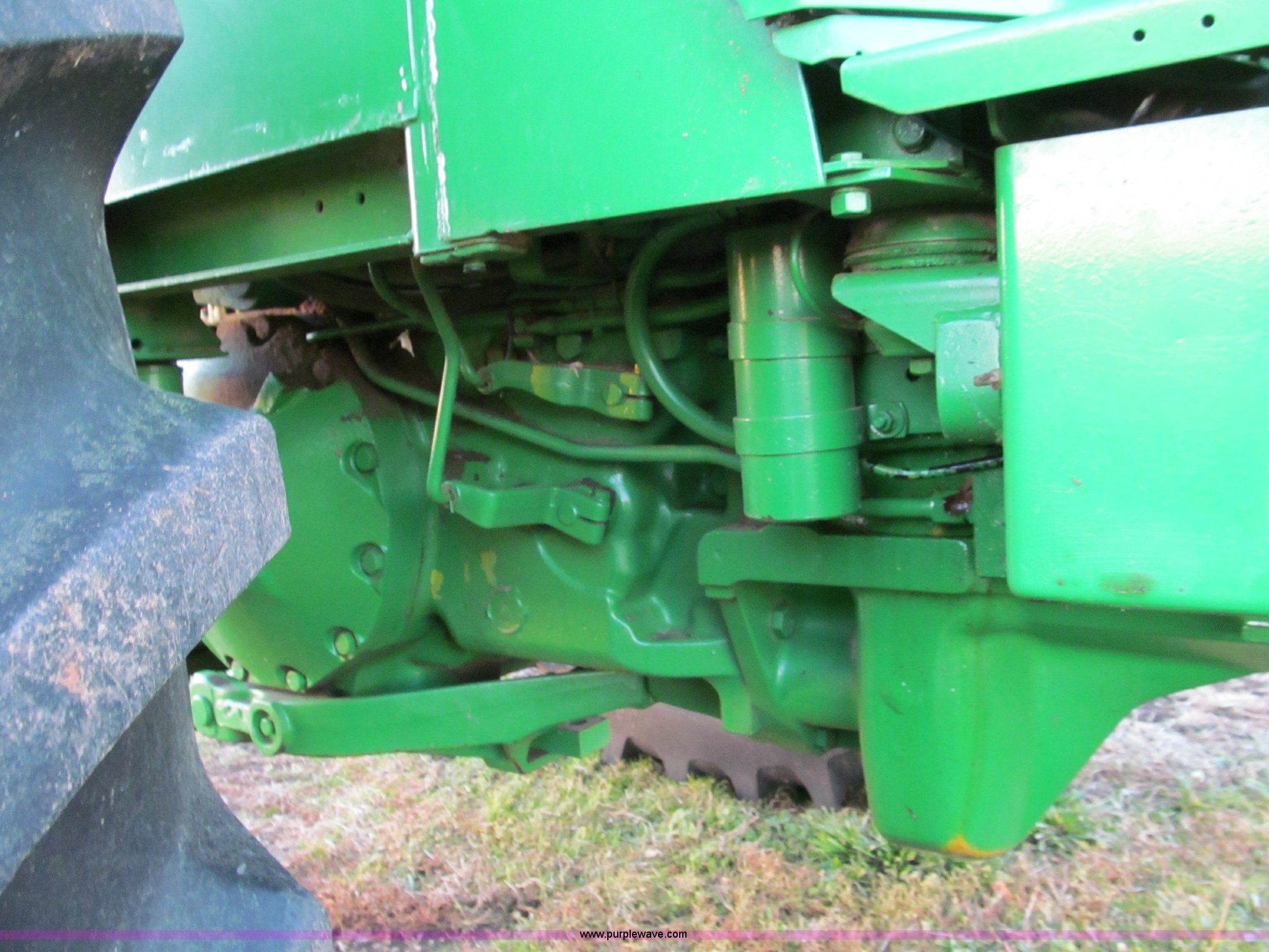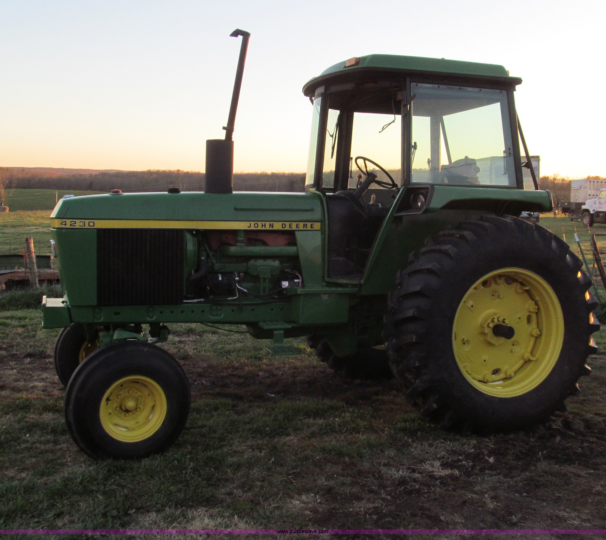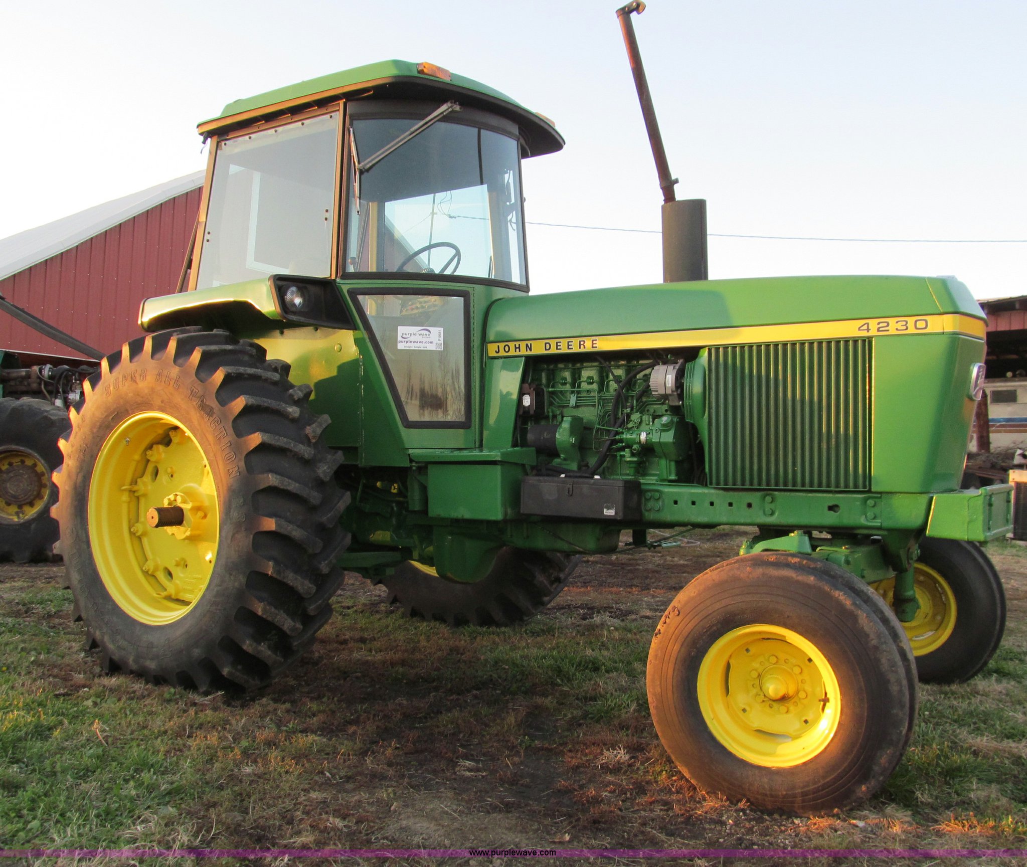 Purple Wave is selling a used Tractor in Missouri. This item is a 1974 John Deere 4230 tractor with the following: 5,105 hours on meter, John Deere six cylinder diesel engine, Quad Range transmission, 12F-4R gears, AC and heat, AM/FM, Spring seat, Tilt steering wheel, Three point, Draw bar, Auxiliary outlet, 540/1000 PTO, (2) rear hydraulic remotes, 18.4-34 tires, Glass will be repaired and door reinstalled prior to auction, Bale monitor not included, Serial 4230H018278R
