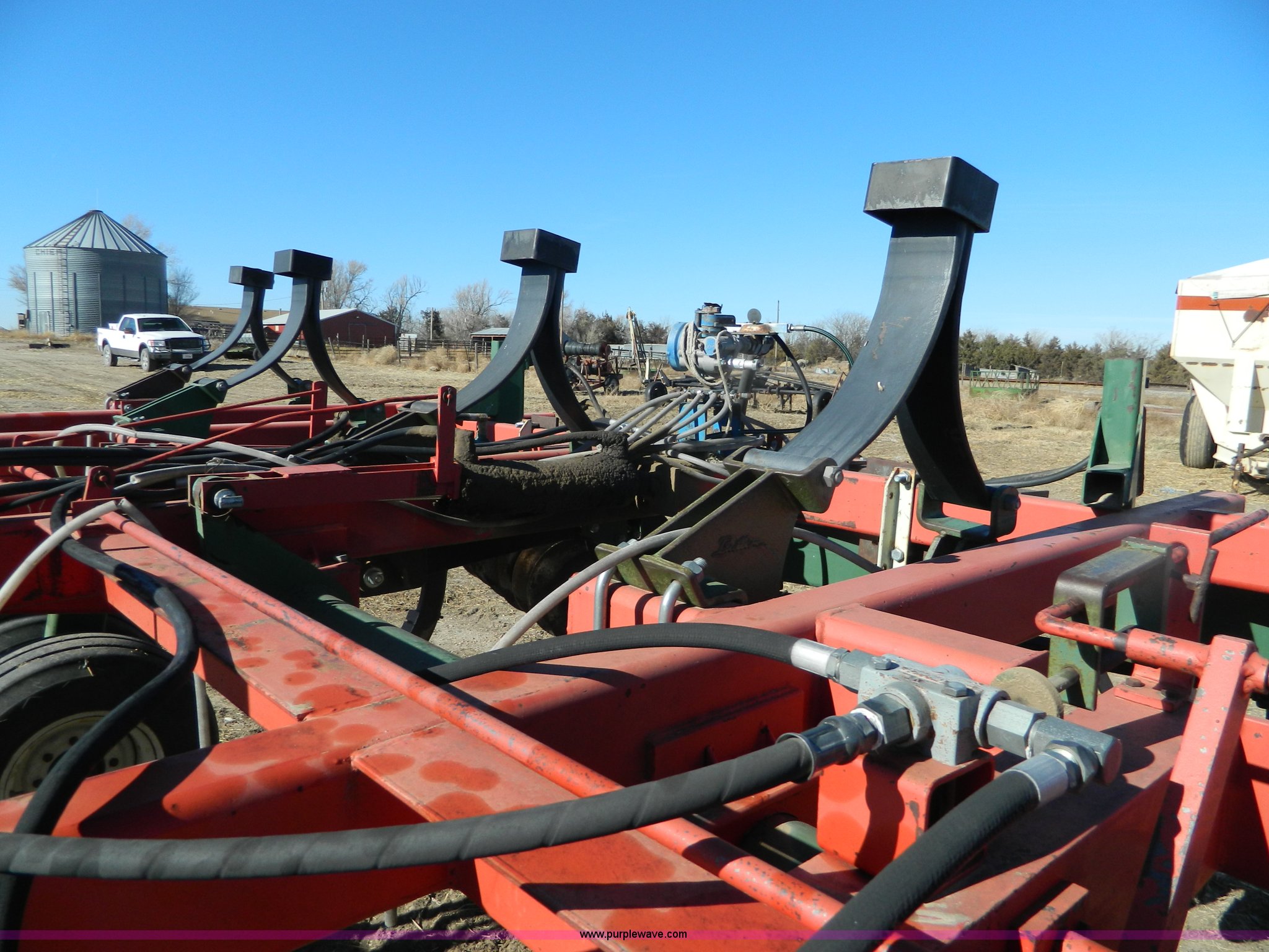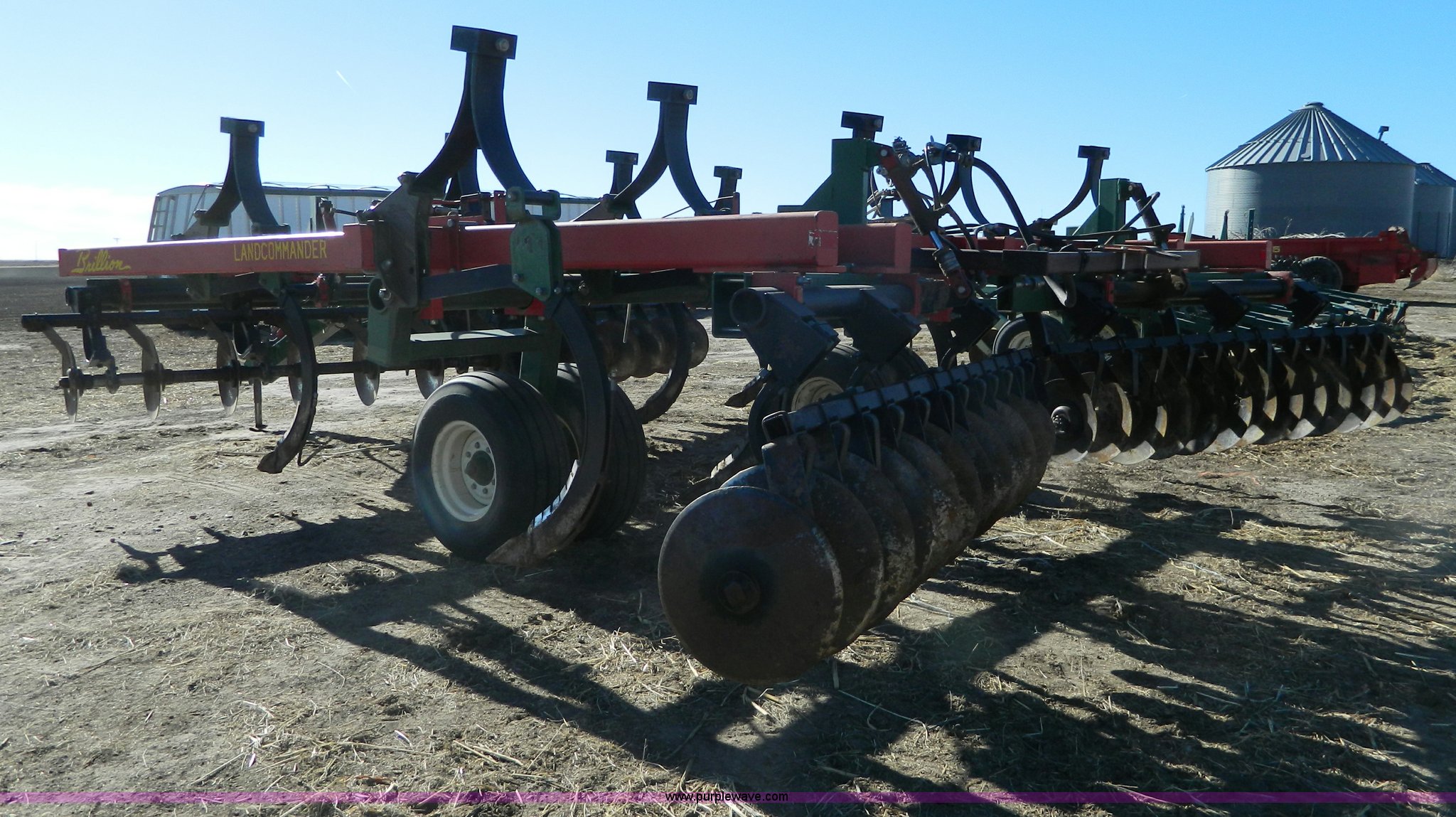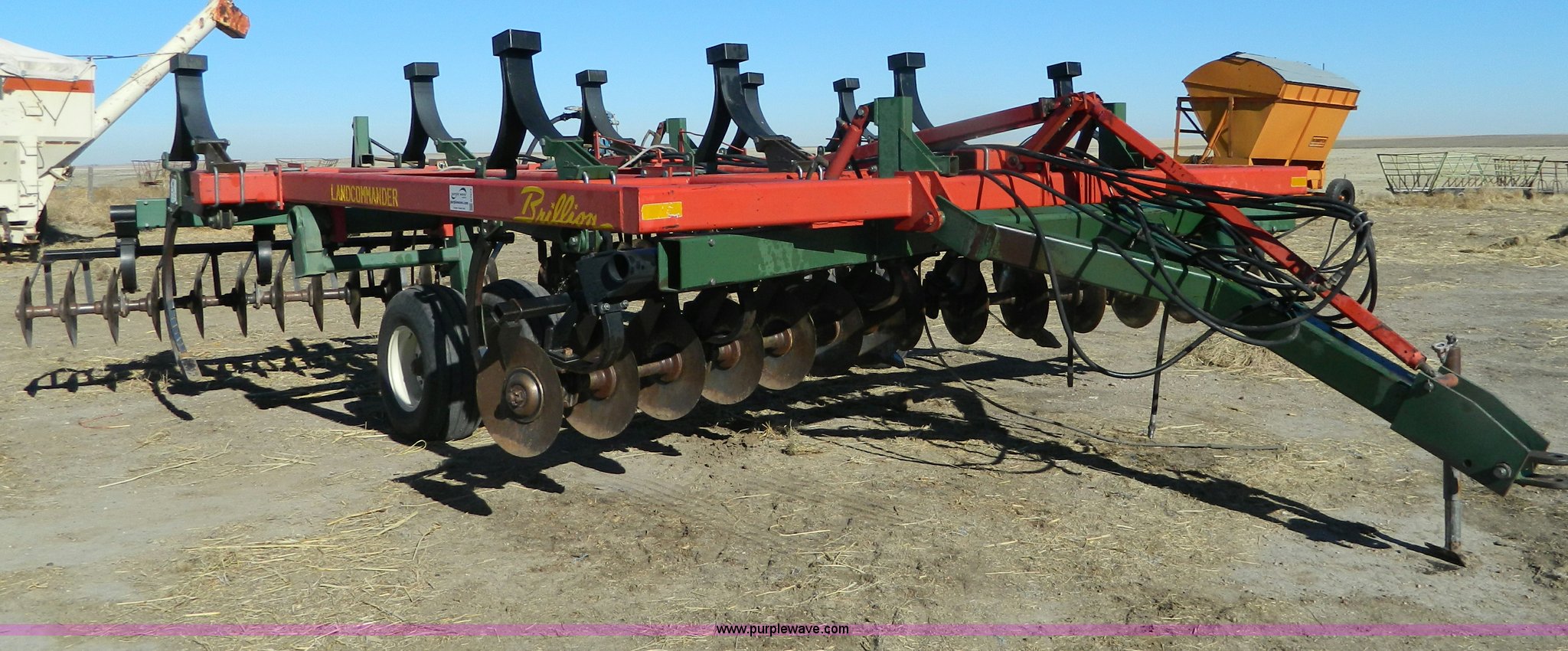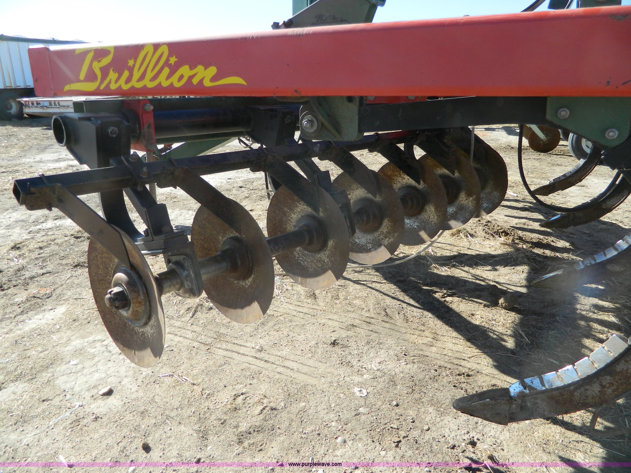 Purple Wave is selling a used Disk Ripper in Kansas. This item is a Brillion conditioner ripper with the following: 18" disks, 19' disc width, Nine shank, Anhydrous hitch, John Blue hydraulic flow troll, 12.5L16 tires, Adjustment arm welded on, Anhydrous tubing needs replaced, Serial 172254