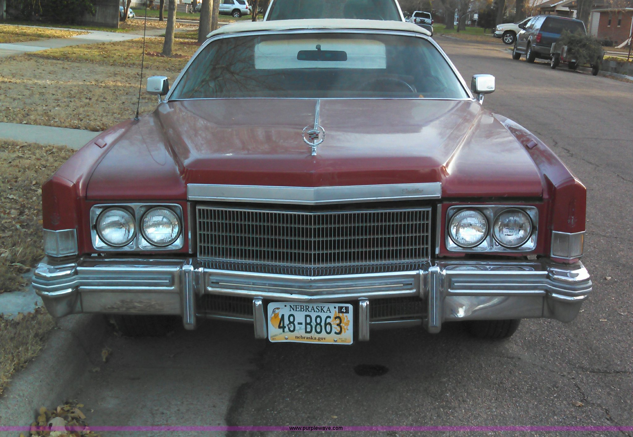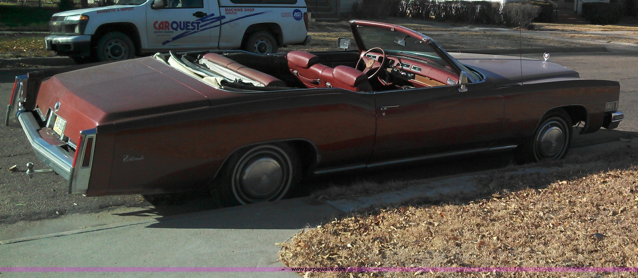 Purple Wave is selling a used Passenger Vehicle in Nebraska. This item is a 1975 Cadillac Eldorado convertible with the following: 98,943 miles on odometer, Gas engine, Automatic transmission, Power windows and locks, Recently replaced tires, alternator belt, CV axles, water pump, and fuel filter, New top lift cables installed, Floor board rusted, Top torn on edges, Needs plug wires and valve cover gasket
