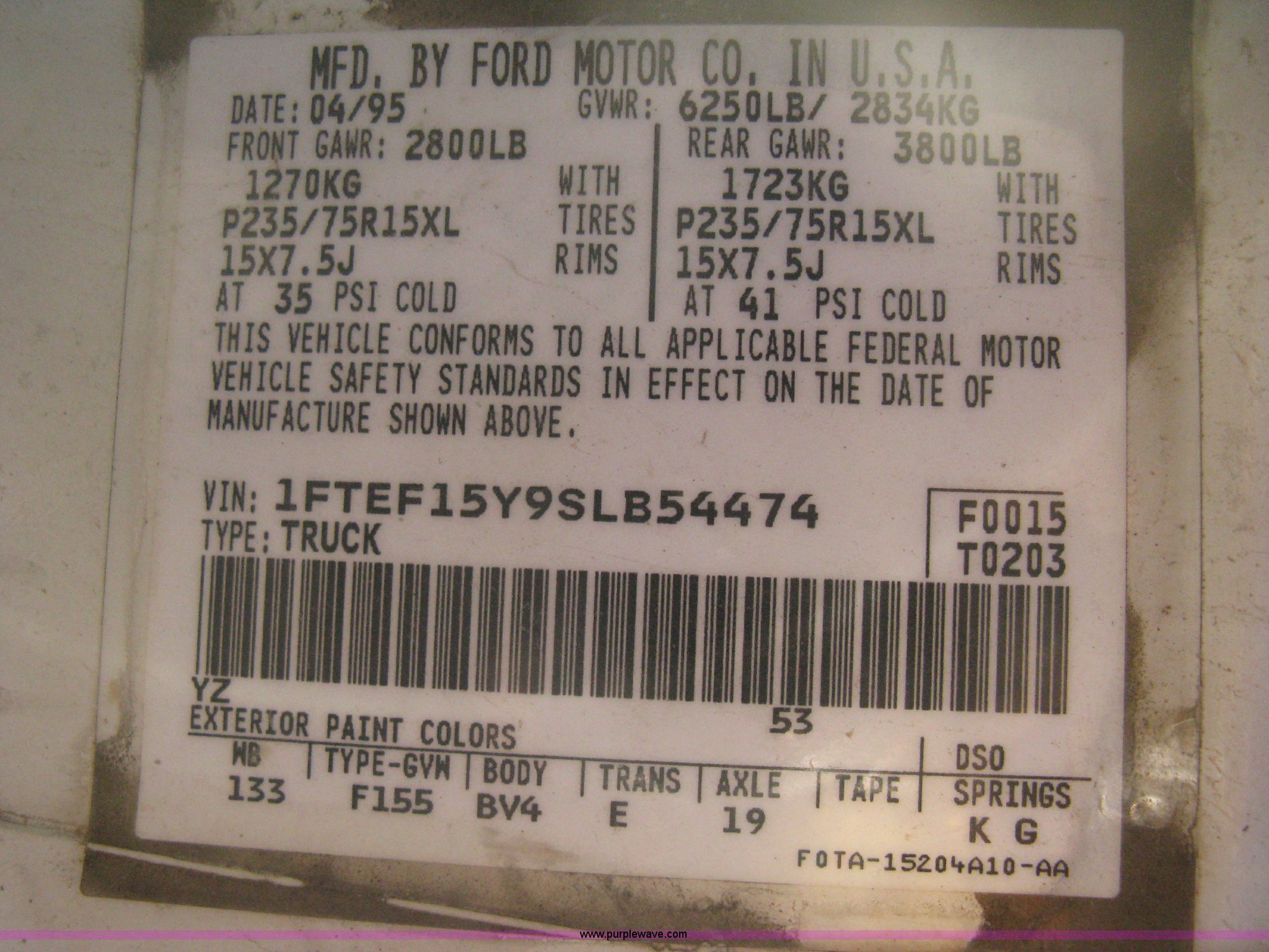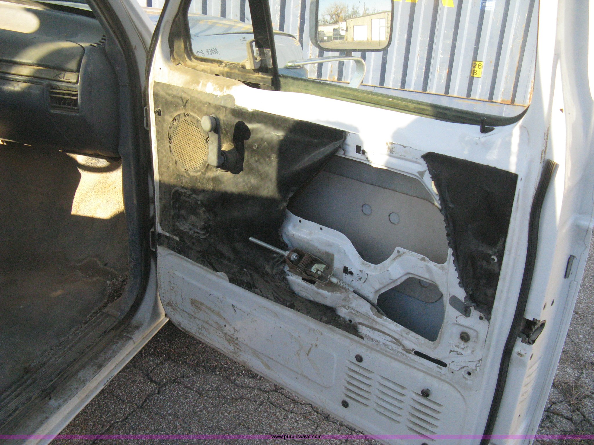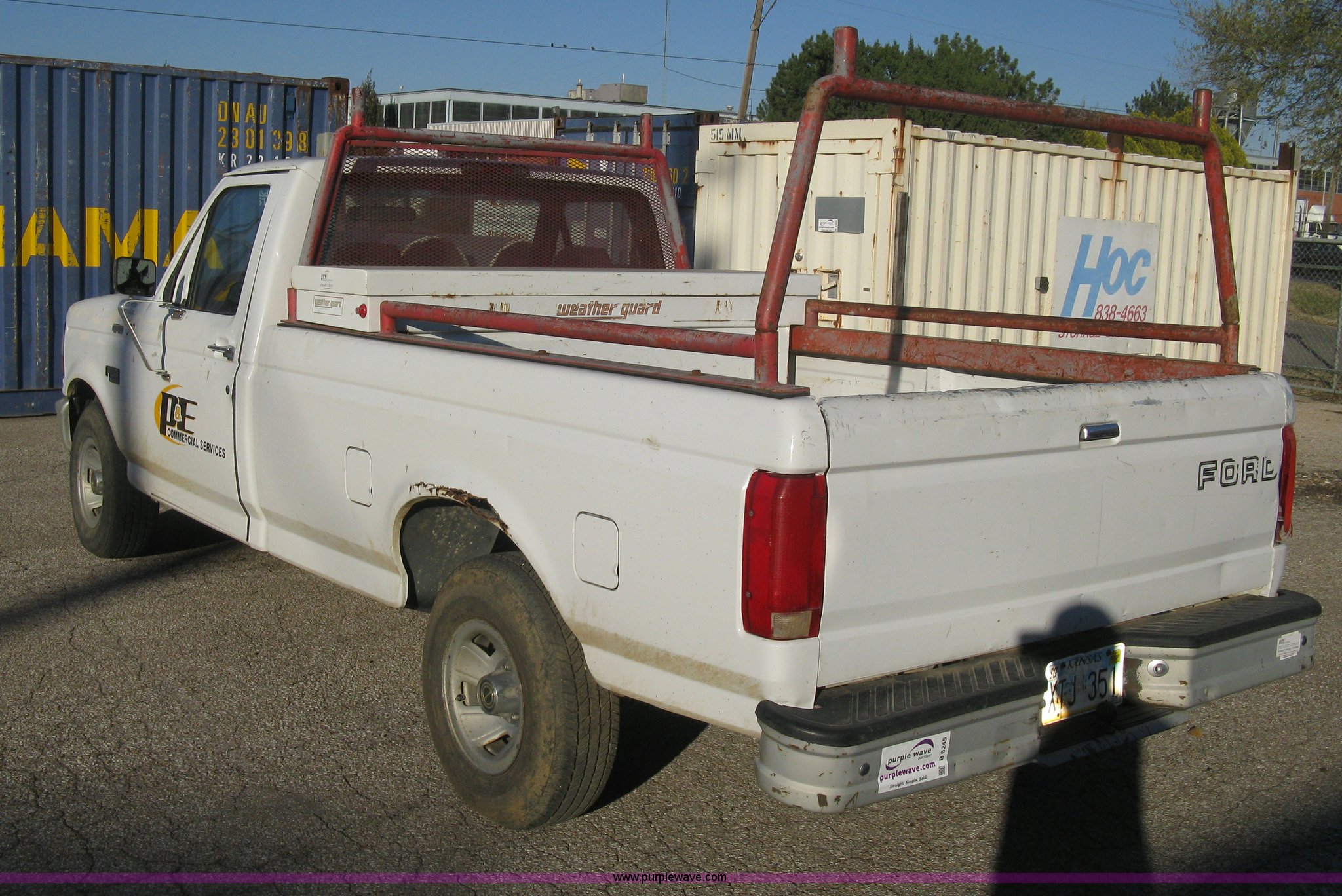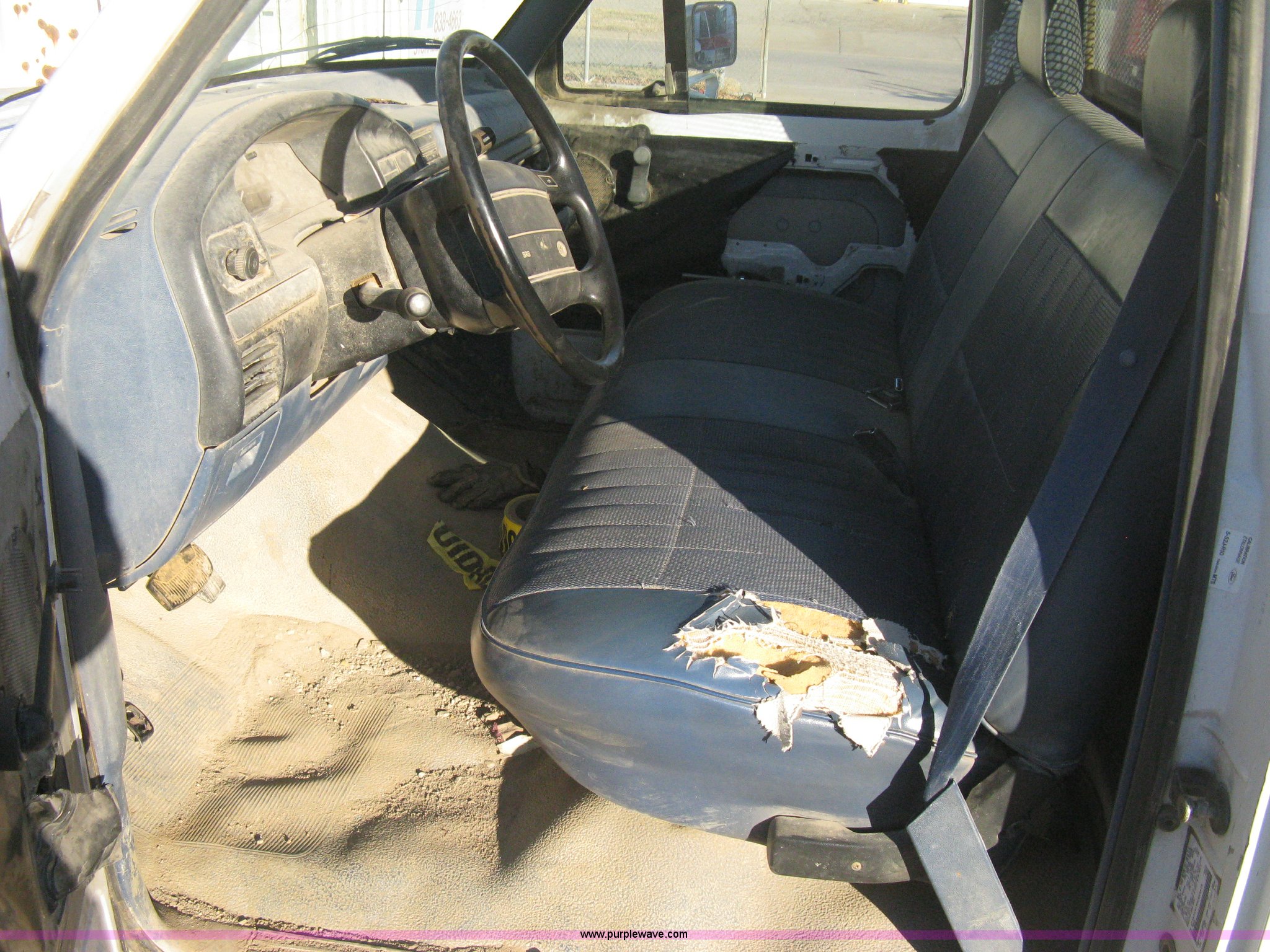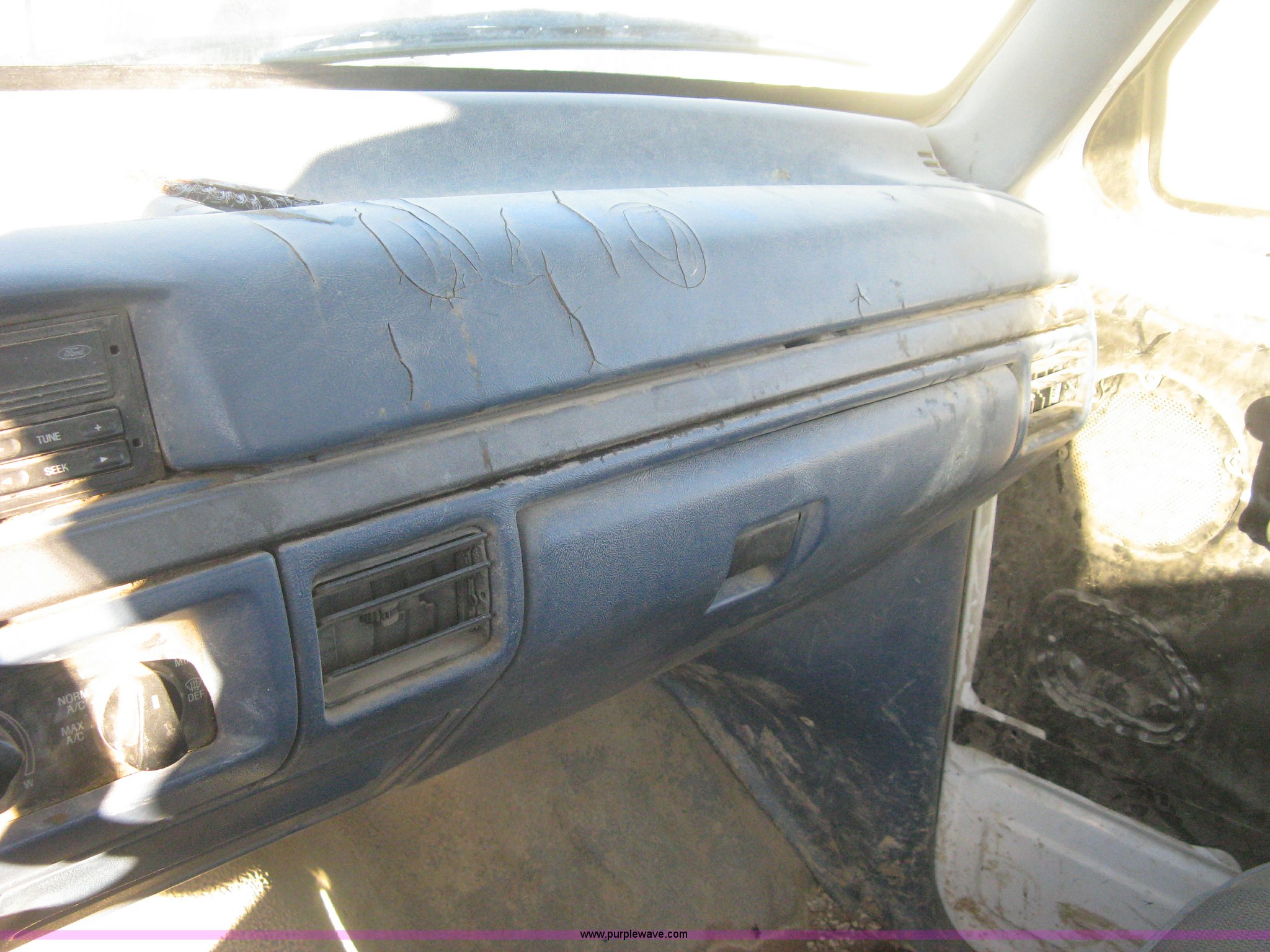 Purple Wave is selling a used Passenger Vehicle in Kansas. This item is a 1995 Ford F150 XL pickup truck with the following: 187,039 miles on odometer, 4.9L I6 EFI gas engine, Automatic transmission, AC and heat, AM/FM, Manual windows and locks, Vinyl interior, Weather Guard tool box, Headache rack, Ladder racks, P235/75R15 tires, Cracked windshield, Body damage, Missing inside door covers, Damaged door pulls, Cracked dashboard, No battery, Missing catalytic converter, Unit# 582