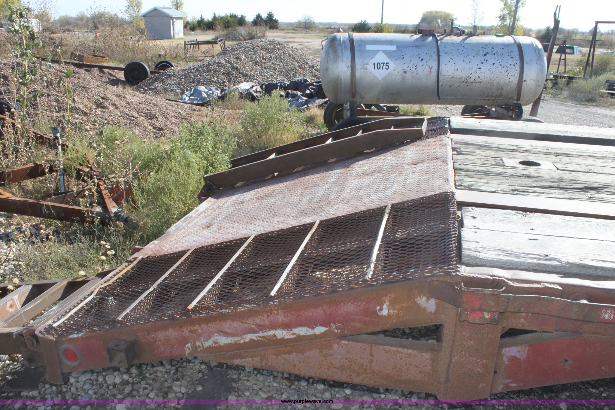 Purple Wave is selling a used Flat or Drop Deck Trailer in Kansas. This item is a 1995 Daco dual tandem axle flatbed trailer with the following: 36'10"L deck, 132"L upper deck, 101" width with rub rail, 97" width inside rub rail, 5' dove tail, 5'fold down ramps, Spring suspension, Air brakes, 225/70R22.5 tires, 70,000 lbs GVWR, Rust damage to underside of neck assembly