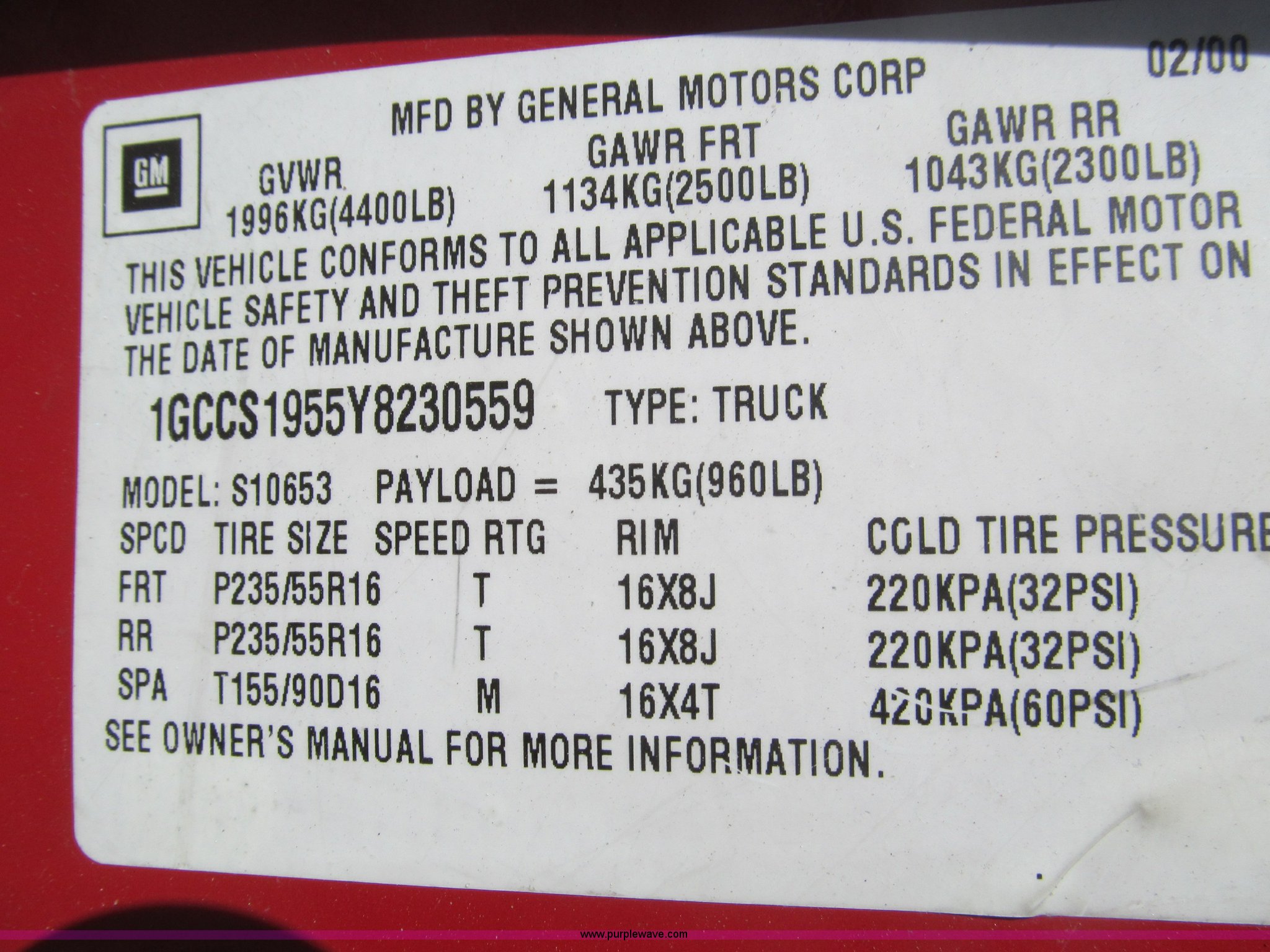 Purple Wave is selling a used Passenger Vehicle in Missouri. This item is a 2000 Chevrolet S10 Xtreme Extended Cab pickup truck with the following: 123,250 miles on odometer, 2.2L I4 SFI gas engine, Automatic transmission, AC and heat, Tilt, AM/FM/CD, Manual windows and locks, Cloth interior, 235/55R16 tires