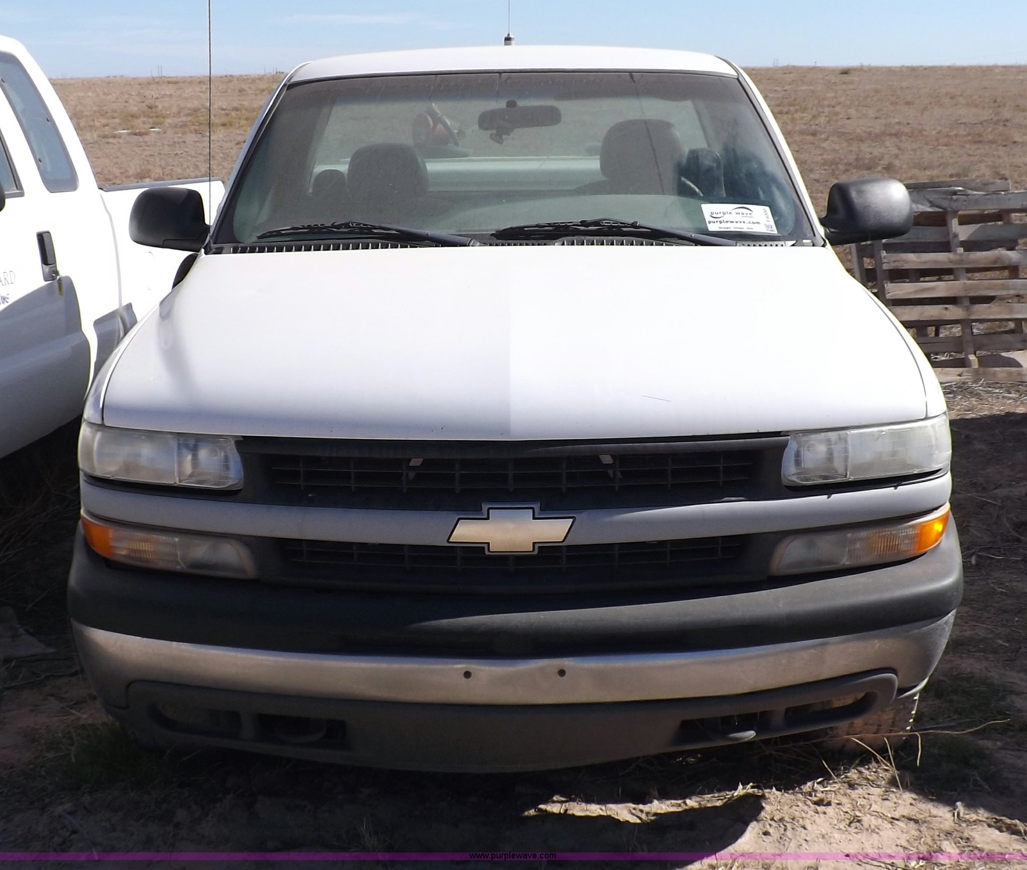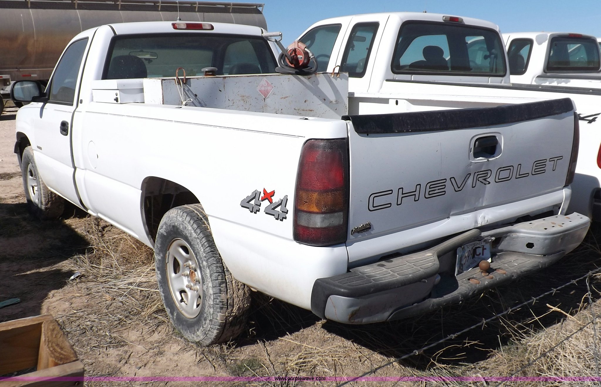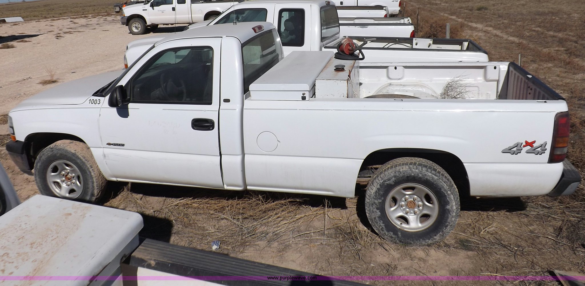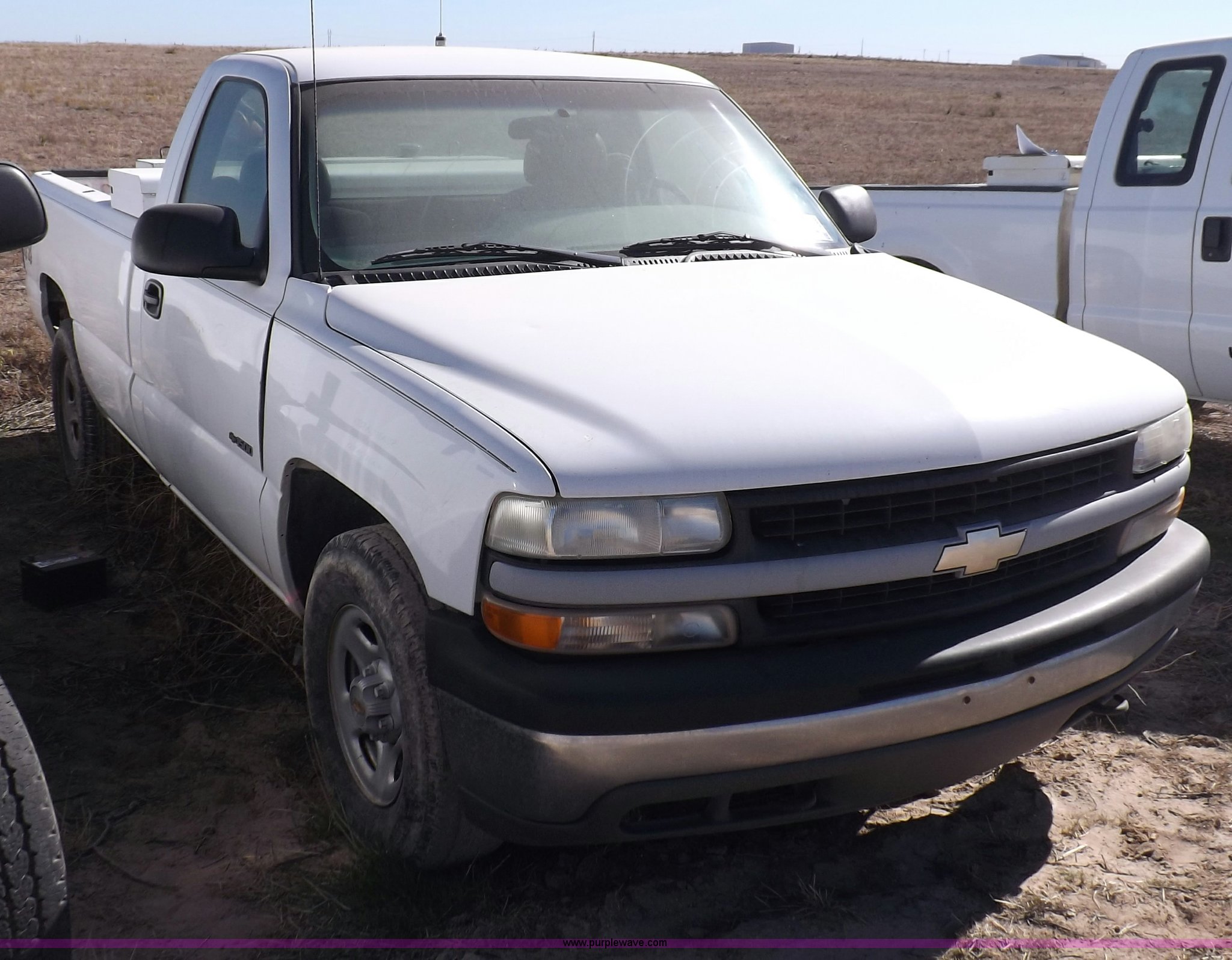 Purple Wave is selling a used Passenger Vehicle in Oklahoma. This item is a 2000 Chevrolet Silverado 1500 pickup truck with the following: Mileage unknown, 4.3L V6 CPI gas engine, Automatic transmission, Four wheel drive, AC and heat, Tilt, Cruise, AM/FM/cassette, Manual windows and locks, Cloth interior, Long bed, Delta toolbox, L-shaped fuel tank with hand pump, Roof drilled for antenna, Interior/exterior cosmetic damage, Driver's door does not shut properly, Needs battery, Seaboard# 1003