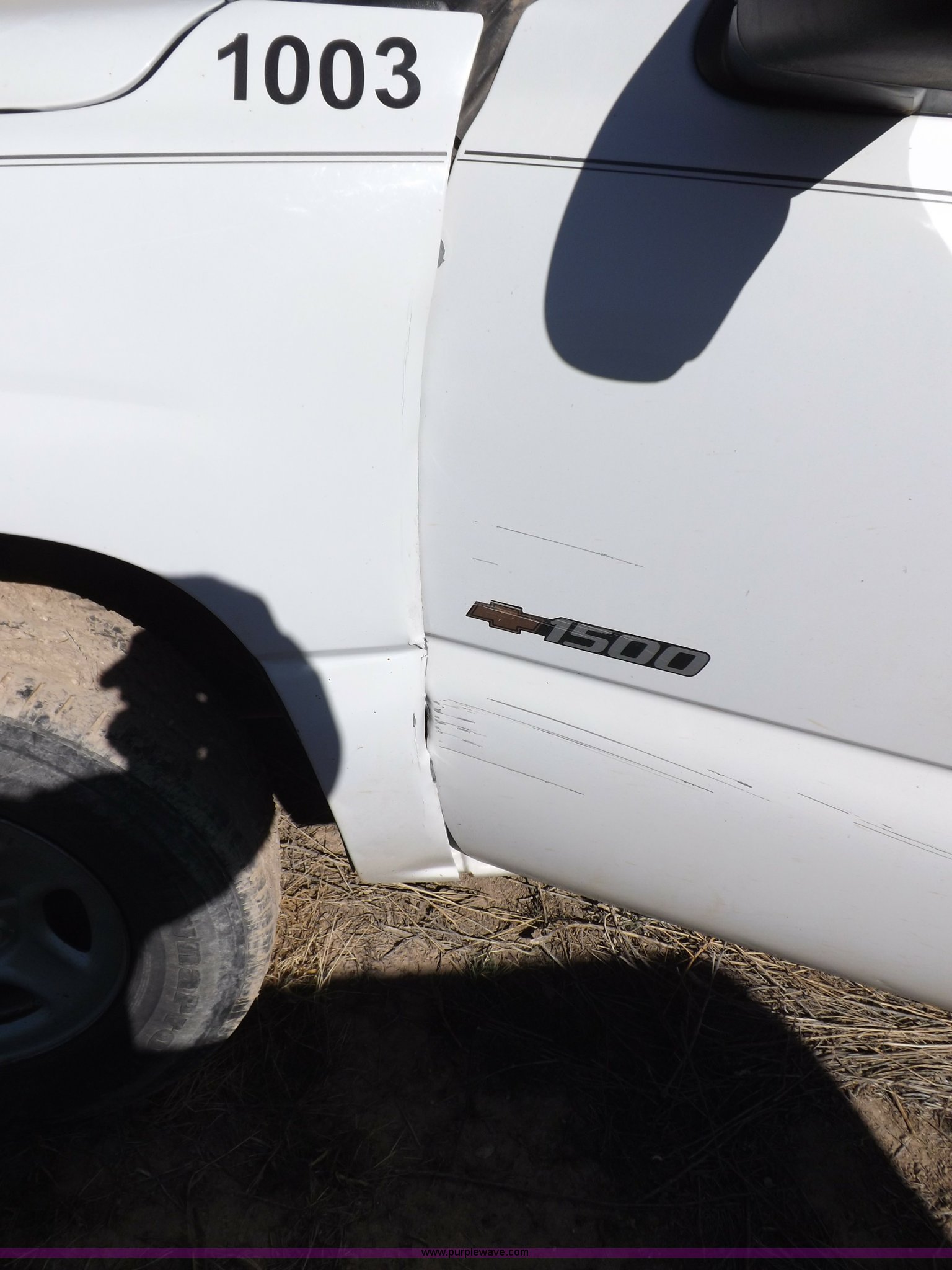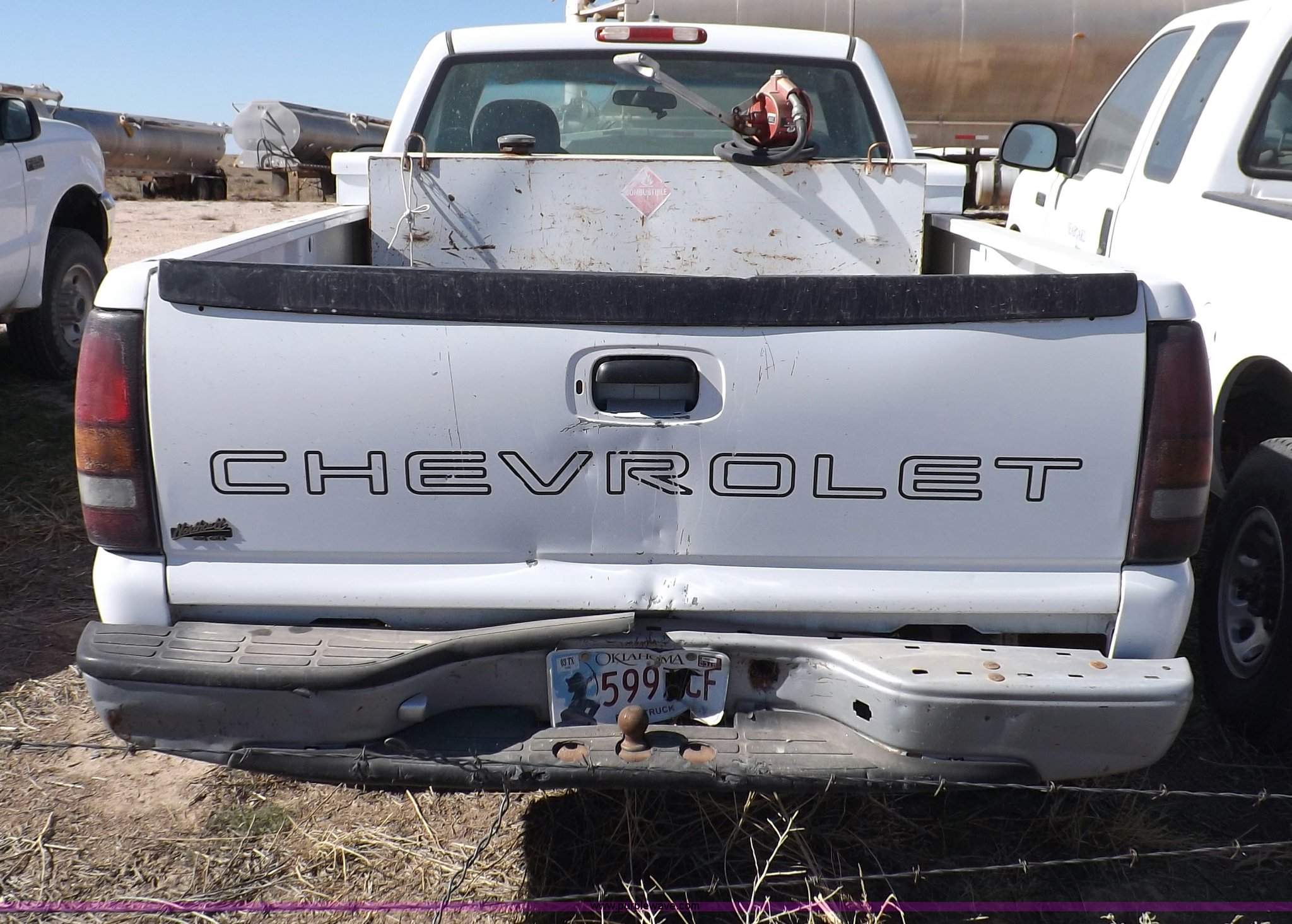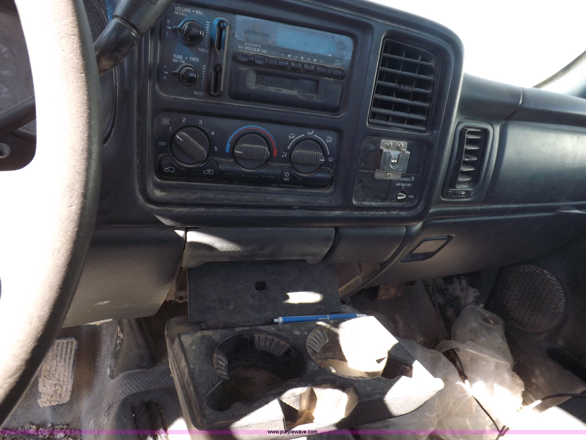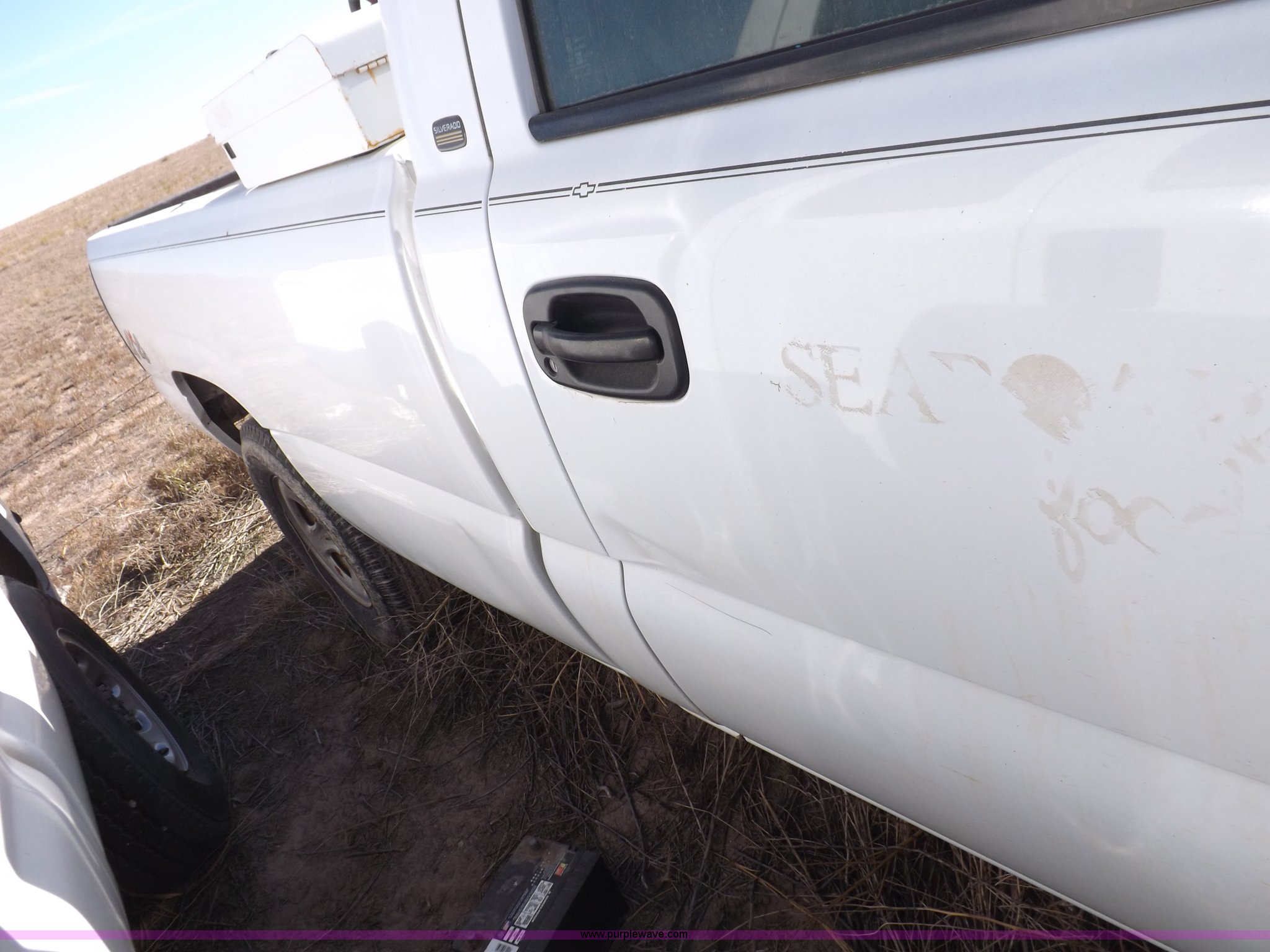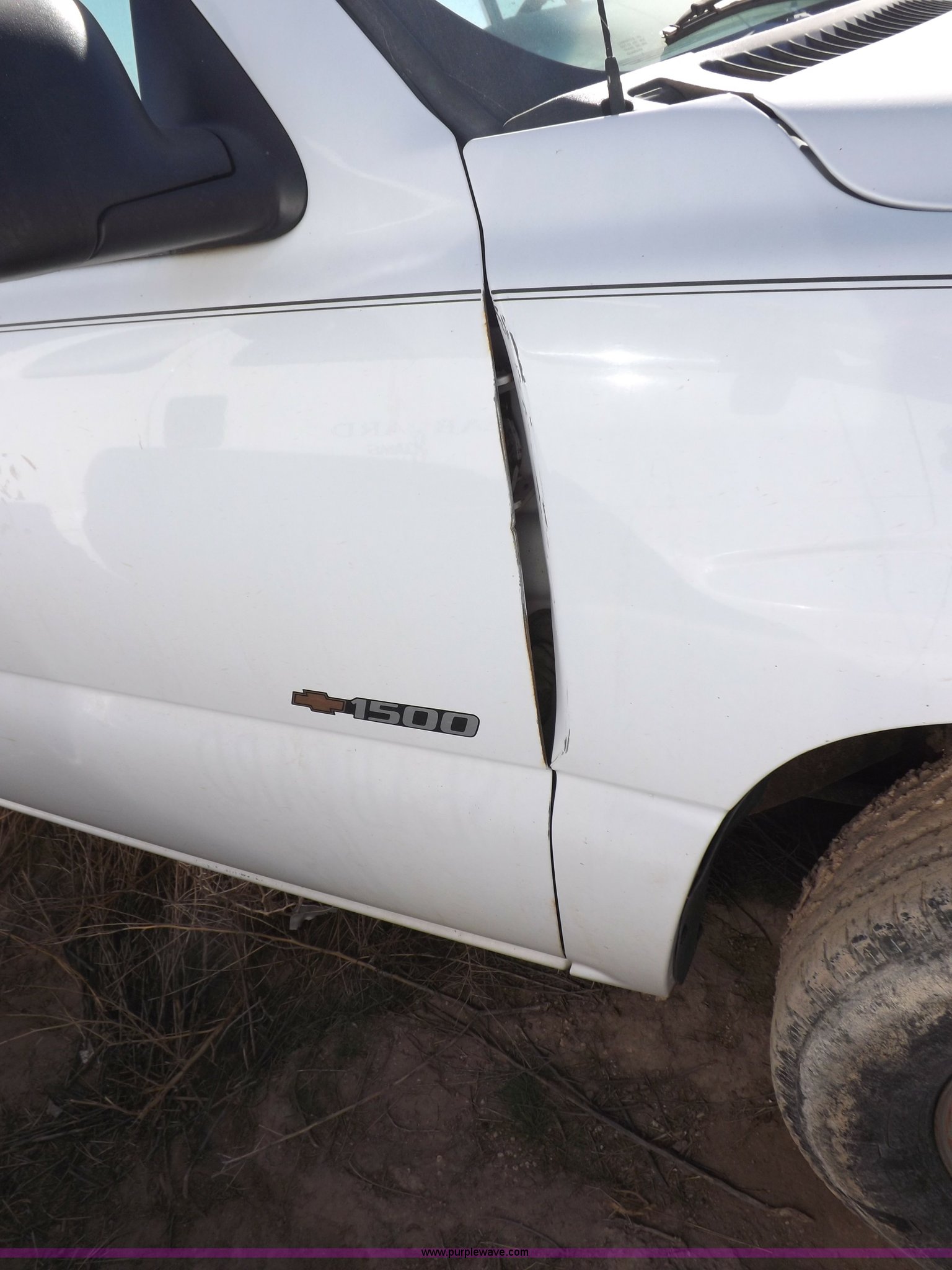 Purple Wave is selling a used Passenger Vehicle in Oklahoma. This item is a 2000 Chevrolet Silverado 1500 pickup truck with the following: Mileage unknown, 4.3L V6 CPI gas engine, Automatic transmission, Four wheel drive, AC and heat, Tilt, Cruise, AM/FM/cassette, Manual windows and locks, Cloth interior, Long bed, Delta toolbox, L-shaped fuel tank with hand pump, Roof drilled for antenna, Interior/exterior cosmetic damage, Driver's door does not shut properly, Needs battery, Seaboard# 1003