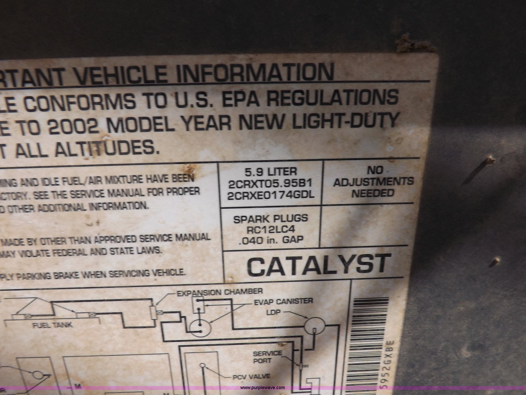 Purple Wave is selling a used Passenger Vehicle in Oklahoma. This item is a 2002 Dodge Ram 1500 Sport Quad Cab pickup truck with the following: 294,958 miles on odometer, 5.9L V8 MPI gas engine, Automatic transmission, Four wheel drive, AC and heat, Tilt, Cruise, AM/FM/CD/cassette, Power windows, locks, mirrors, and seats, Cloth interior, Bed mat, Step bars, Adjustable foot pedals, Receiver hitch, Trailer wiring, 275/55R20 tires, Needs battery, Interior/exterior cosmetic damage, Lower dash disassembled, Seaboard# 5126