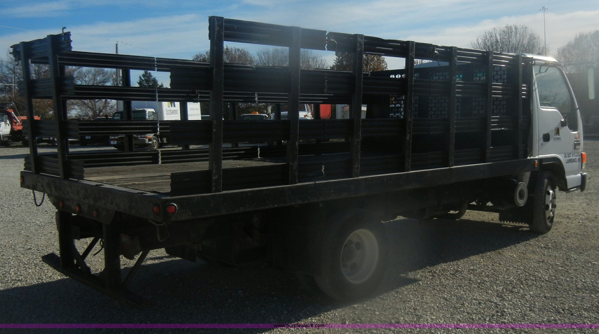 Purple Wave is selling a used Passenger Vehicle in Kansas. This item is a 2002 GMC W3500 flatbed truck with the following: 63,598 miles on odometer, 5.7L V8 EFI gas engine, Automatic transmission, AC and heat, Tilt, AM/FM, Manual windows and locks, Cloth interior, 8' x 173" flatbed, 42"H sides, Wood flooring, Ball hitch, Trailer wiring, 215/85R16 tires, Interior/exterior cosmetic damage, Check engine light on, Paint chipping