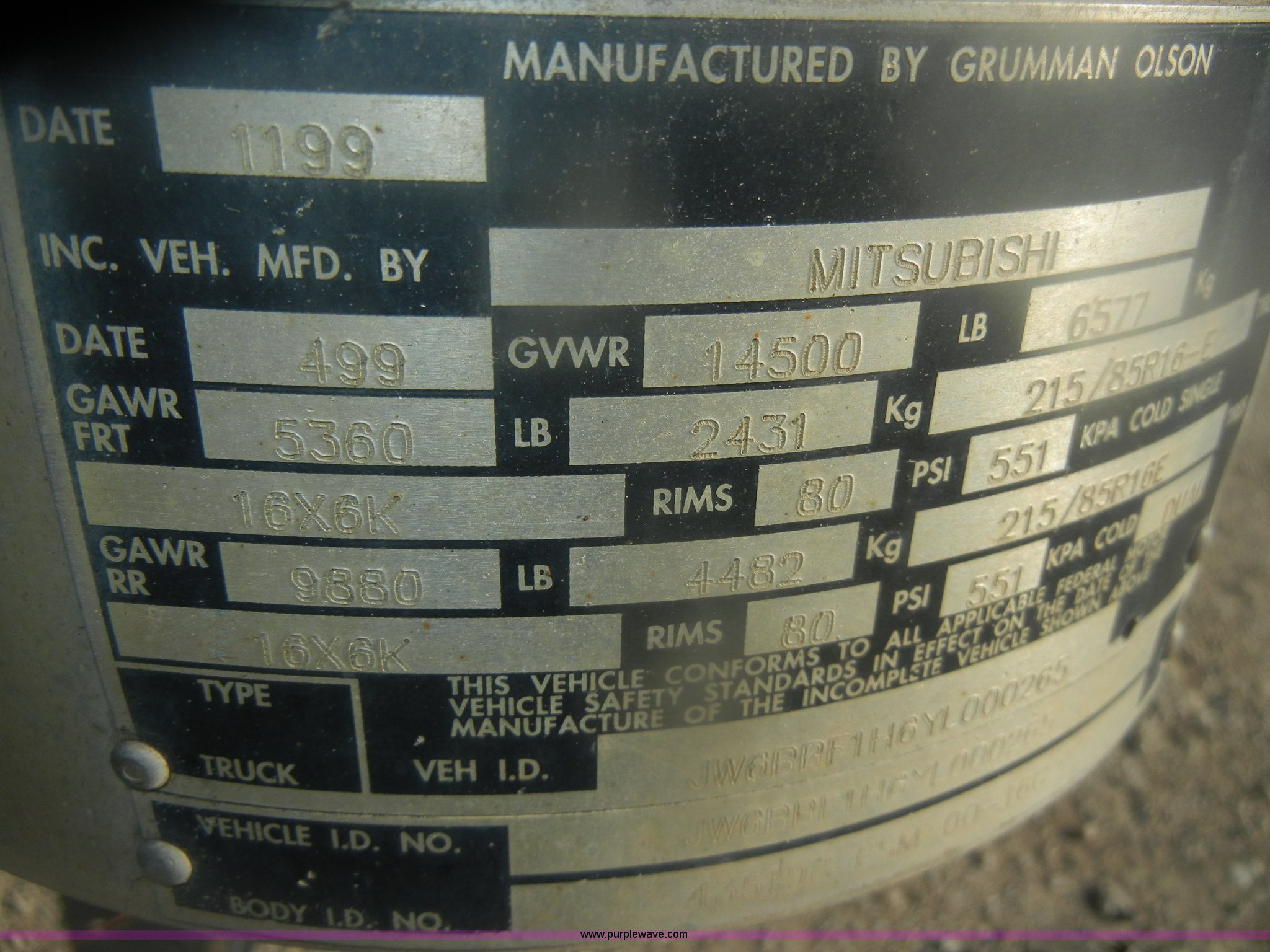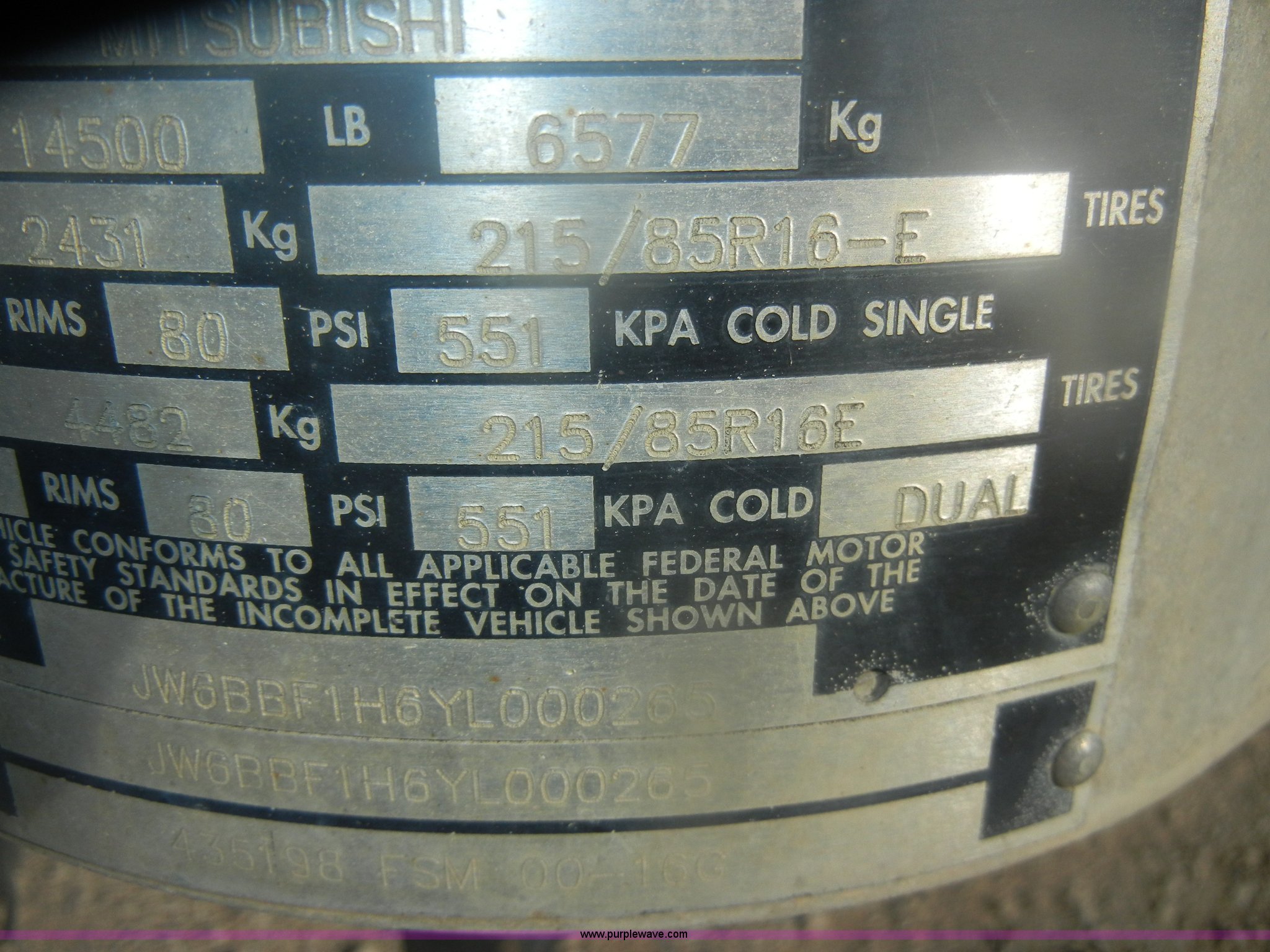 2000 Mitsubishi Fuso FE box truck. 115,437 miles on odometer, Mitsubishi 3.9L L4 turbo air cooled diesel engine, Automatic transmission, AC and heat, Tilt, Power windows and locks, Cloth interior, 1999 Freight Star box 8'L x 198"W, Wood flooring, Roll-up door, Maxon lift gate Model TE20B, 2,000 lb capacity, Serial 0998255C, 215/85R16 tires, GVWR 14,500 lbs, FAWR 5,360 lbs, RAWR 9,880 lbs, Interior cosmetic damage, Stereo missing. Vehicle has an E-Title in the State of Kansas. Buyer will receive paper title within 30 days from verification of funds. JW6BBF1H6YL000265. Shipping quotes available. First Management, Inc.. 429 N Iowa St. Lawrence, KS 66049