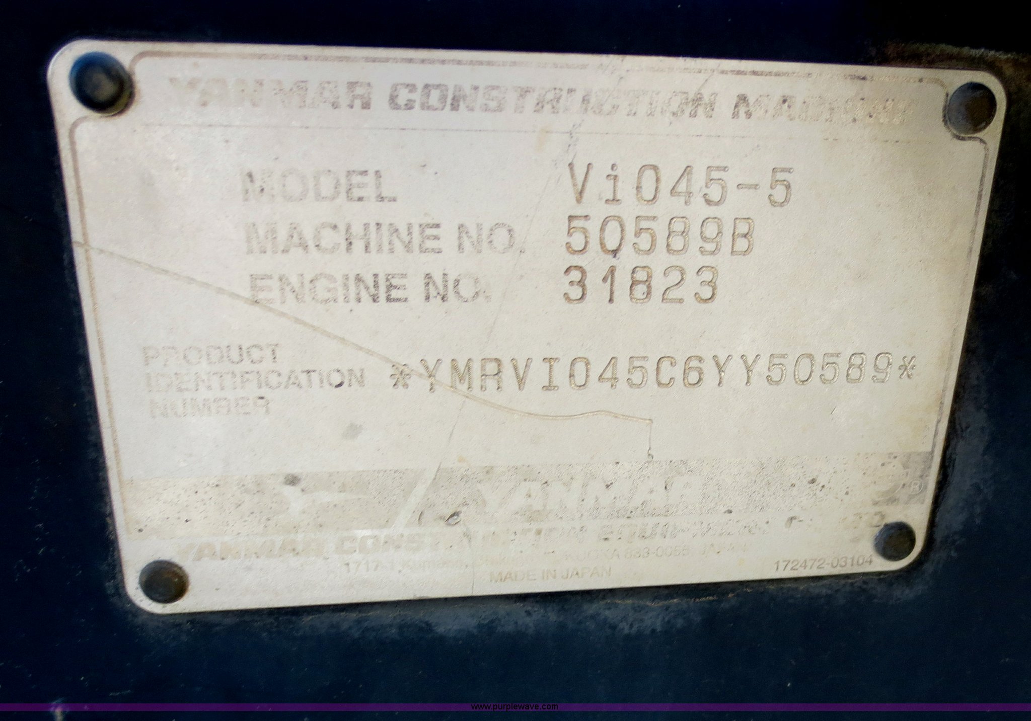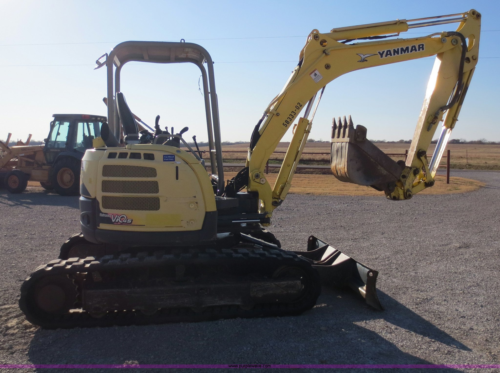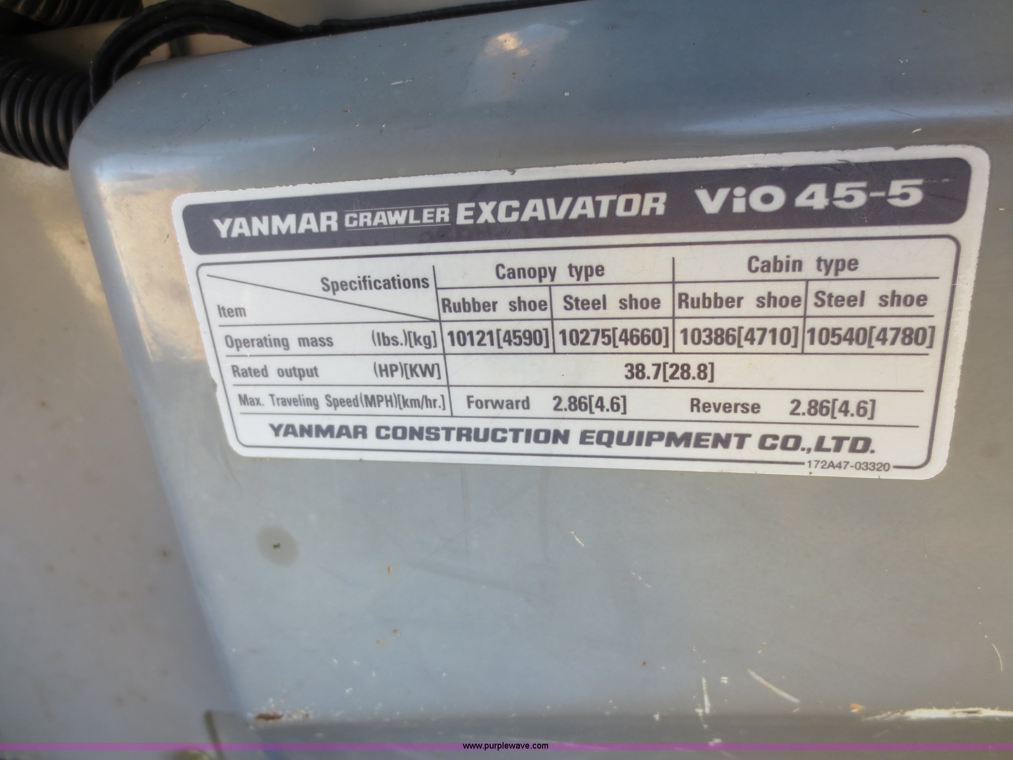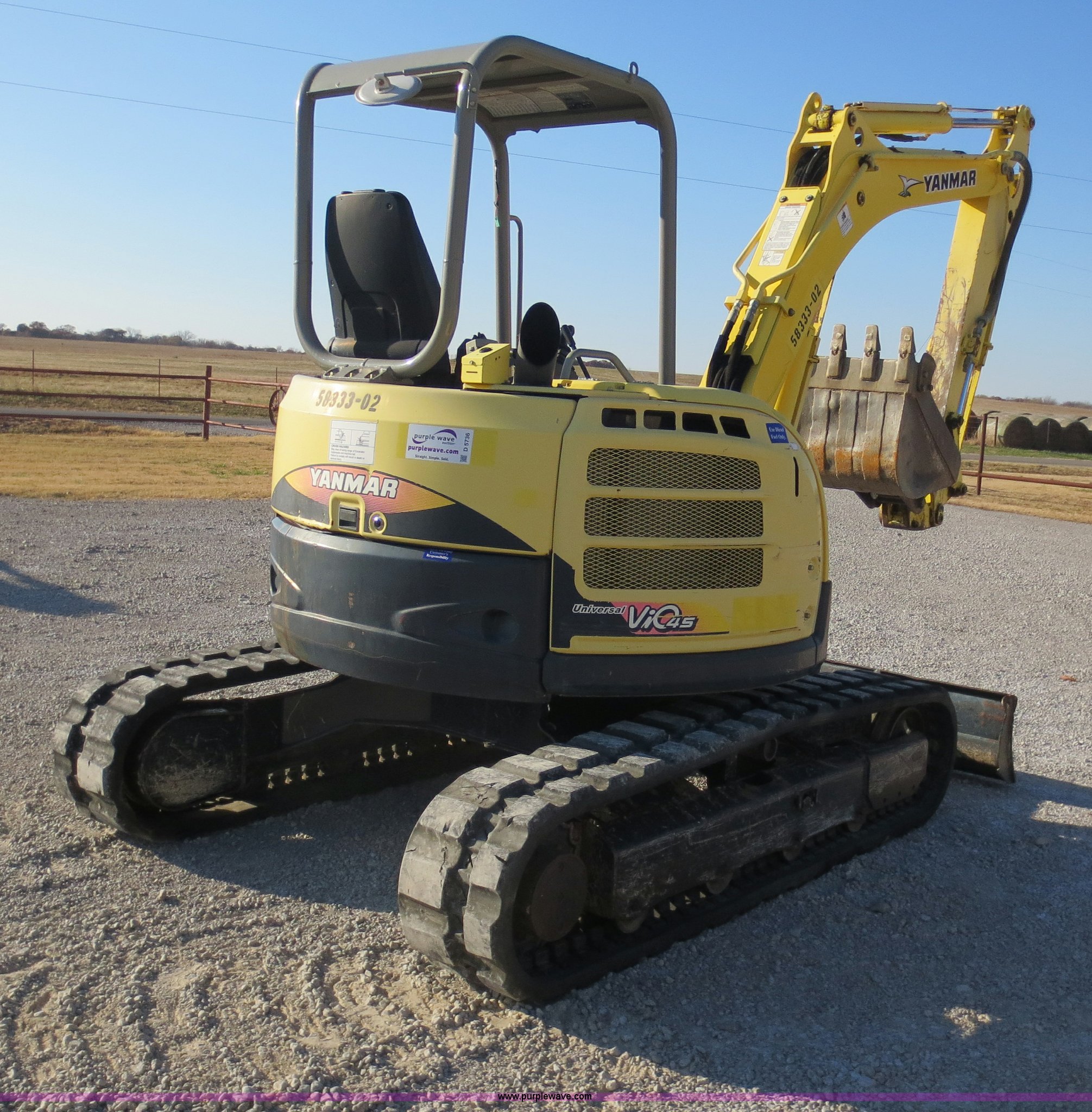 Purple Wave is selling a used Mini Excavator in Oklahoma. This item is a 2006 Yanmar VIO45-5 mini excavator with the following: 2,266 hours on meter, Hours may vary, Yanmar 2.19L four cylinder diesel engine, Serial 31823, Hydraulic quick attach bucket, Auxiliary boom hydraulics, 77" knock down blade, 20" toothed bucket, ZHS zero house swing, 13" rubber tracks, Approx. 100 hours on tracks, 10,121 lbs. base operating weight, PIN YMRV1045C6YY50589, Serial 50589B