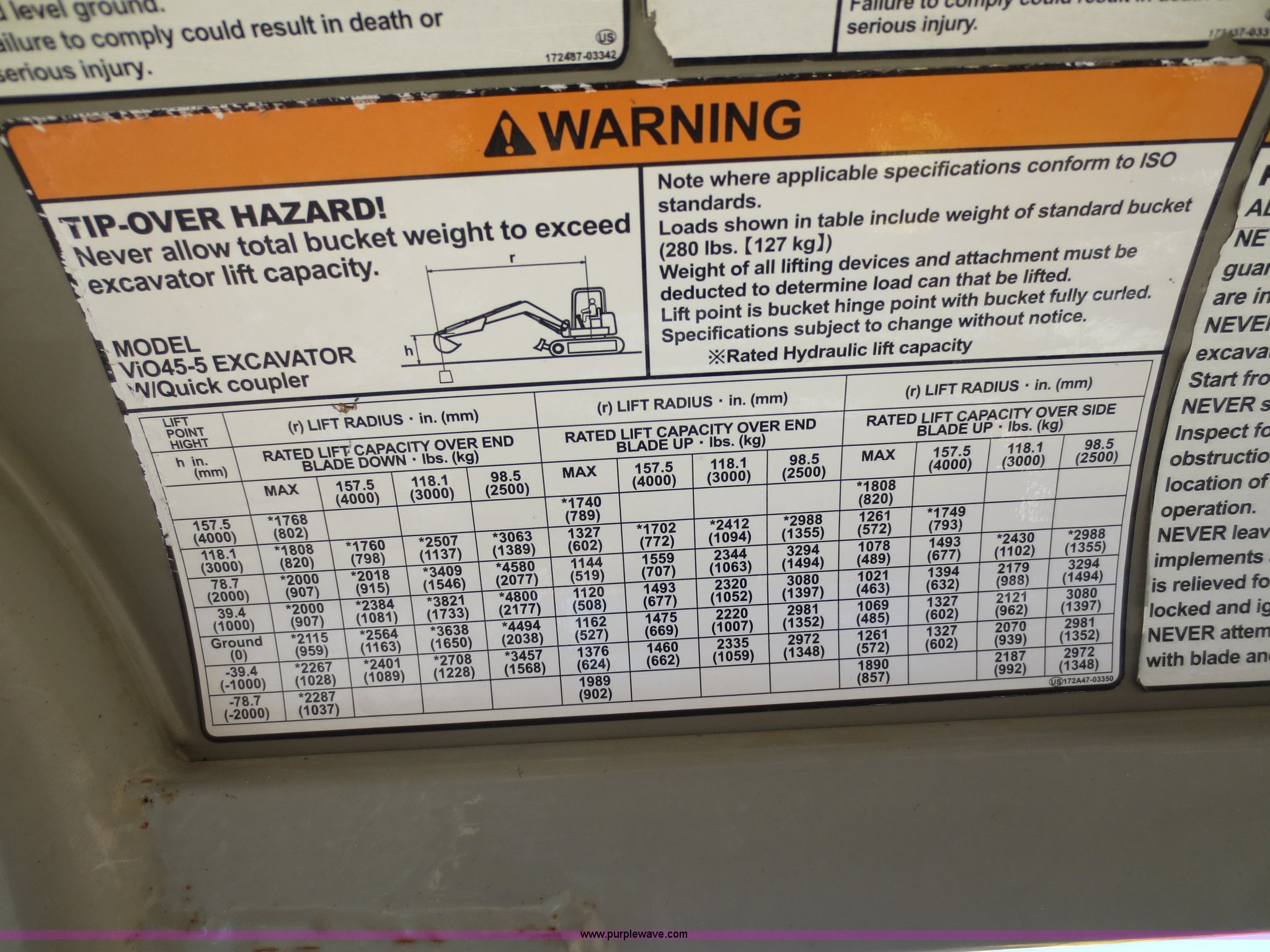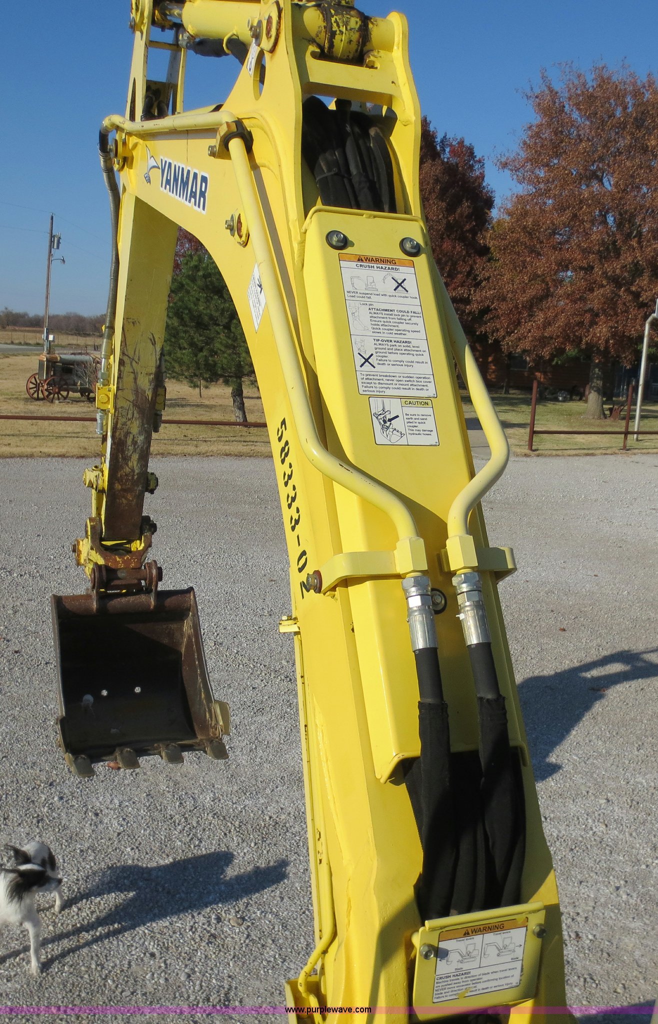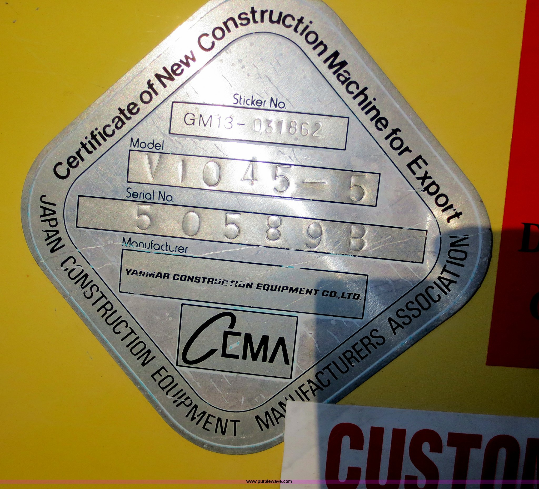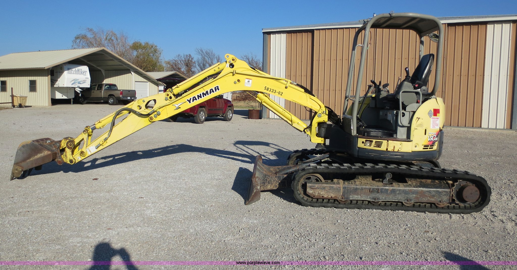 Purple Wave is selling a used Mini Excavator in Oklahoma. This item is a 2006 Yanmar VIO45-5 mini excavator with the following: 2,266 hours on meter, Hours may vary, Yanmar 2.19L four cylinder diesel engine, Serial 31823, Hydraulic quick attach bucket, Auxiliary boom hydraulics, 77" knock down blade, 20" toothed bucket, ZHS zero house swing, 13" rubber tracks, Approx. 100 hours on tracks, 10,121 lbs. base operating weight, PIN YMRV1045C6YY50589, Serial 50589B