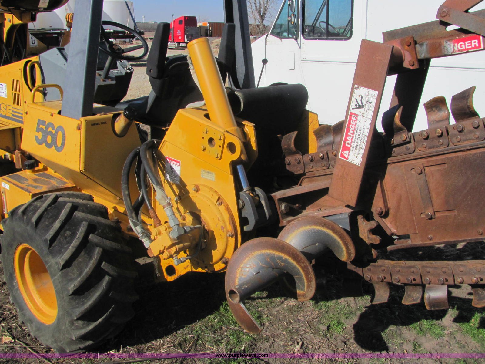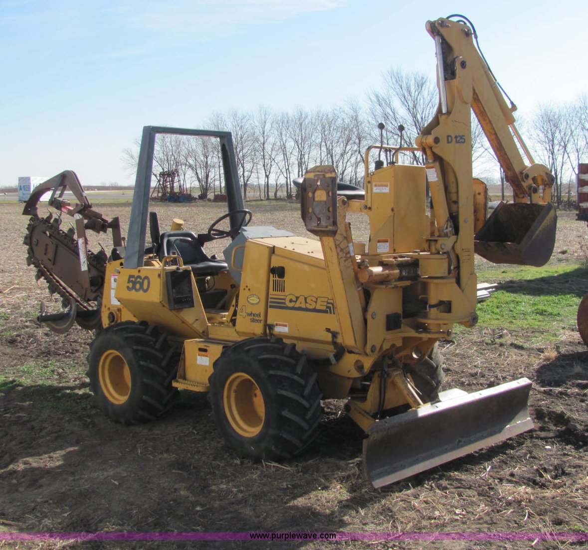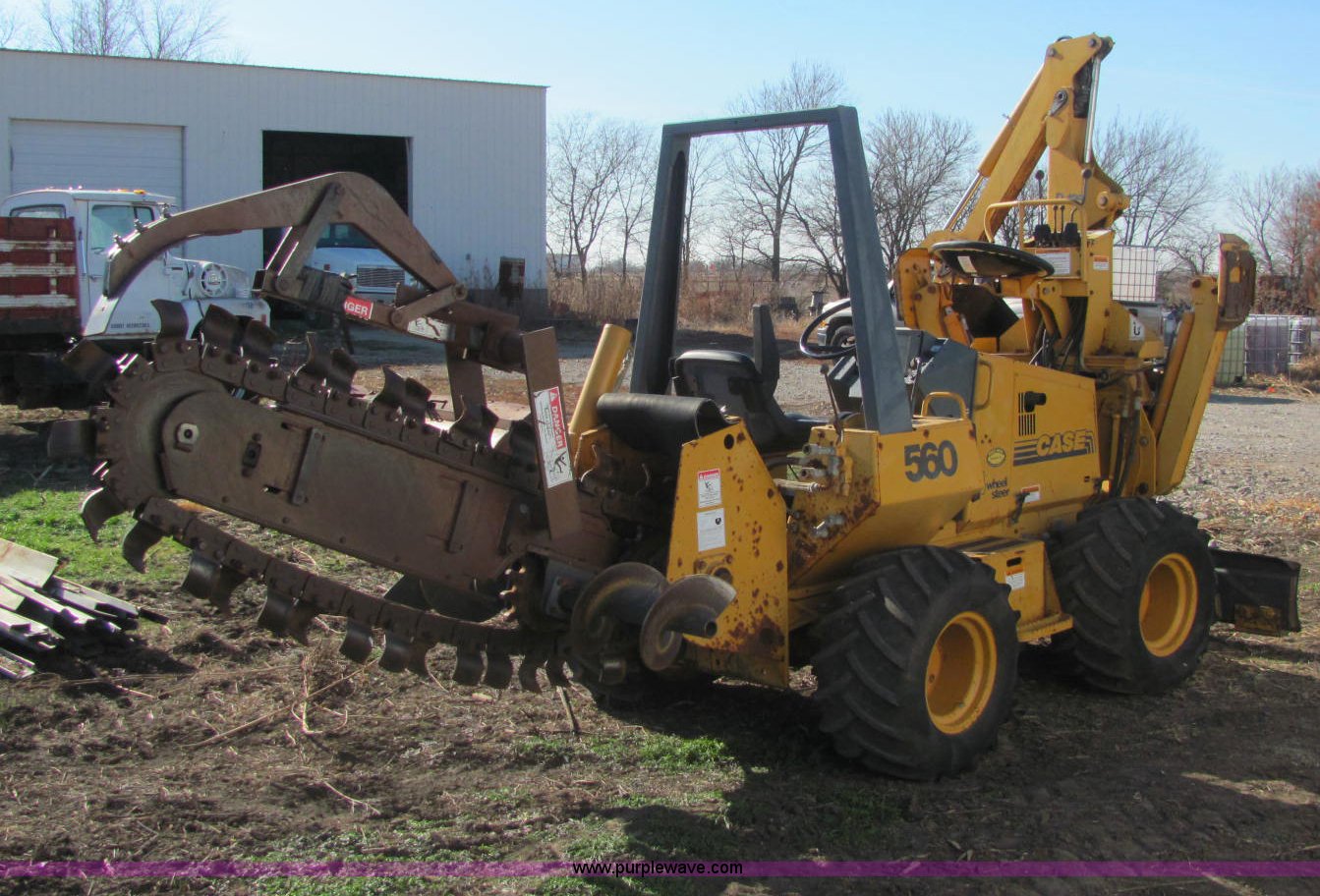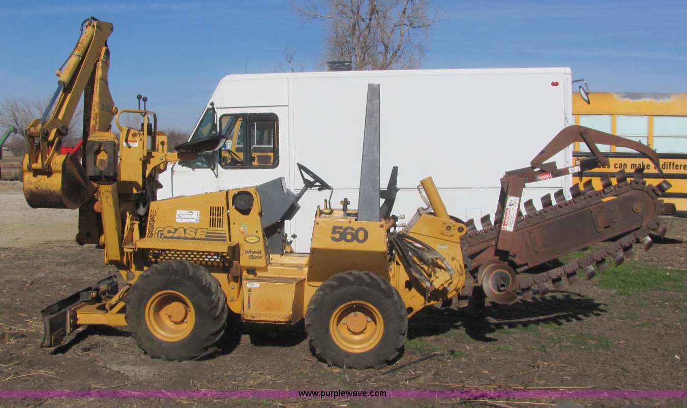 Purple Wave is selling a used Trencher or Rock Saw in Kansas. This item is a 1996 Case 560 trencher with the following: 1,825 hours on meter, Kubota V2203 four cylinder diesel engine, 46 HP, Hydrostatic transmission, ROPS bar, Four wheel steering, Rear auxiliary hydraulics, 72" six-way blade, D125 backhoe, Model H939218, Four stick hydraulic control, 17" four tooth bucket, Hydraulic outriggers, 560 trencher, Model H939307560, Two stick hydraulic control, 72" maximum trenching depth, 6" trenching width, 12" diameter side discharge auger, Serial JAF0178321, 7,000 lbs. base operating weight, Serial JAF0166246