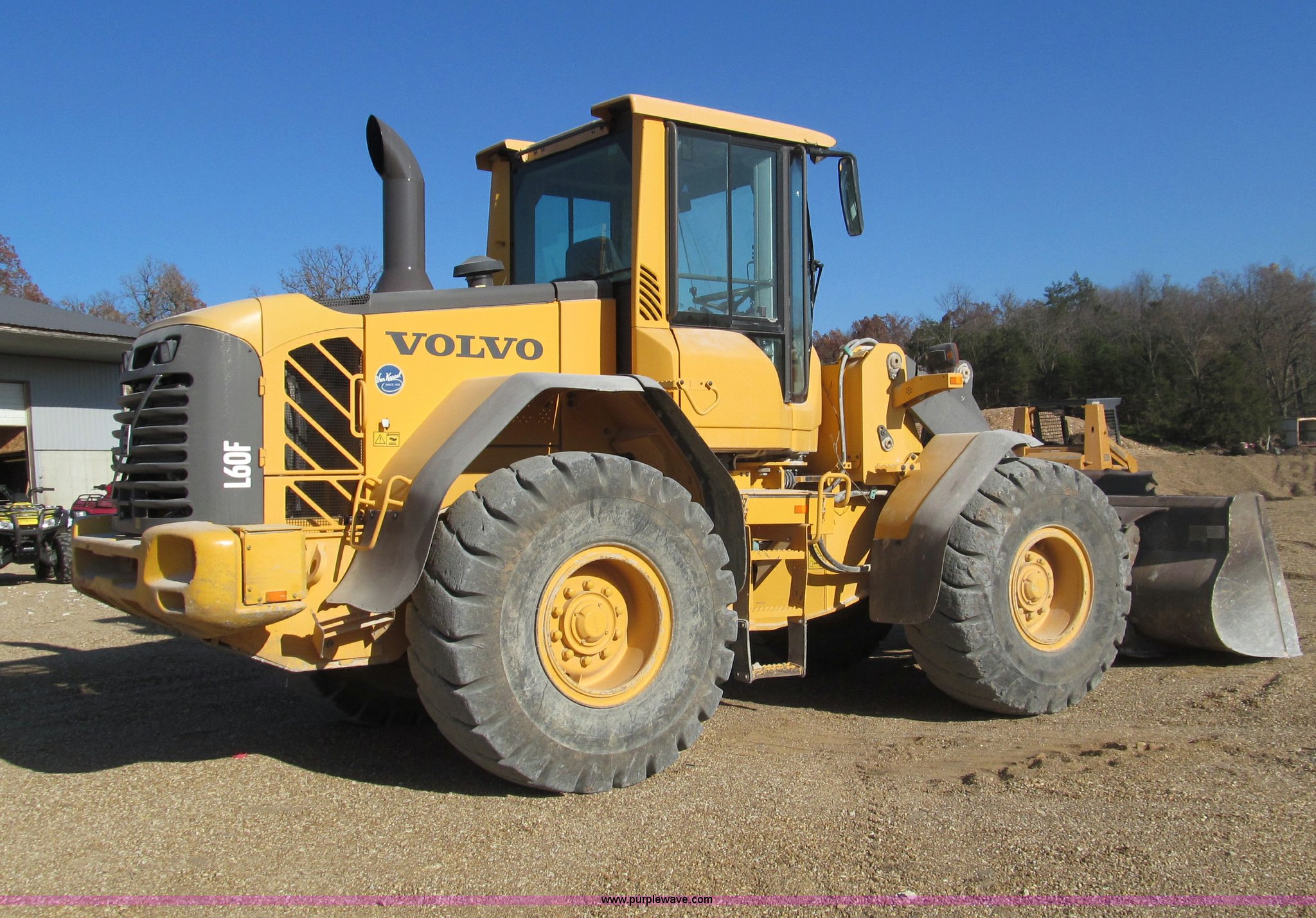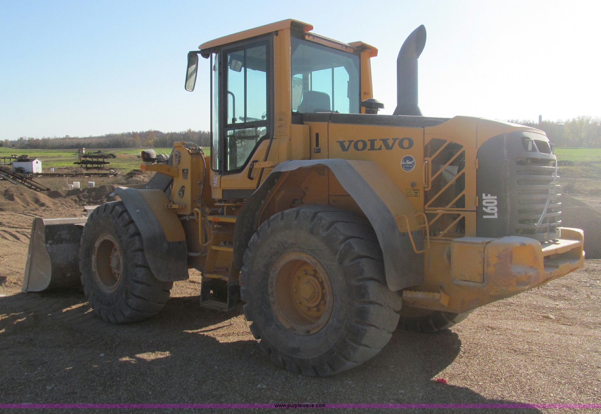 Purple Wave is selling a used Wheel Loader in Missouri. This item is a 2007 Volvo L60F wheel loader with the following: 5,936 hours on meter, Volvo D6E LC3 diesel engine, 158 HP, Automatic powershift transmission, Enclosed cab, AC, 96" bucket, 2.8 cu. yd. capacity, Quick attach, Volvo hydraulic attachment bracket for buckets and hydraulic attachments, Third valve, Volvo wet circulation cooled disc brakes, 20.5-25 tires, 24,000 lbs. base operating weight, Serial L60FV61555