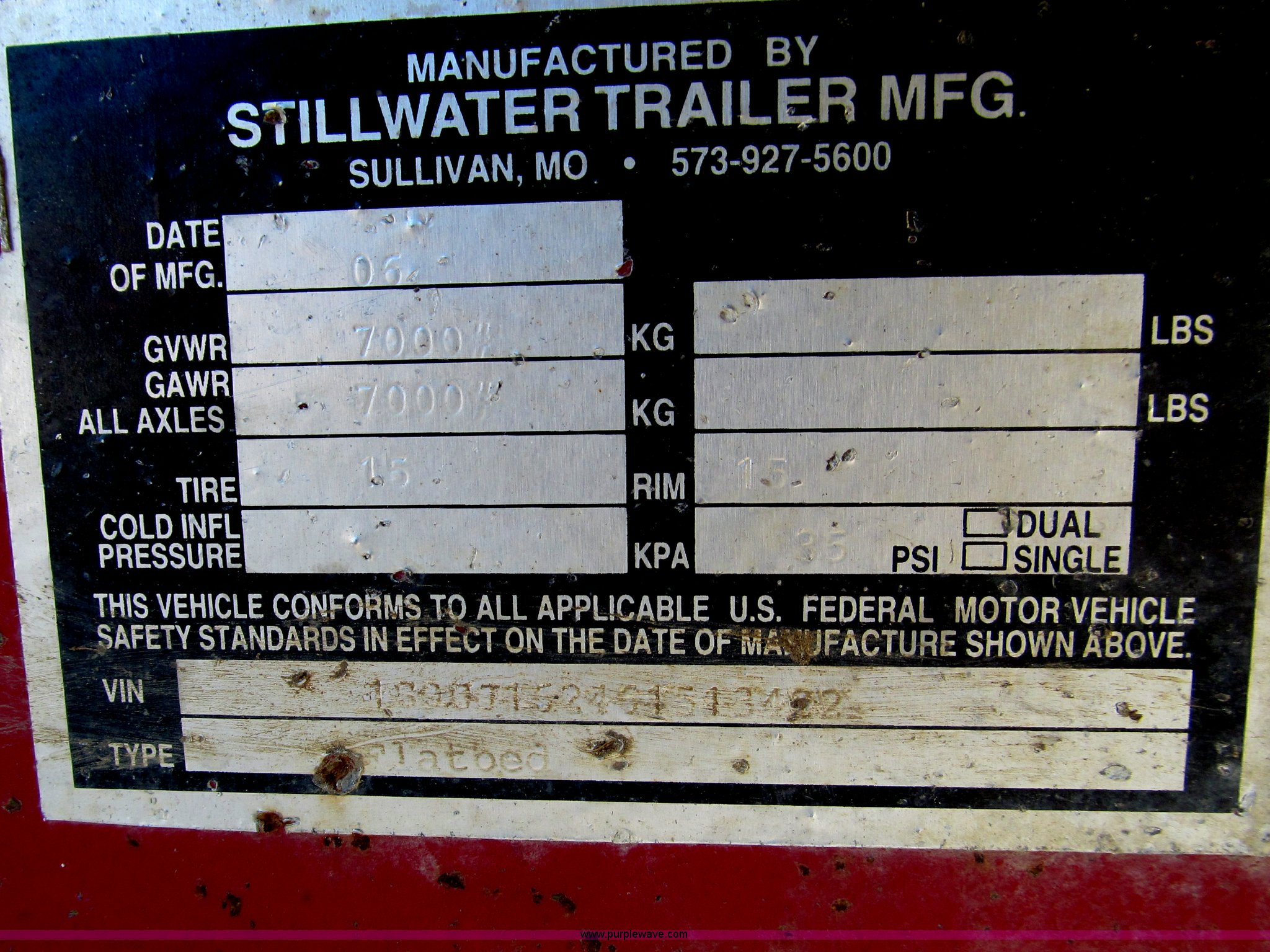 Purple Wave is selling a used Car or Utility Trailer in Missouri. This item is a 2006 Stillwater 16' flatbed trailer with the following: 80"W, Oak floor, 54" expanded metal fold down ramp, 2 5/16" ball hitch, Front storage locker, P235/75R15 tires, GVWR 7,000 lbs