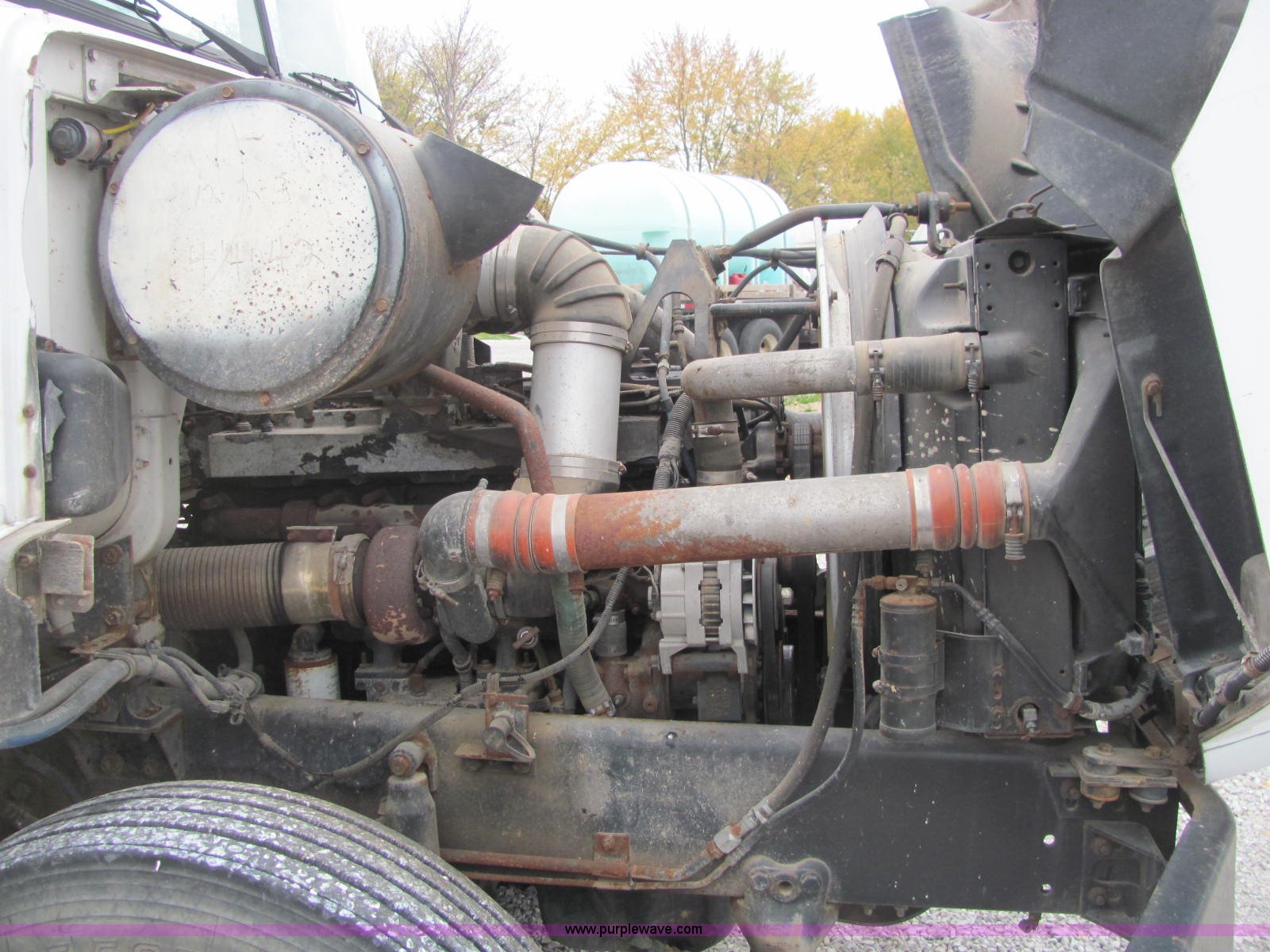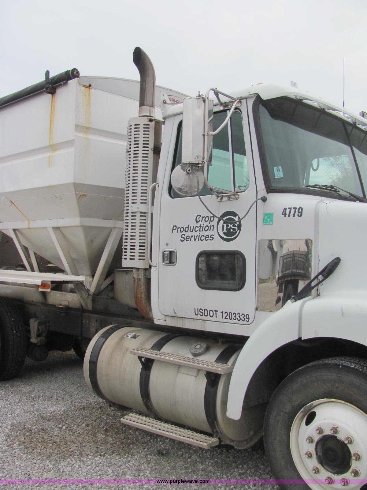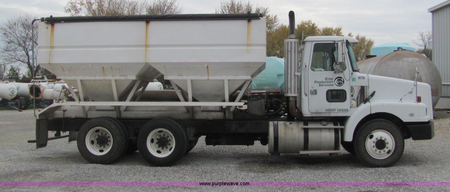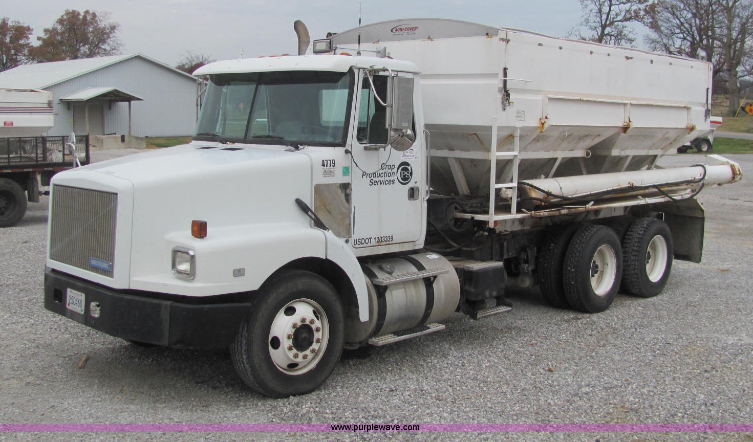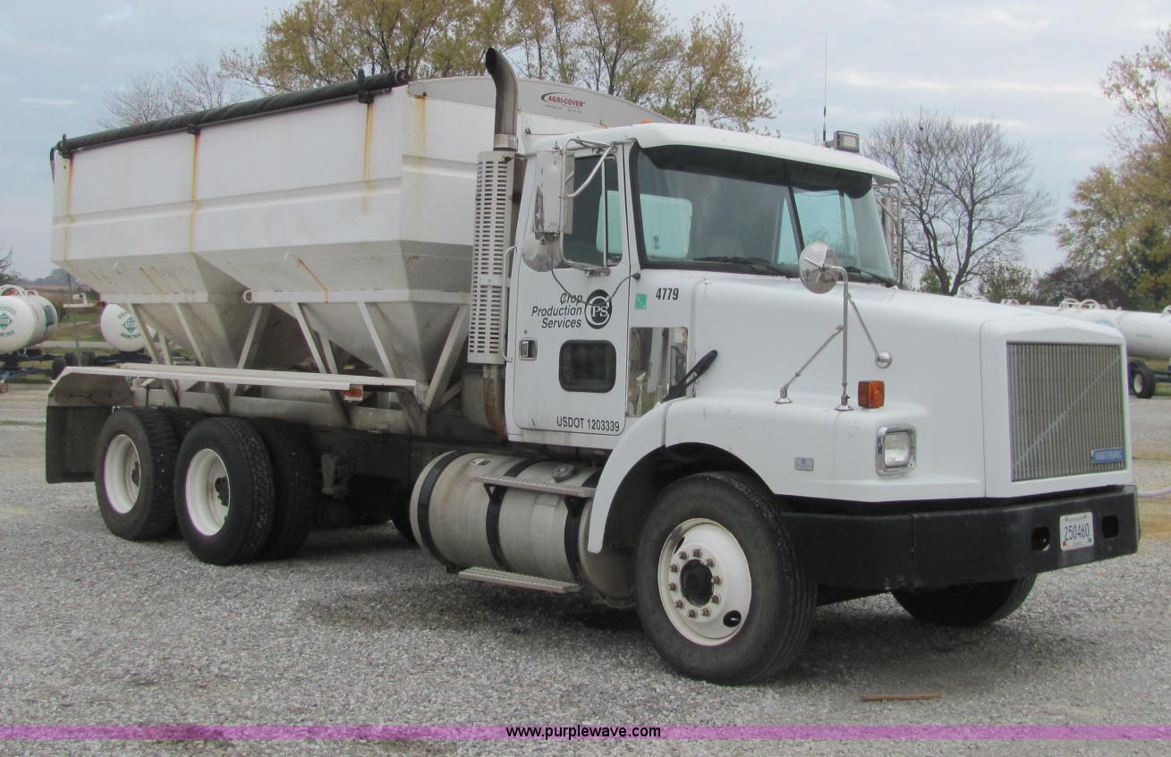 1995 Volvo White GMC WG fertilizer tender truck. 458,896 miles on odometer, Cummins M11 10.8L L6 330 HP diesel engine Serial 34744320, Eaton Fuller 10 speed manual transmission, AC and heat, Cruise, AM/FM/CD, Air suspension seat, Heated mirrors, Passenger daylight door, Block heater, Kenwood CB radio, 16' Dual bin tender 17'L x 10"D auger, Access ladders, Agri cover SRT-2 rollover tarp, Differential lock, Fifth wheel lock, Dual fuel tanks 100 and 130 gallon, PTO, Wet kit, Air suspension, Air brakes, 295/75R22.5 tires, 158" wheel base, 50,000 lbs GVWR, 12,000 lbs FAWR, 19,000 lbs IAWR, 19,000 lbs RAWR. Title distribution may be delayed up to 30 days from verification of funds. 4V1JDBPF7SR834779. Shipping quotes available. Crop Production Services Franklin. 2169 Springfield Road. Franklin, KY 42134