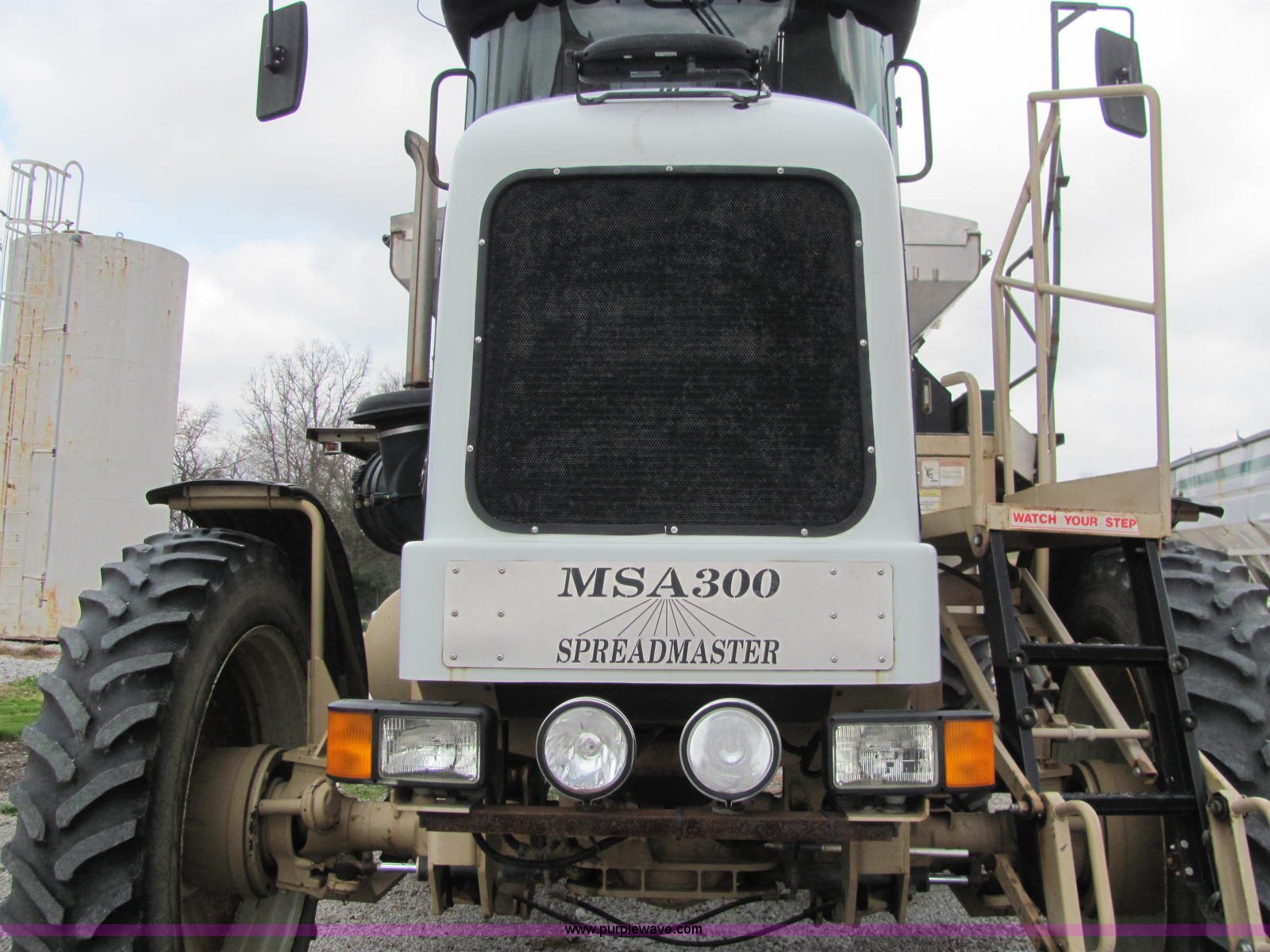 2006 Mertz MSA300 Spreadmaster spreader. 2,485 hours on meter, Cummins QSC six cylinder 305 HP diesel engine, Automatic transmission, AC and heat, AM/FM/cassette, Raven Industries Smartrax guidance system, Cruise, PTO, Wet kit, Work lights, Wipers, Air suspension, Air brakes, Hightway Equipment New Leader G4 spreader Model L3020G4-13, Dual spinners, 24"W linked conveyor, Hydraulic operation, 60' lime and 90' fertilizer spread pattern, Serial 123726, 100 gallon fuel tank, GoodYear 380/85R46 tires, Serial MSA0601024, Unit# 40191. Shipping quotes available. Crop Production Services Russlleville. 485 Payton St.. Russellville, KY 42276