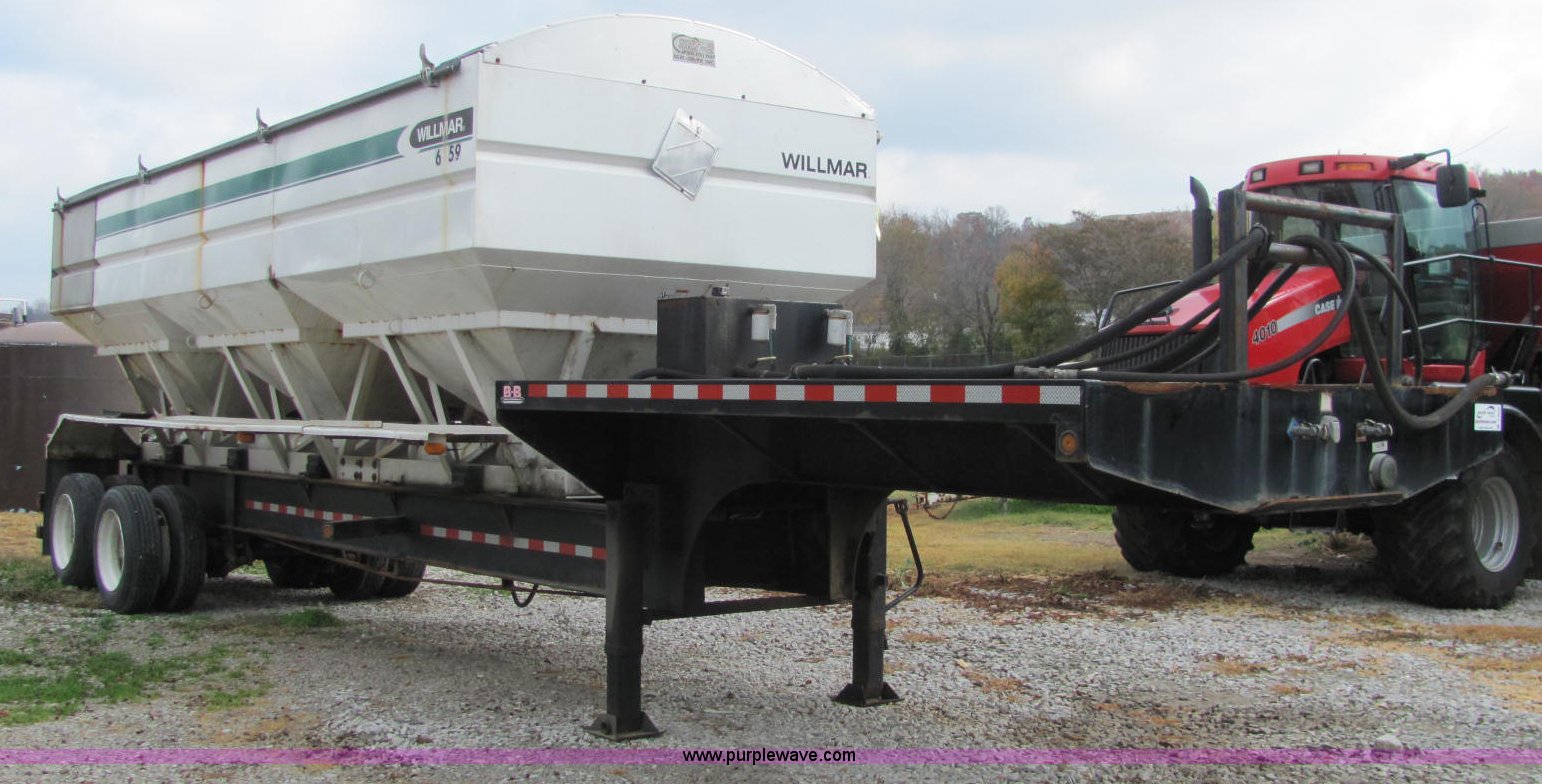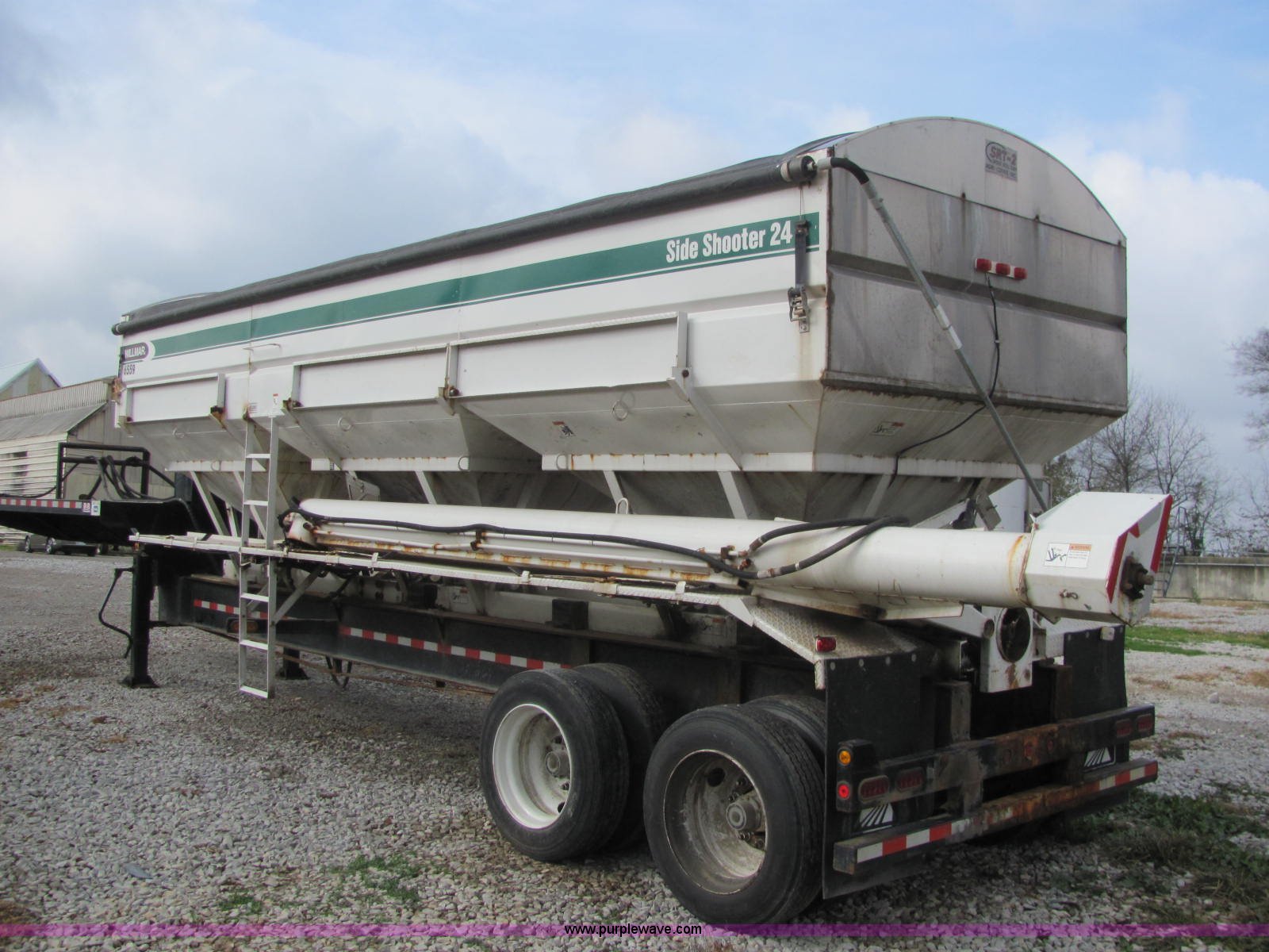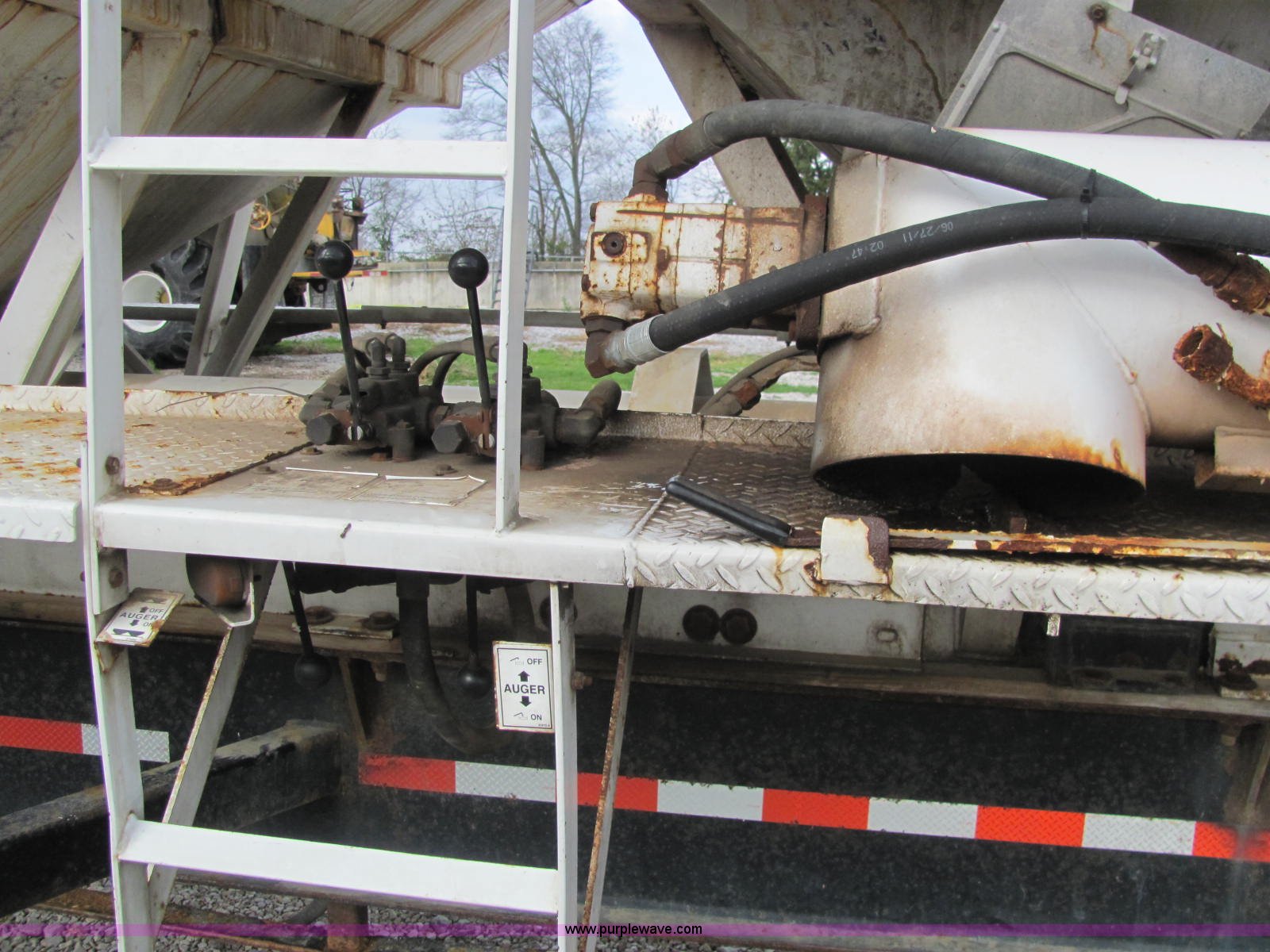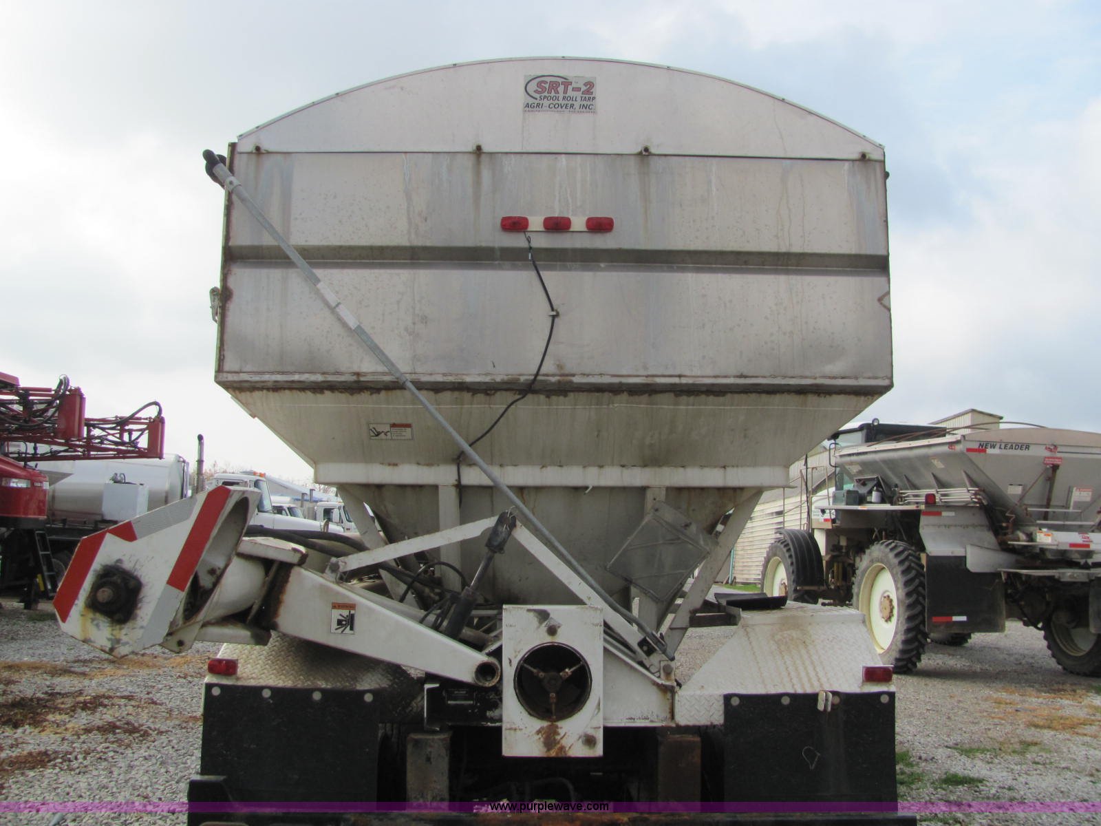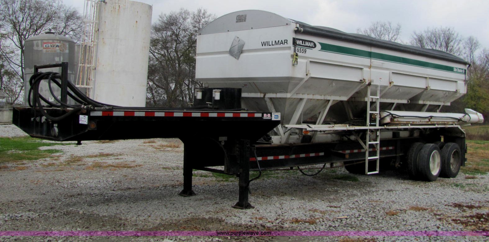 Purple Wave is selling a used Fertilizer or Feed Delivery Trailer in Kentucky. This item is a 2008 B-B Behnke tandem axle tender trailer with the following: 25'L x 8'W main deck, 11'L x 8'W top deck, 36'L overall length, Steel frame with wood decking, Manual landing gear, Spring suspension, Air brakes, Willmar Side Shooter 24 tender, 24'L, 24 ton capacity, Triple bin, 17'L x 10"D auger, (4) lever hydraulic control, Agri-Cover SRT-2 roll over tarp, 255/70R22.5 tires, 45,000 lbs GVWR, Serial 22049