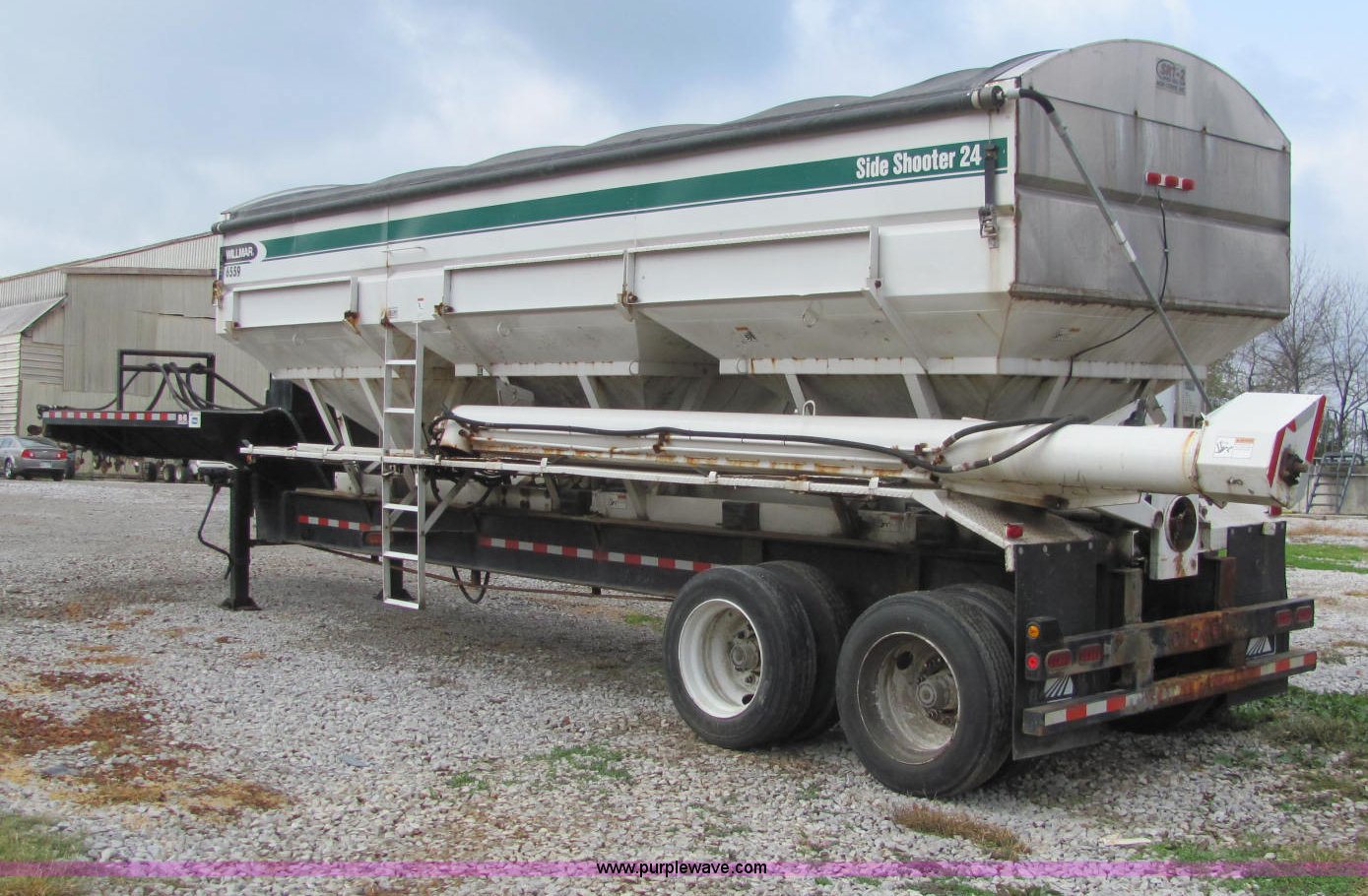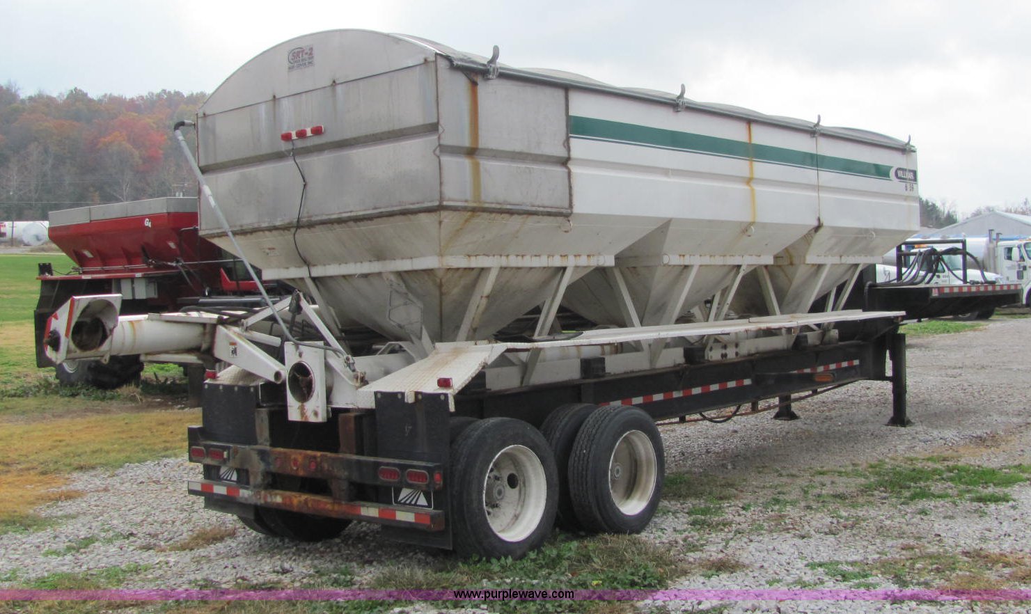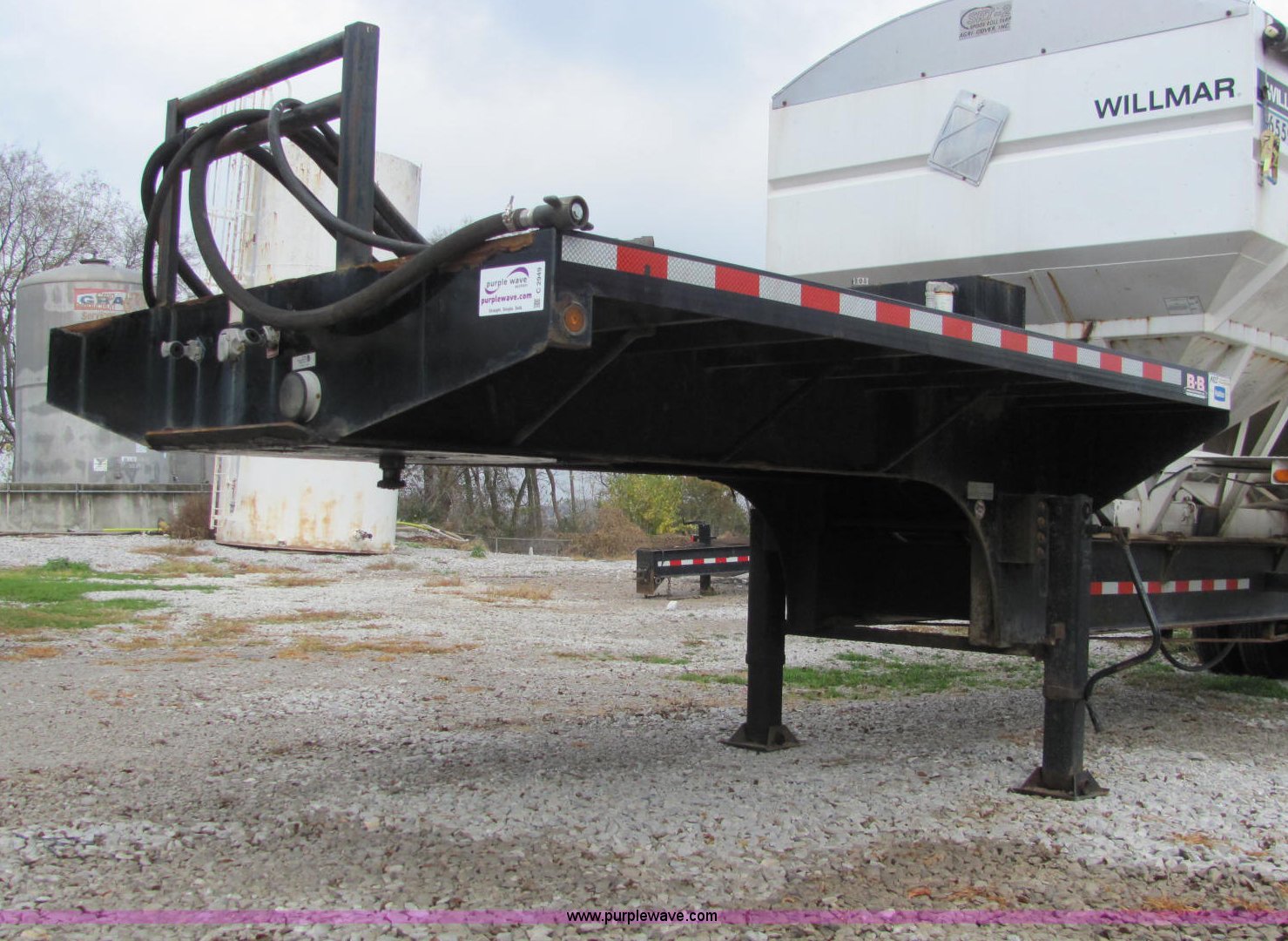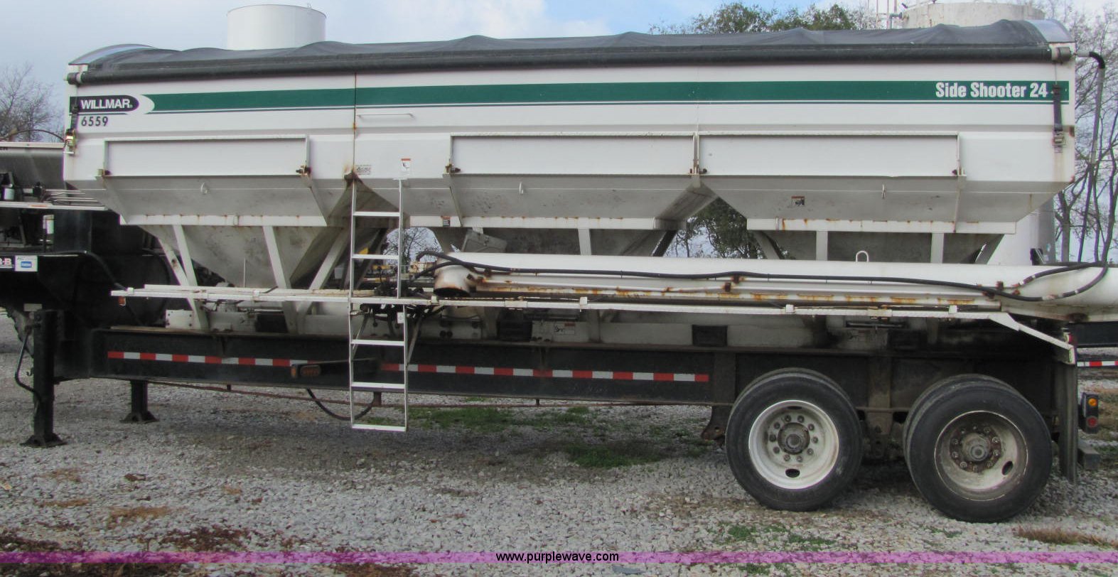 Purple Wave is selling a used Fertilizer or Feed Delivery Trailer in Kentucky. This item is a 2008 B-B Behnke tandem axle tender trailer with the following: 25'L x 8'W main deck, 11'L x 8'W top deck, 36'L overall length, Steel frame with wood decking, Manual landing gear, Spring suspension, Air brakes, Willmar Side Shooter 24 tender, 24'L, 24 ton capacity, Triple bin, 17'L x 10"D auger, (4) lever hydraulic control, Agri-Cover SRT-2 roll over tarp, 255/70R22.5 tires, 45,000 lbs GVWR, Serial 22049