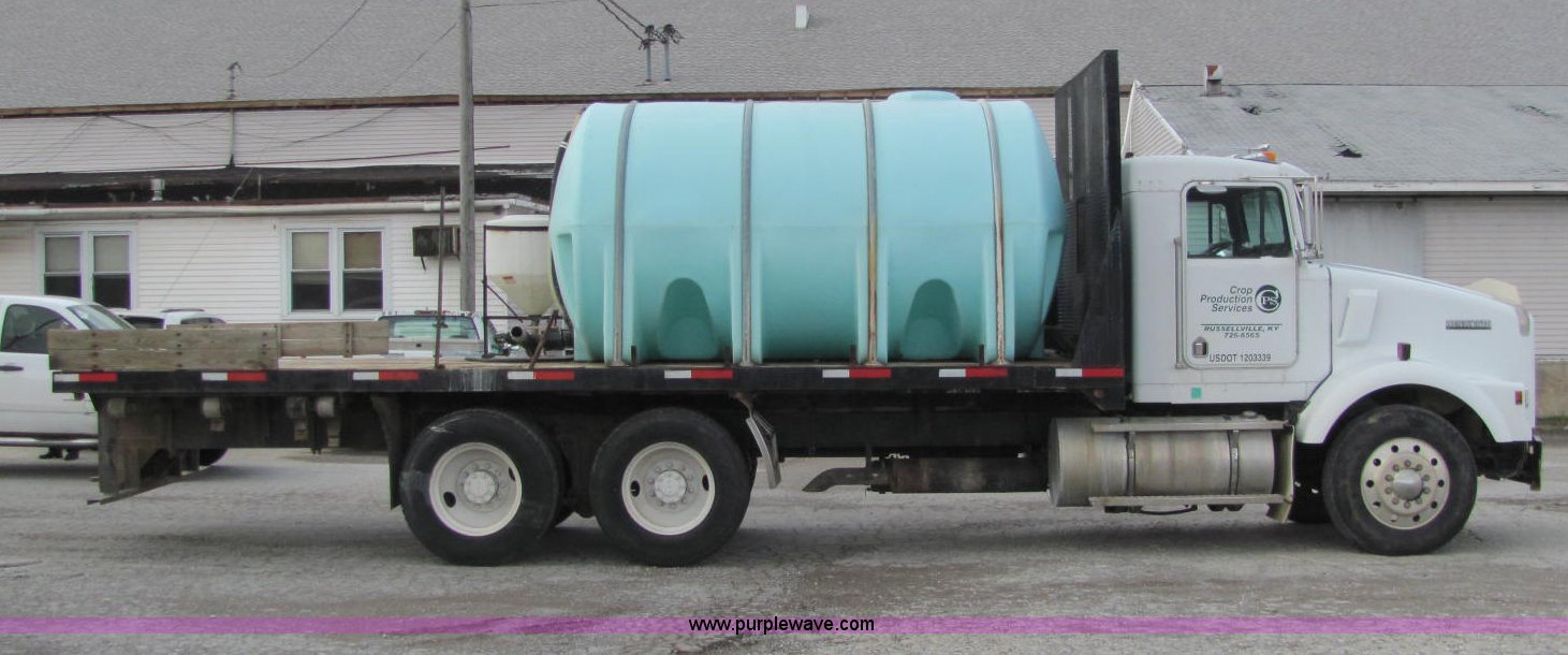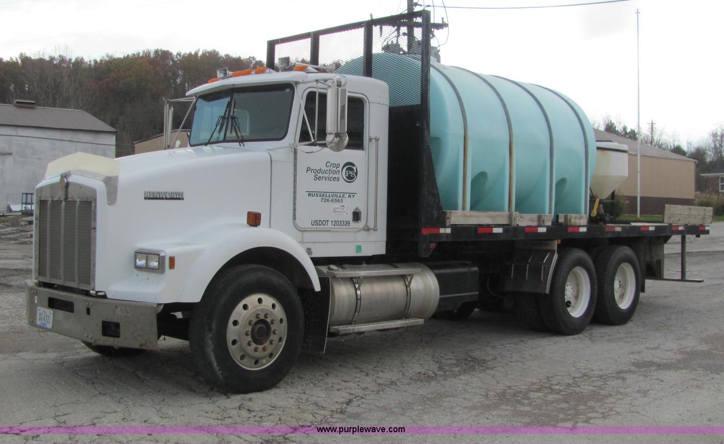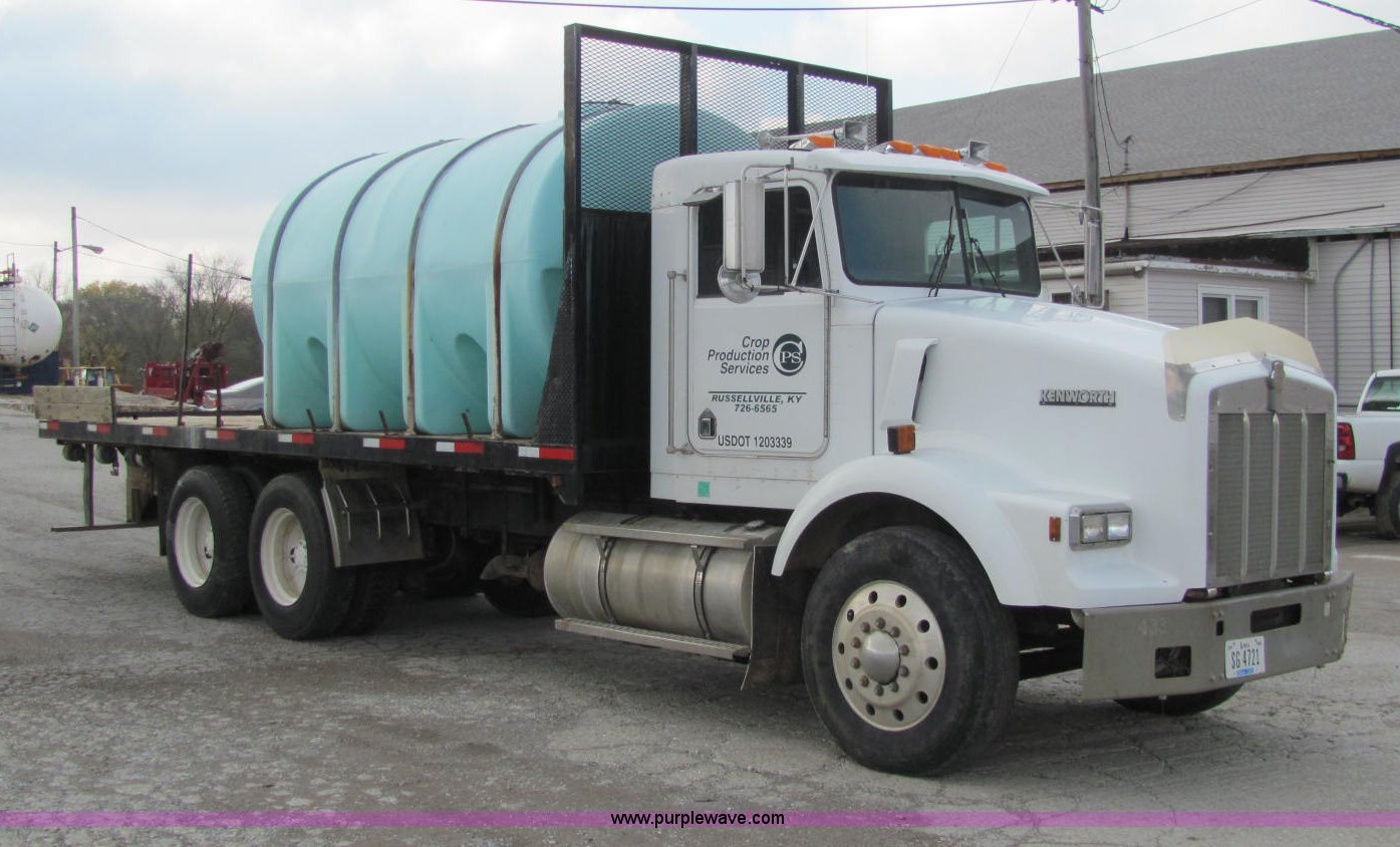 Purple Wave is selling a used Flat Bed Truck in Kentucky. This item is a 1994 Kenworth T8000 flatbed truck with the following: 937,927 miles on odometer, Cummins N14-410 14.0L L6 diesel engine, Eaton Fuller manual transmission, AC and heat, AM/FM/cassette, Cruise, Heated mirrors, Idle control, Visor, Block heater, Dual 120 gallon fuel tanks, Air suspension, Air brakes, Jake brake, 24'L x 8'W flatbed, Steel frame with wood decking, 3,200 gallon poly tank, 3" plumbing, 60 gallon poly feeder tank, 2" plumbing, Pin hitch, Trailer wiring, 11R24.5 tires, 228" wheel base, 50,000 lbs GVWR, 12,000 lbs FAWR, 19,000 lbs IAWR, 19,000 lbs RAWR, Unit# 40187