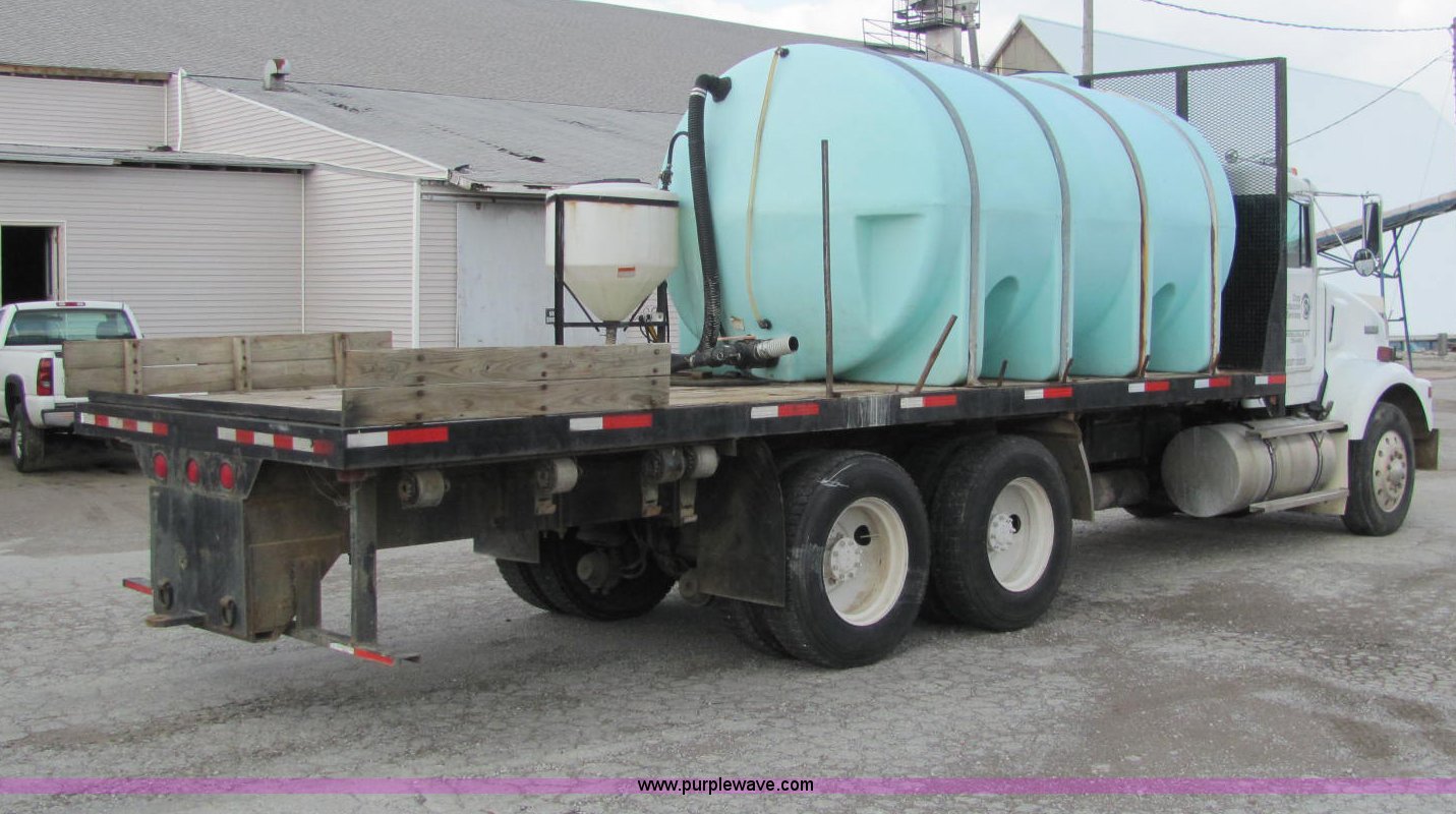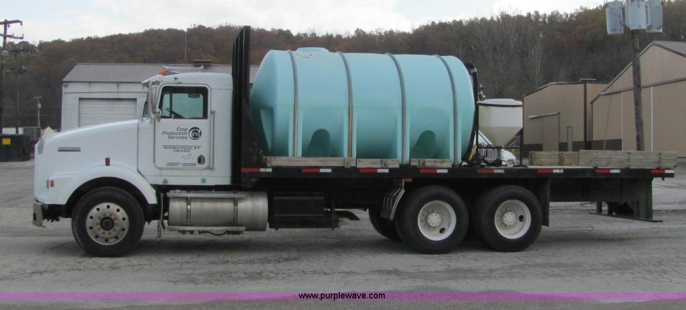 1994 Kenworth T8000 flatbed truck. 937,927 miles on odometer, Cummins N14-410 14.0L L6 diesel engine, Eaton Fuller manual transmission, AC and heat, AM/FM/cassette, Cruise, Heated mirrors, Idle control, Visor, Block heater, Dual 120 gallon fuel tanks, Air suspension, Air brakes, Jake brake, 24'L x 8'W flatbed Steel frame with wood decking, 3,200 gallon poly tank 3" plumbing, 60 gallon poly feeder tank 2" plumbing, Pin hitch, Trailer wiring, 11R24.5 tires, 228" wheel base, 50,000 lbs GVWR, 12,000 lbs FAWR, 19,000 lbs IAWR, 19,000 lbs RAWR, Unit# 40187. Title distribution may be delayed up to 30 days from verification of funds. 1XKDD69XXRR617234. Shipping quotes available. Crop Production Services Russlleville. 485 Payton St.. Russellville, KY 42276