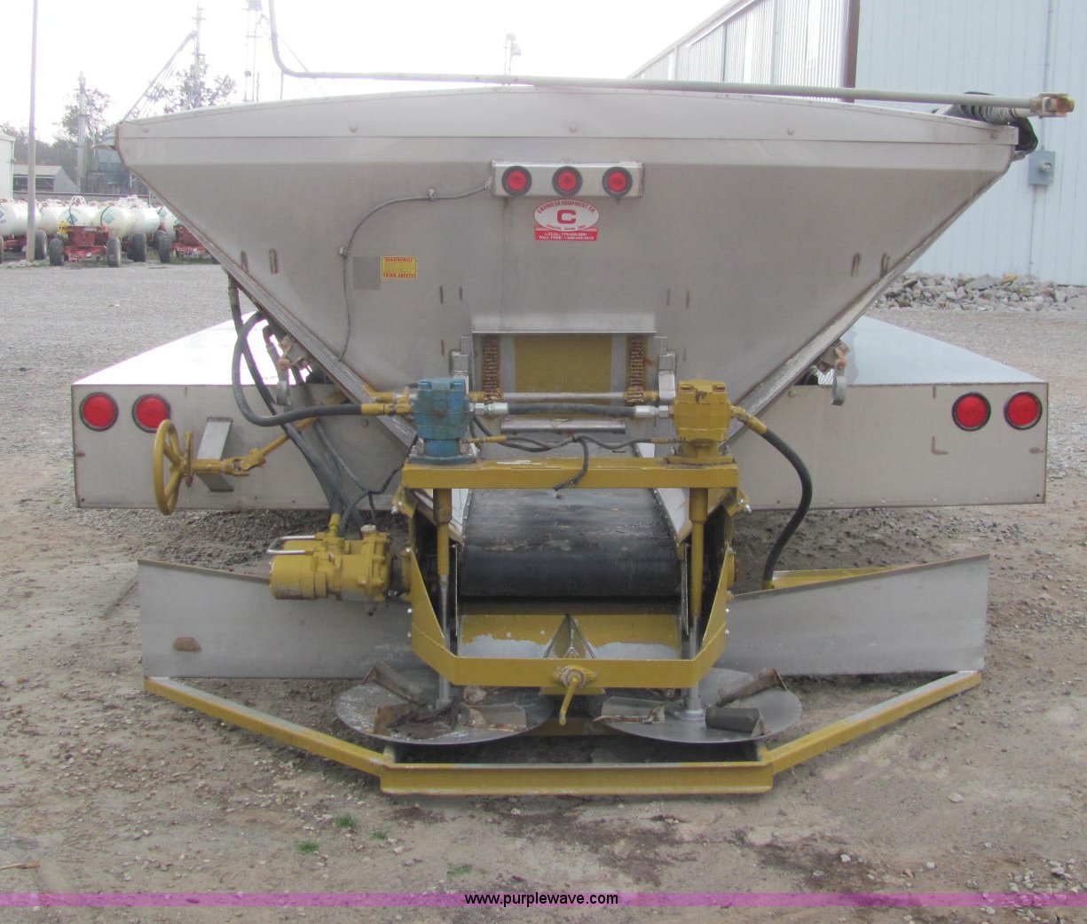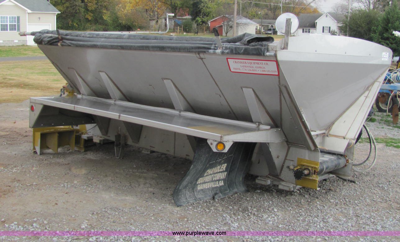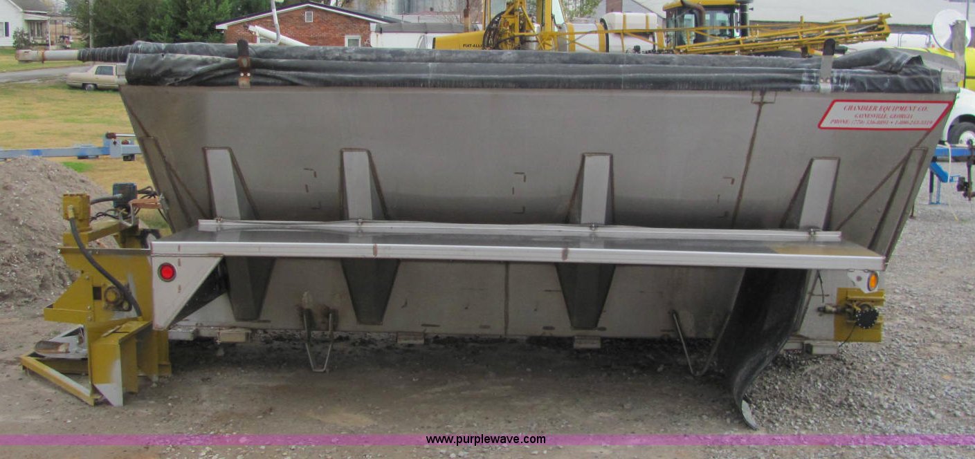 Purple Wave is selling a used Fertilizer or Seed Tender in Kentucky. This item is a Chandler 8 ton stainless steel spreader with the following: 13'L x 9'W, Dual spinners, Hydraulic operation, 28" rubber matted conveyor, Manual roll over tarp, Serial 22692