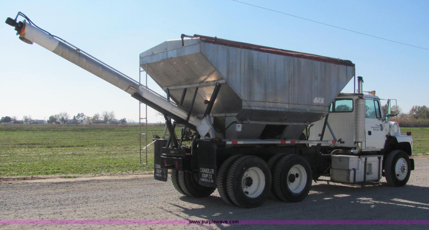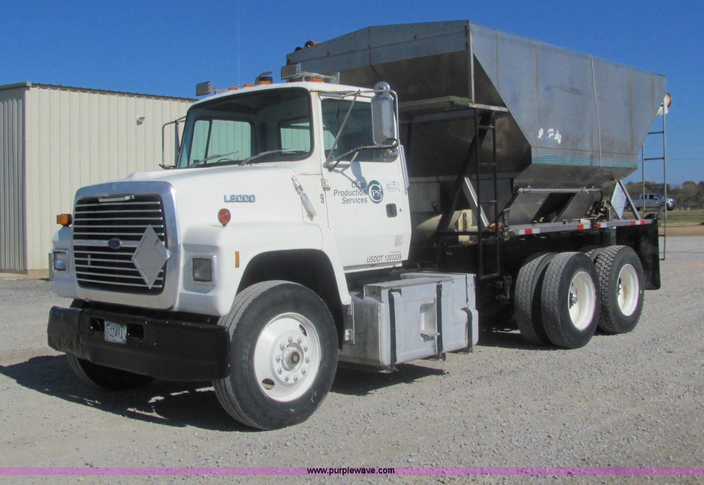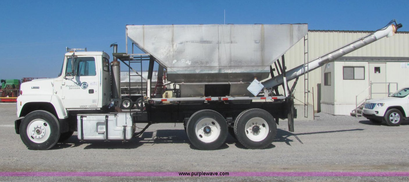 Purple Wave is selling a used Fertilizer or Feed Delivery Truck in Tennessee. This item is a 1992 Ford L9000 fertilizer tender truck with the following: 389,749 miles on odometer, Cummins N14 14.0L L6 diesel engine, 10 speed manual transmission, AC and heat, AM/FM/cassette, Heated mirrors, Locking differential, Throttle lock, Chandler 16'L tender, Single lever hydraulic operation, 10"D auger, (2) access ladders, Manual roll over tarp, Dual 125 gallon fuel tanks, Single rear exhaust stack, PTO, Wet kit, Spring suspension, Air brakes, Brake controller, Fifth wheel lock, Receiver hitch, 11R24.5 tires, 204" wheel base, 52,000 lbs GVWR, 12,000 lbs FAWR, 20,000 lbs IAWR, 20,000 lbs RAWR, Unit# 45853