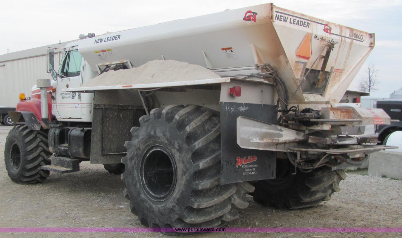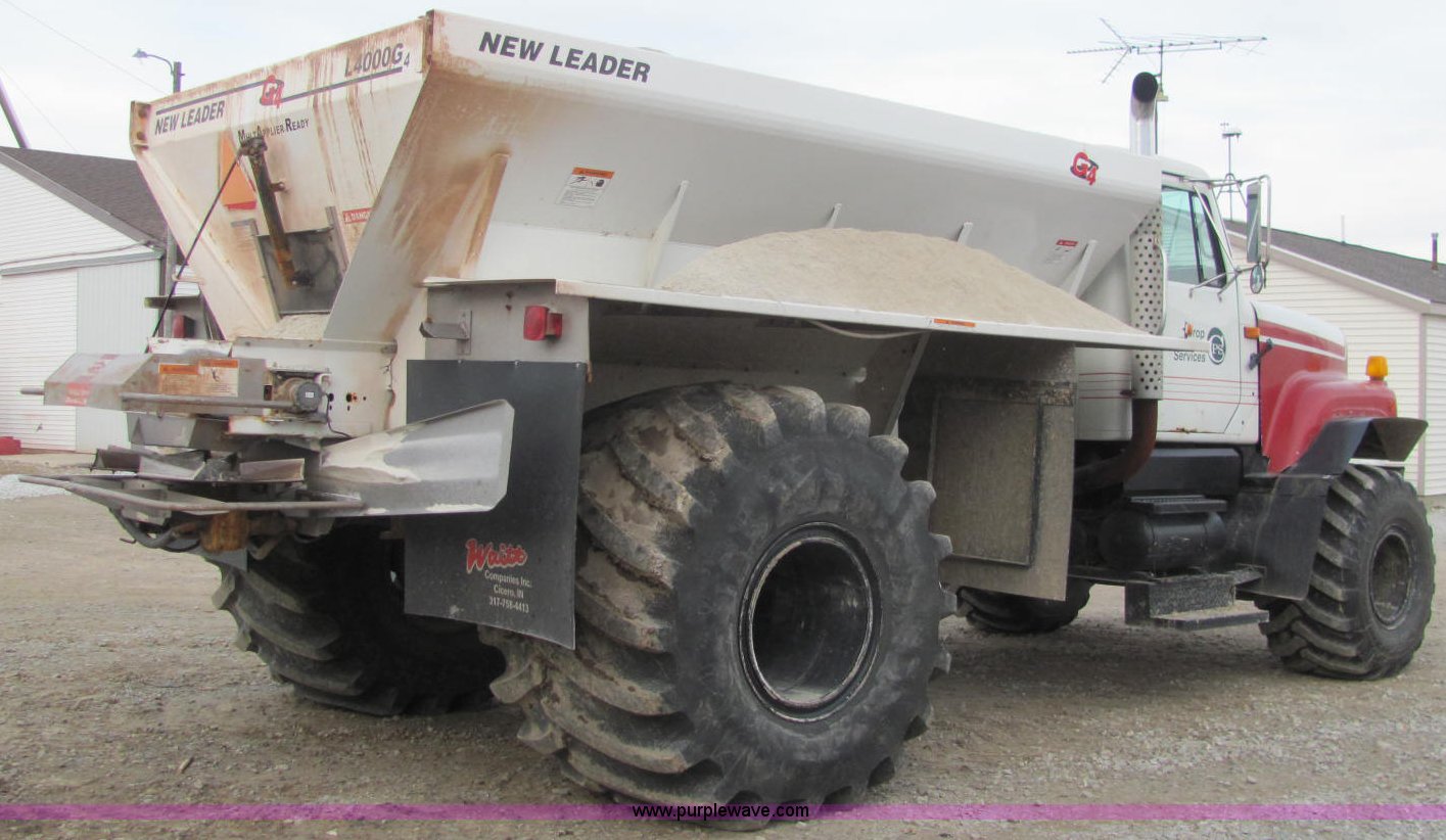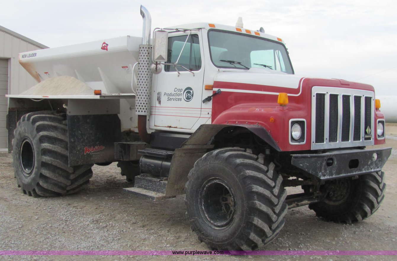 Purple Wave is selling a used Applicator Truck in Indiana. This item is a 1995 International 2554 spreader truck with the following: 69,163 miles on odometer, 4,625 hours on meter, Miles and hours may vary, International DT466 7.6L L6 diesel engine, Engine is bad, Eaton Fuller 10 speed manual transmission, Heat, AM/FM, Throttle lock, Block heater, 100 gallon fuel tank, Single rear exhaust stack, PTO, Wet kit, New Leader L4000 G4 spreader bed, Model 14000-13, 13'L x 8'W, Dual spinners, 24"W conveyor, Serial 129485, Front tow hooks, Air brakes, 192" wheelbase, 48 x 25.00-25NHS front tires, 66 x 43.00-25 rear tires, Engine is bad