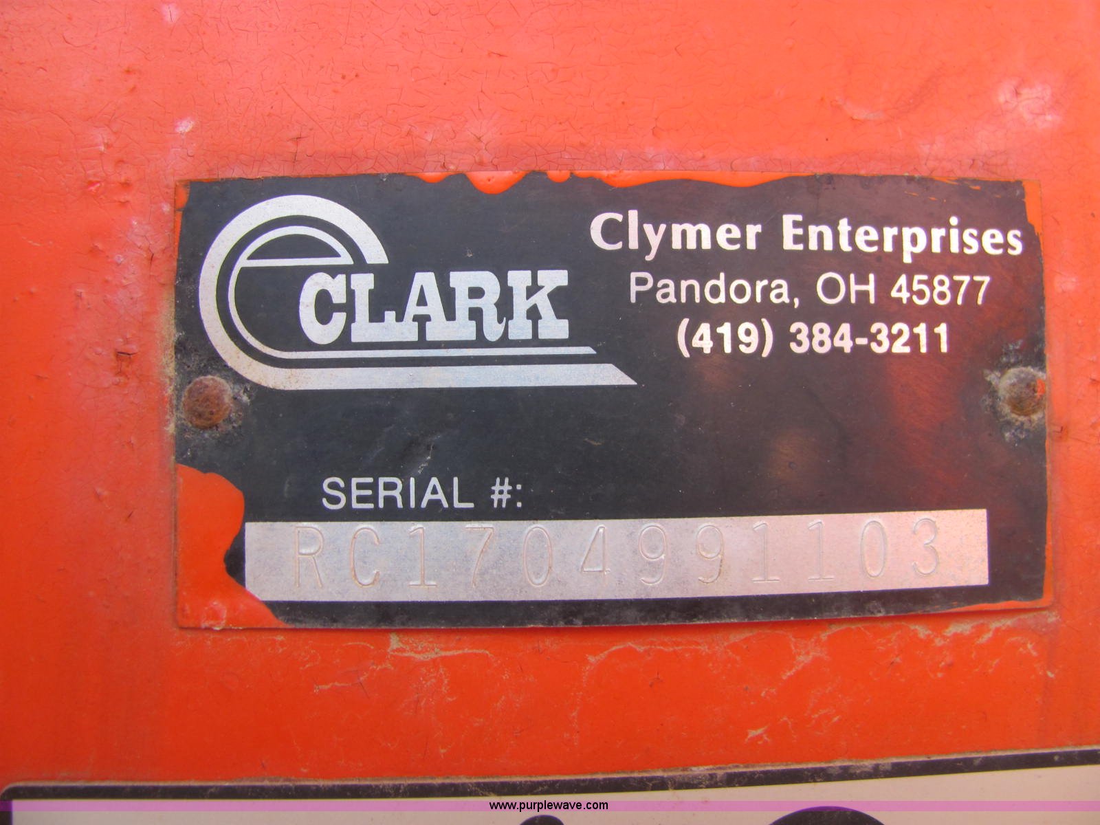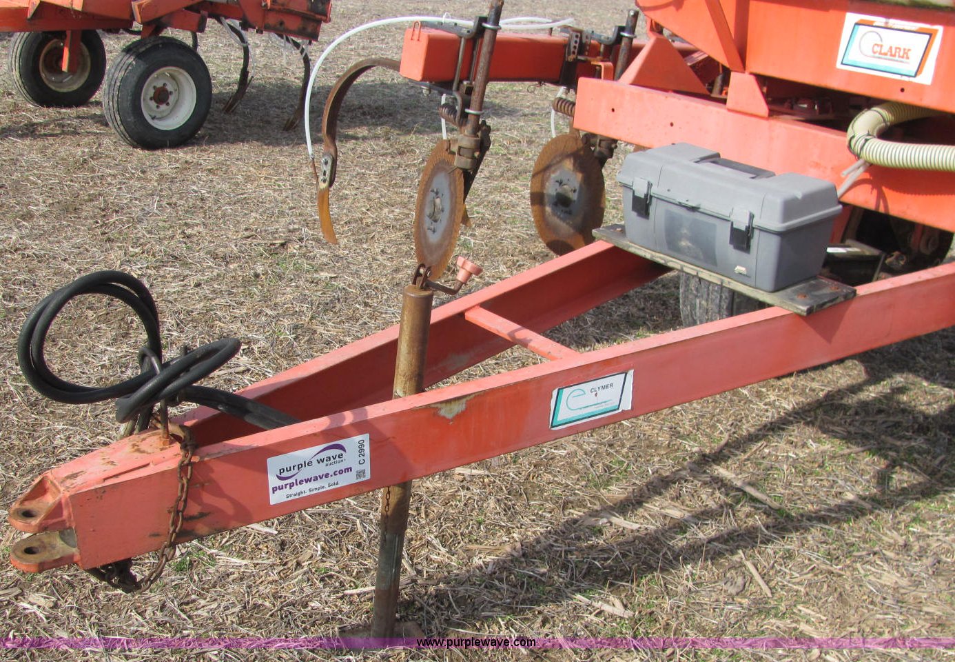 Purple Wave is selling a used Applicator Pull Type in Indiana. This item is a Clark ammonia applicator with the following: (9) 20" spring loaded knives, 750 gallon poly tank, John Blue pump, 30" spacing, 2" plumbing, Hydraulic lift, Manual fold, Pin hitch, 12.5L-15SL tires, Serial RC170R991103, Unit# 50851