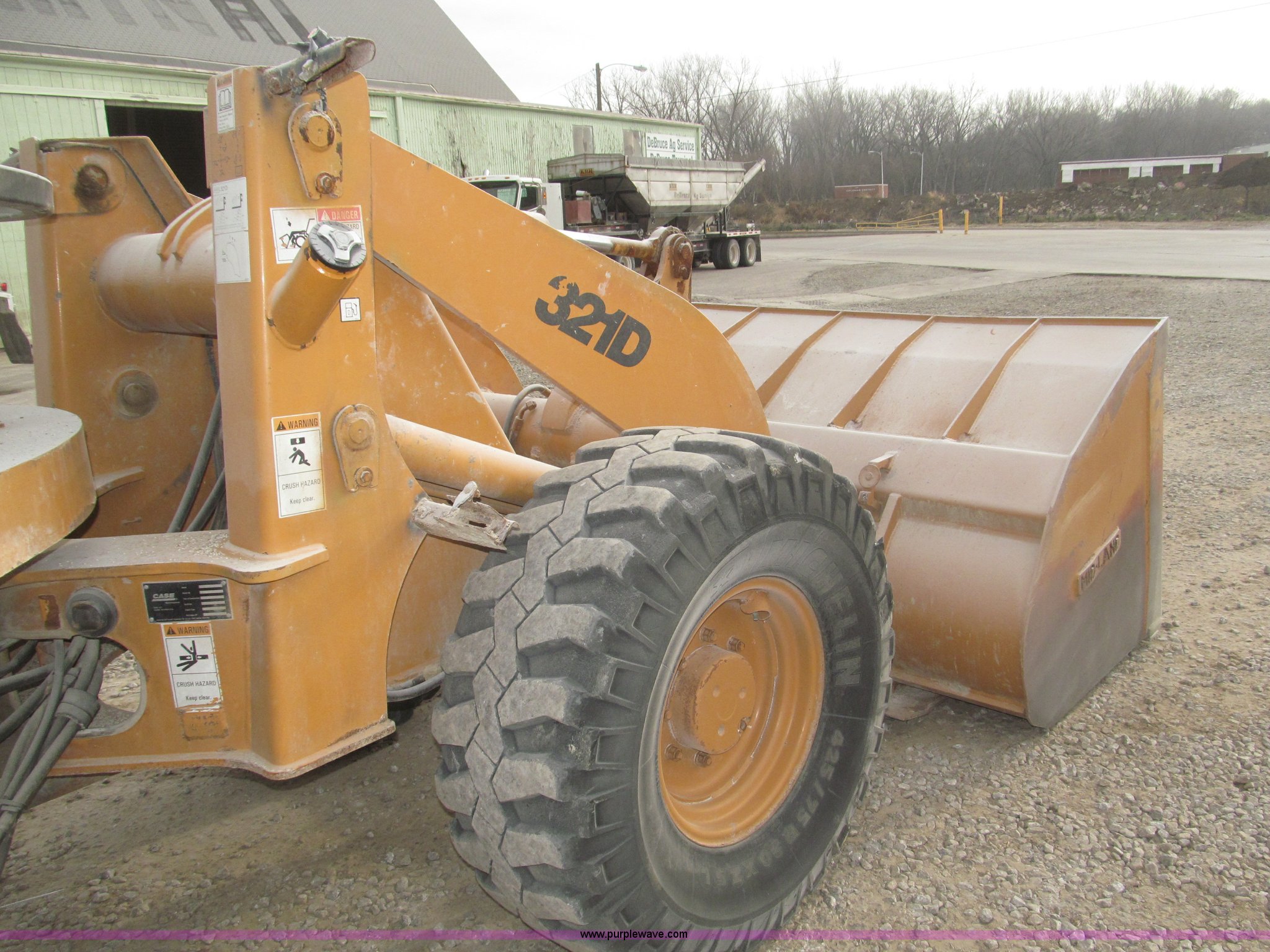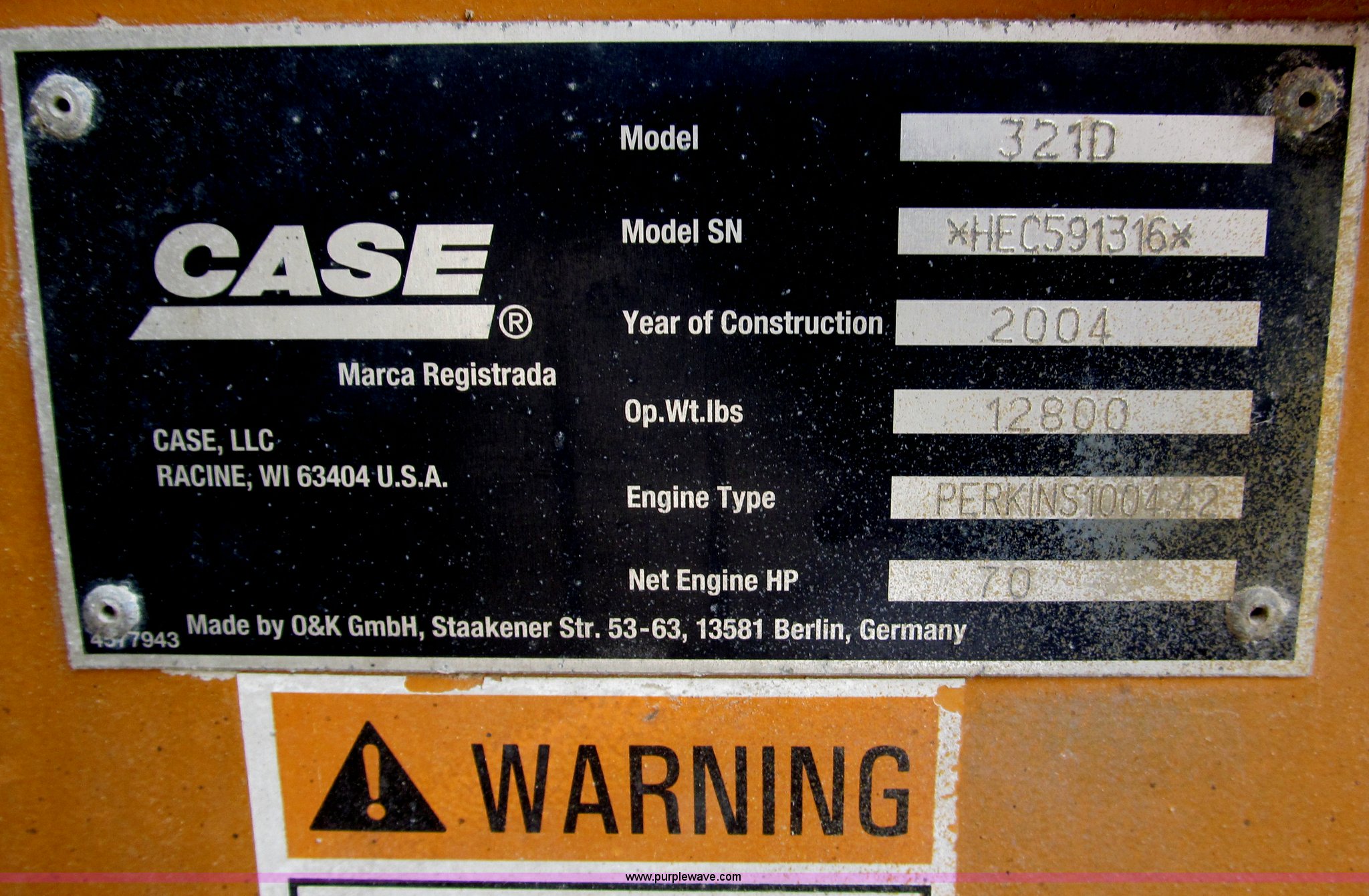 Purple Wave is selling a used Wheel Loader in Nebraska. This item is a 2004 Case 321D articulated wheel loader with the following: 3,376 hours on meter, Perkins four cylinder diesel engine, Model 1004.42, 70 HP, Hydrostatic transmission, Four wheel drive, ROPS/FOPS, Serial 933C51007304, Spring suspension seat, Midland light material bucket, Case quick attach, Joystick loader control, 15,921 lbs break out force, 9,496 lbs straight tipping load, 7,728 lbs full turn tipping load, EZ5L 425/75R20 tires, 12,800 lbs. base operating weight, No guard pulley over belts, Issue with front end, Four wheel drive is not consistent, Serial HEC591316