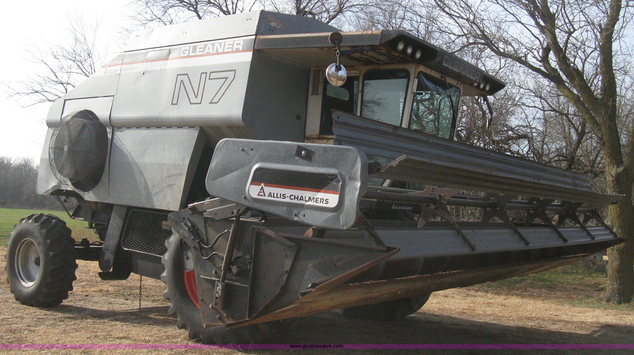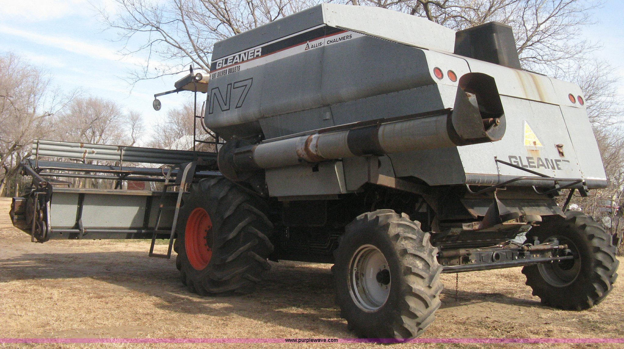 Purple Wave is selling a used Combine in Kansas. This item is a 1979 Gleaner N7 combine with header with the following: 1,602 engine hours on meter, 1,300 separator hours on meter, Six cylinder diesel engine, Three speed hydrostatic transmission, Enclosed cab, AC and heat, Suspension seat, Work lights, 315 bushel hopper capacity, 12" unloading auger, Broadcast straw spreader, (2) grain loss monitor sensors, AC 24' header, Serial N-G09471R82, 30.5L-32 front tires, Armstrong 16.9-24 rear tires, Serial N7G01030H