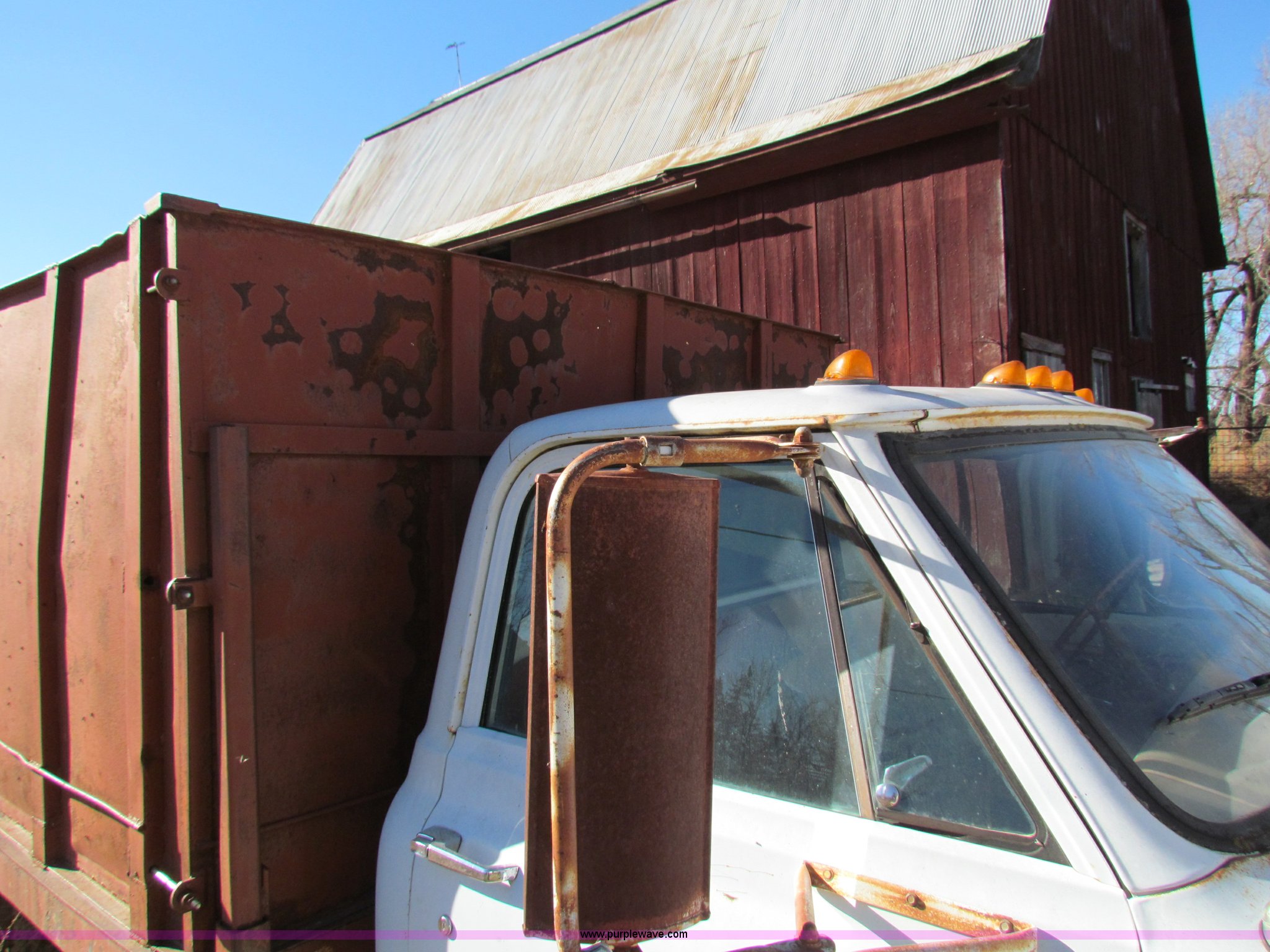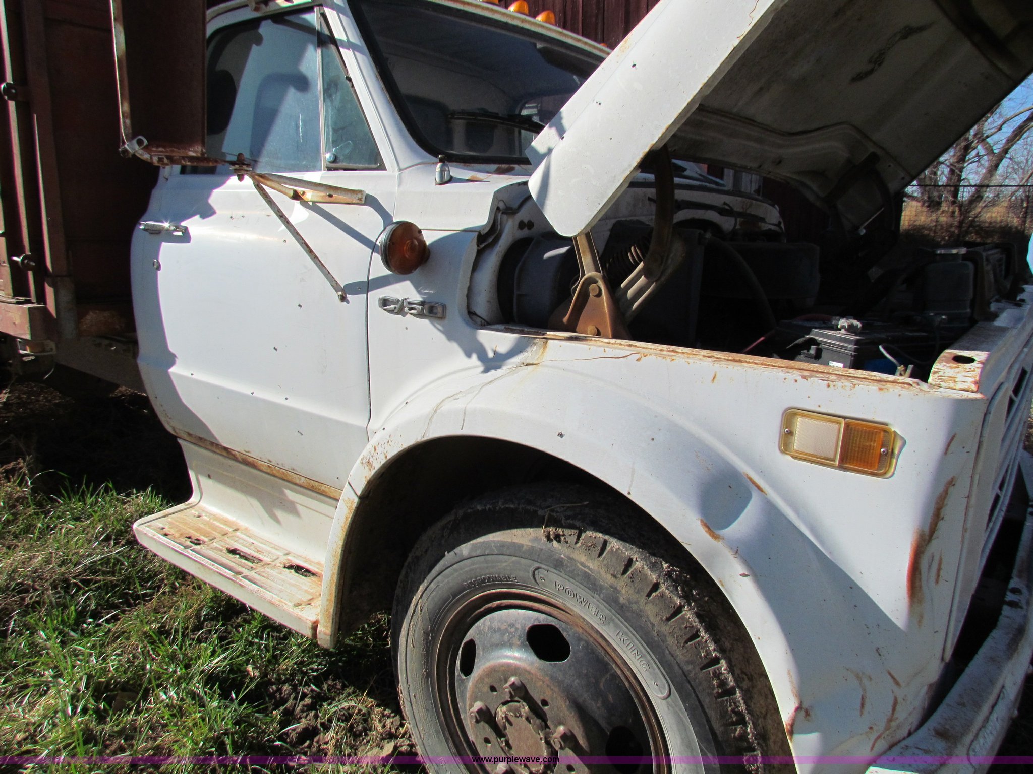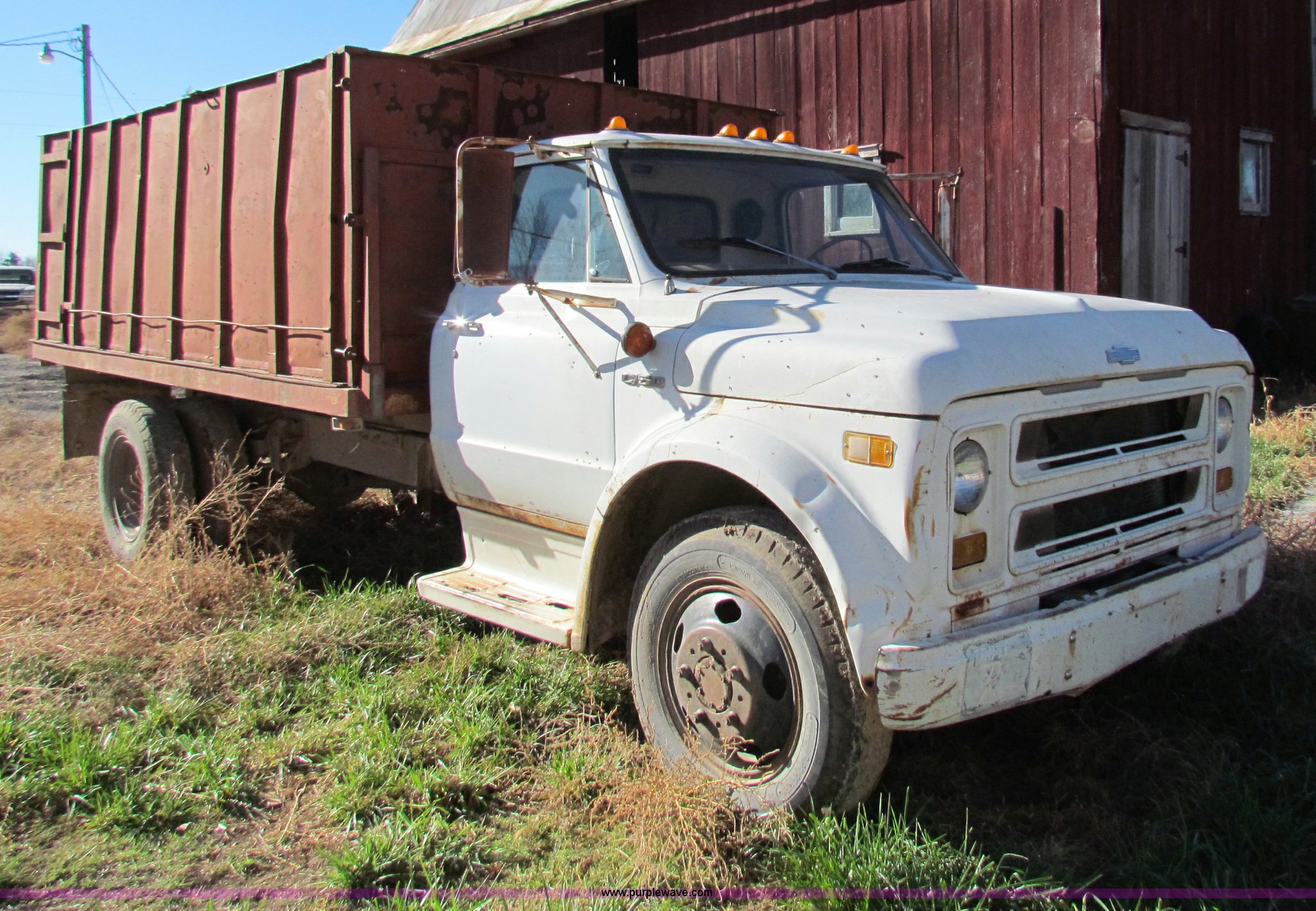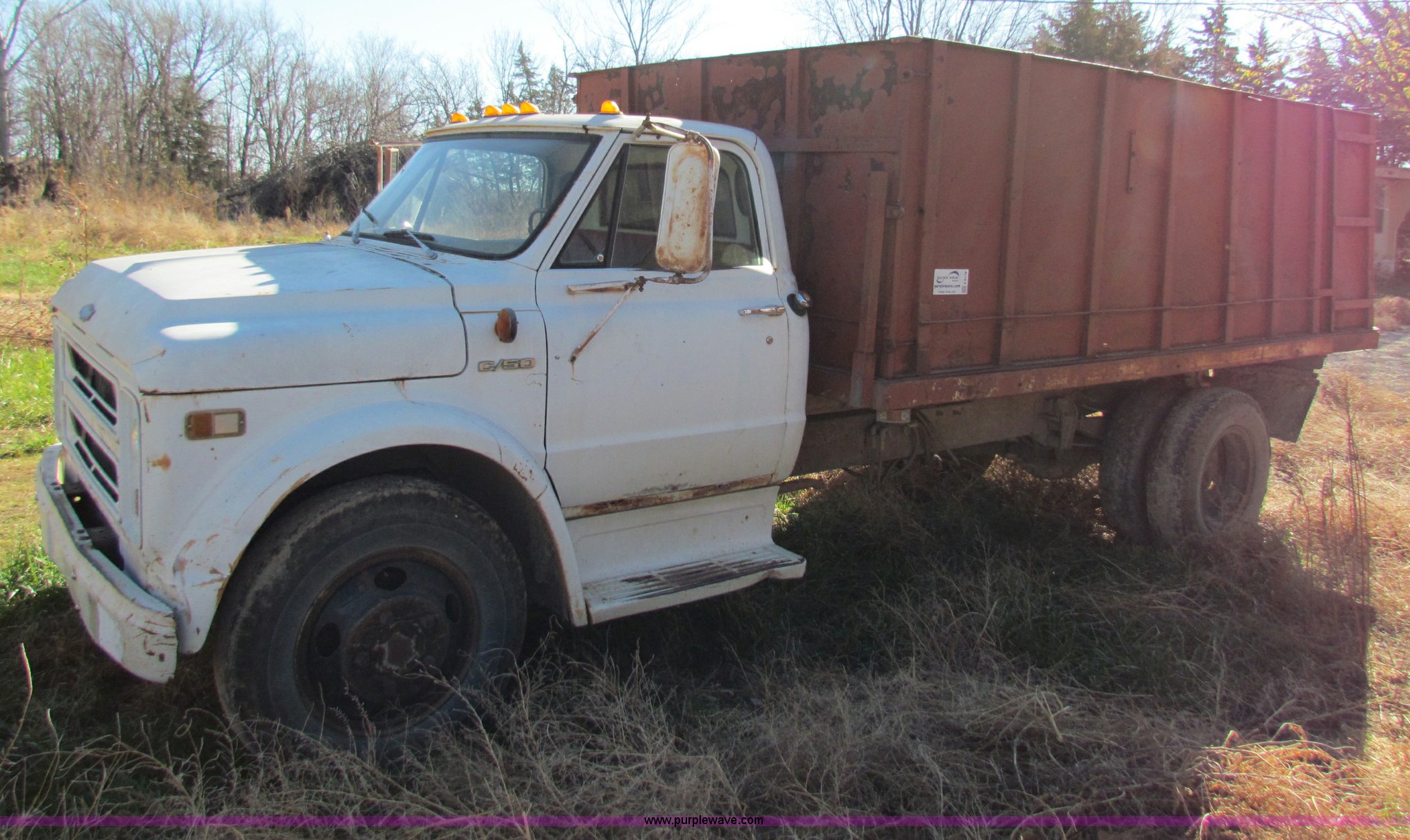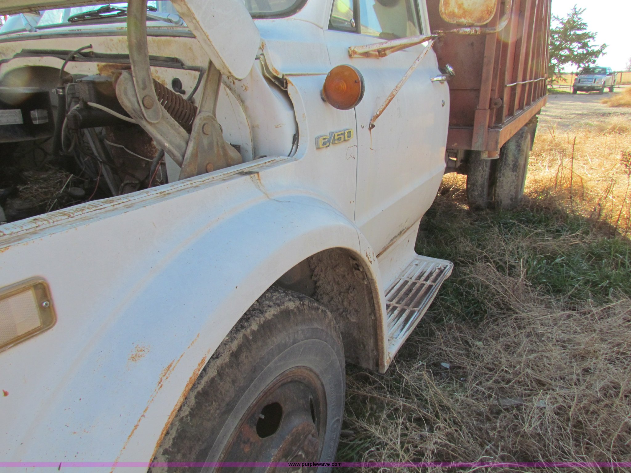 Purple Wave is selling a used Grain Truck in Kansas. This item is a 1972 Chevrolet C50 truck with the following: 43,435 miles on odometer, 350 CID V8 gas engine, Five speed manual transmission, Two speed rear end, Chelsea PTO, Steel dump bed, Hoist, Rear hydraulic remote, 8.25-20 tires, Recently replaced battery, Brakes need bled