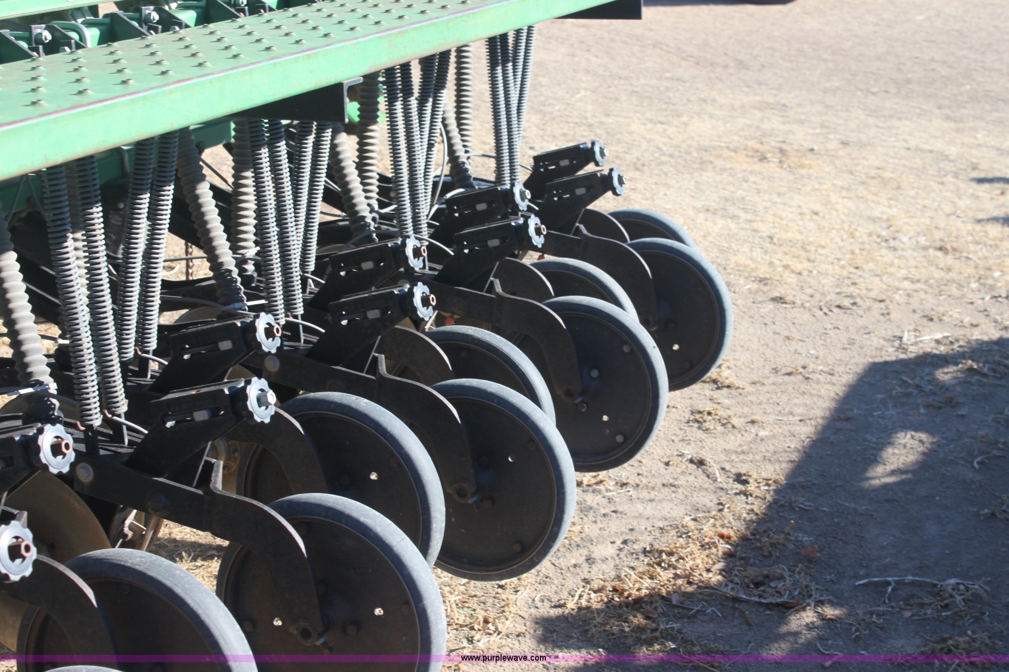 Purple Wave is selling a used Grain Drill or Seeder in Kansas. This item is a Great Plains Solid Stand 24' drill with the following: Model 2810870131, 10" spacing, 2" x 12" press wheels, 12" blades, Setup for fertilizer, 300 gallon tank, Diaphragm pump, Set for eight gallon per acre, Disk blades and chains replaced two years ago, Stainless steel chain