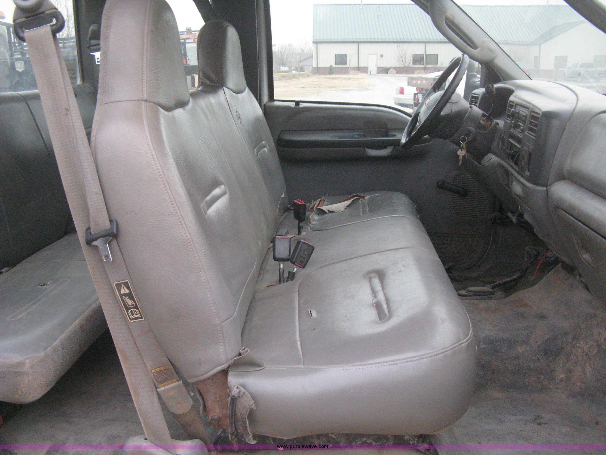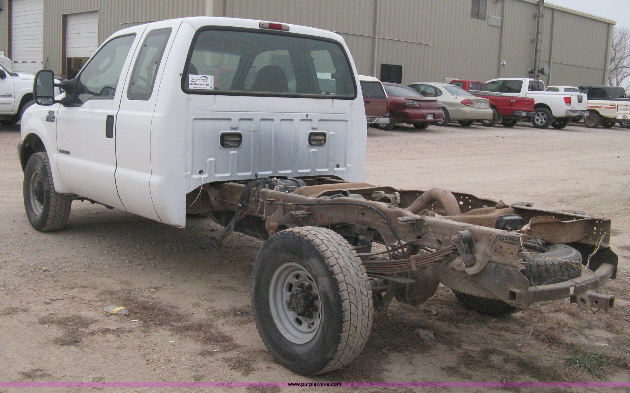 Purple Wave is selling a used Passenger Vehicle in Kansas. This item is a 2003 Ford F250 Super Duty XL cab and chassis with the following: 275,035 miles on odometer, 7.3L V8 OHV 16V turbo diesel engine, Automatic transmission, Four wheel drive, AC and heat, Tilt, Cruise, AM/FM/cassette, Manual windows and locks, Vinyl interior, Rear bench seat, LT265/75R16 tires, 55.5" from cab to center of rear axle, Interior cosmetic damage, Unit NT39