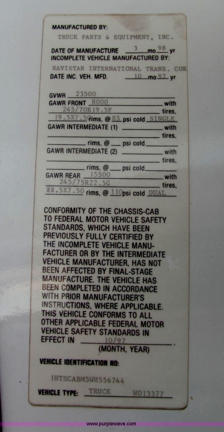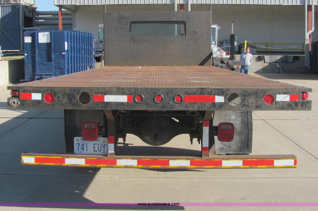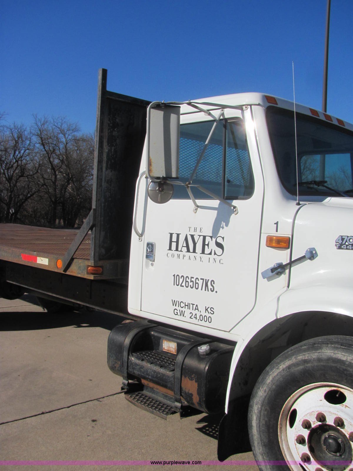 Purple Wave is selling a used Flat Bed Truck in Kansas. This item is a 1998 International 4700 semi truck with the following: 51,773 miles on odometer, International T444E 7.3L V8 diesel engine, Spicer five speed manual transmission, AC and heat, Cruise, AM/FM, 20'L x 96"W dump bed, All steel design, Dual ram, Single stage, Block heater, 55 gallon fuel tank, PTO, Wet kit, Air brakes, Spring suspension, 218" wheel base, 10R22.5 tires, 23,500 lbs GVWR, 8,000 lbs FAWR, 15,500 lbs RAWR