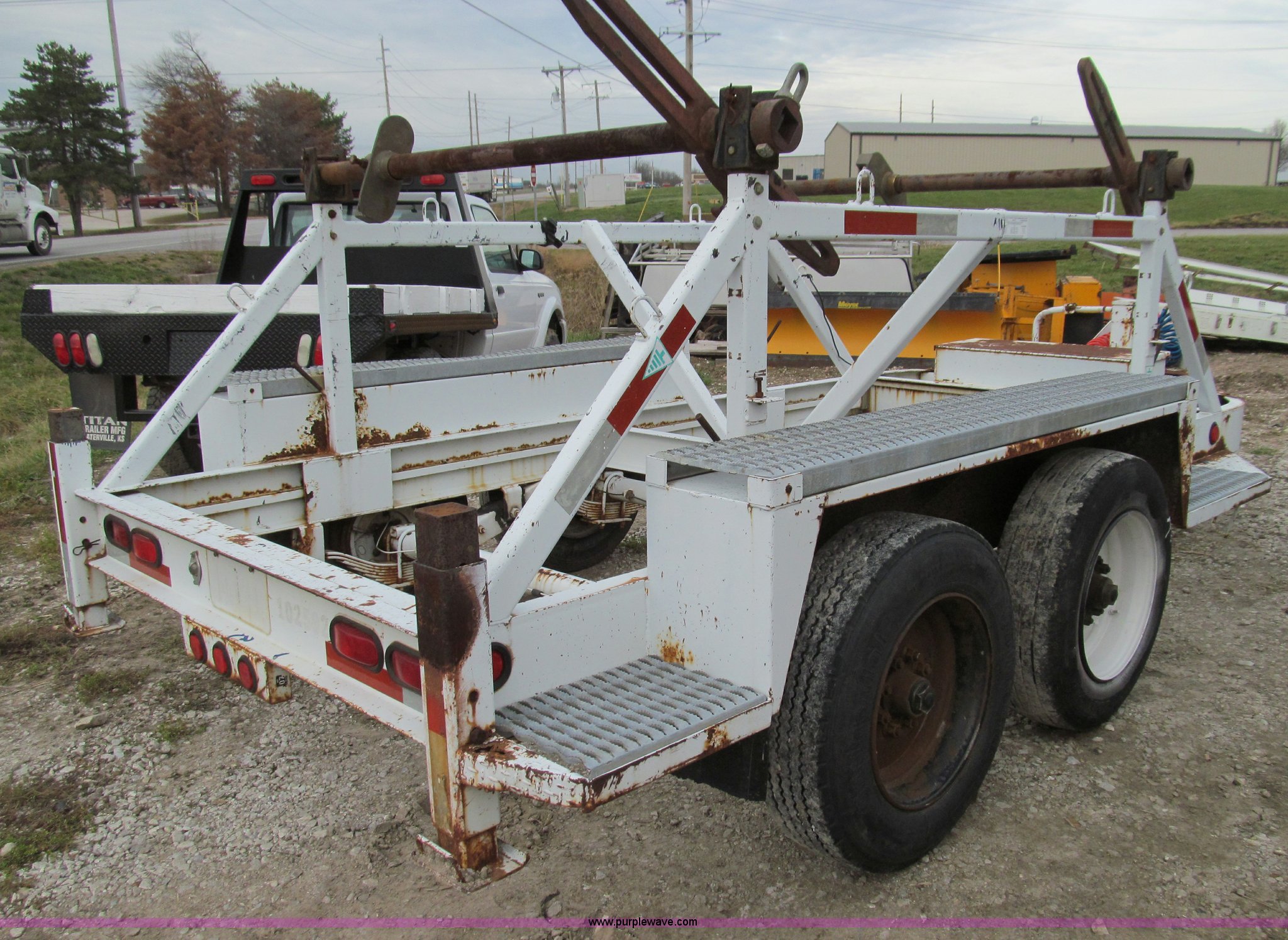 Purple Wave is selling a used Reel Trailer in Missouri. This item is a 1995 Keifer Built reel trailer with the following: (2) 5' spools of cable capacity, Galvanized expanded metal side deck, Air over hydraulic brakes, Pintle hitch, Front storage compartment, (2) rear stabilizer stands, 215/75R15 tires, 16,000 lbs GVWR, 8,000 lbs oil bath axles